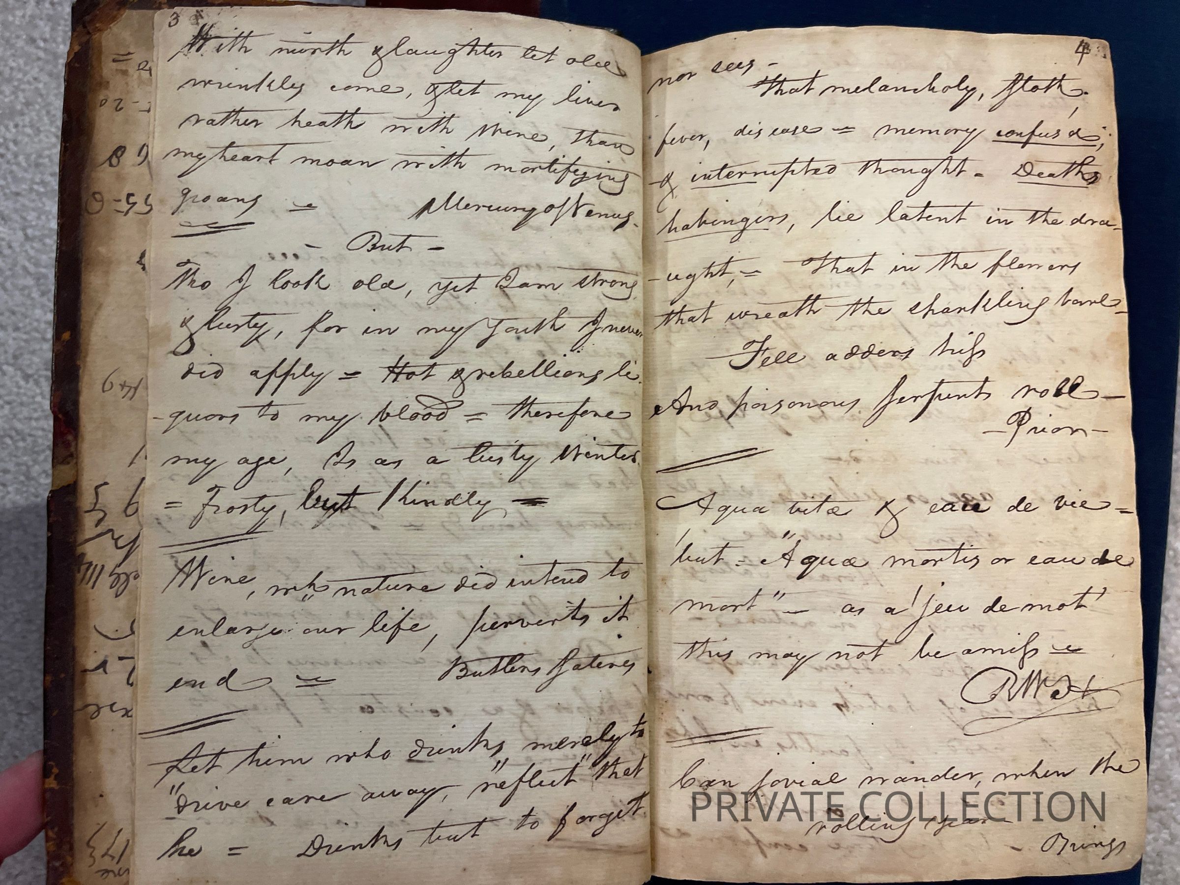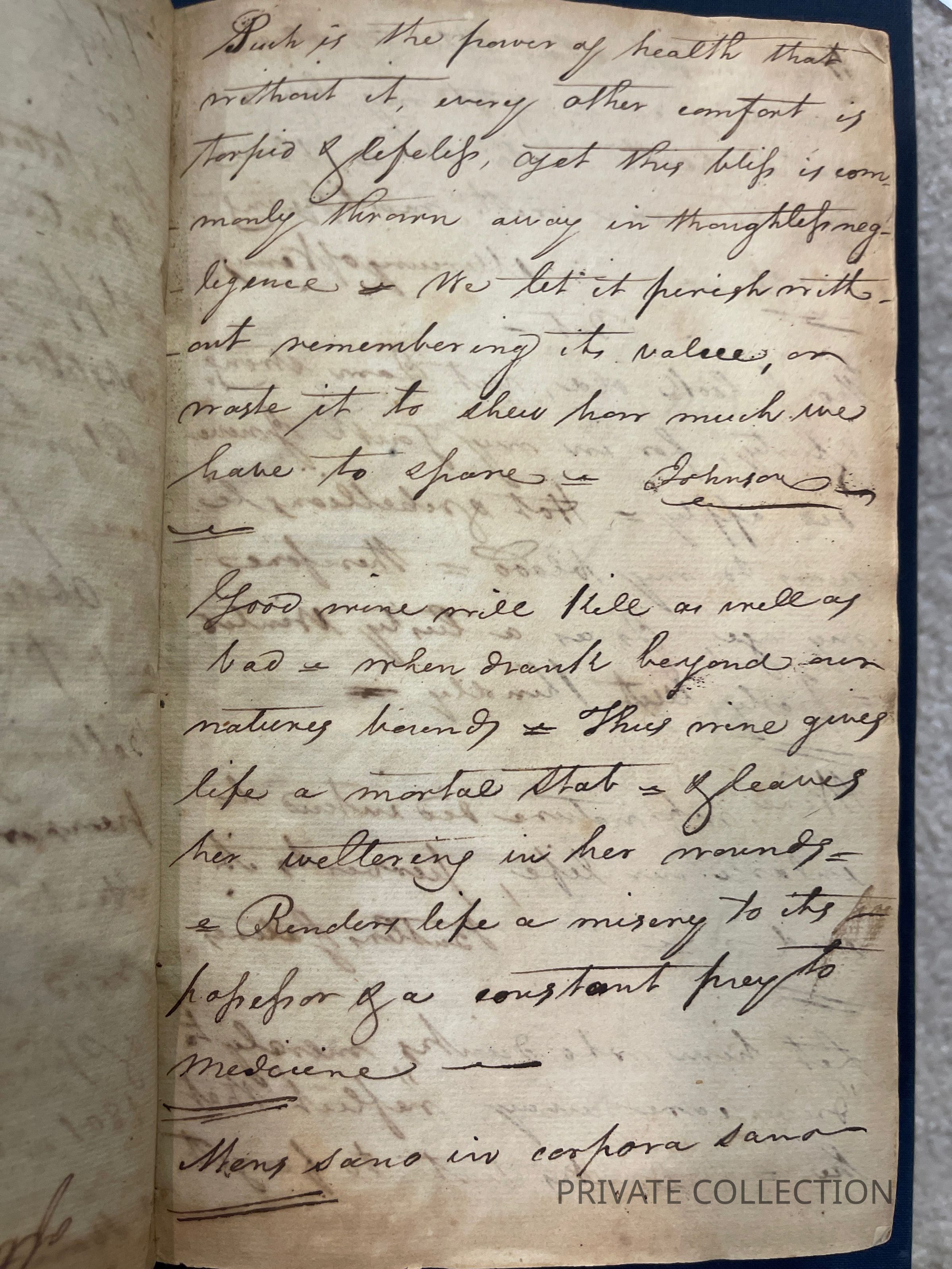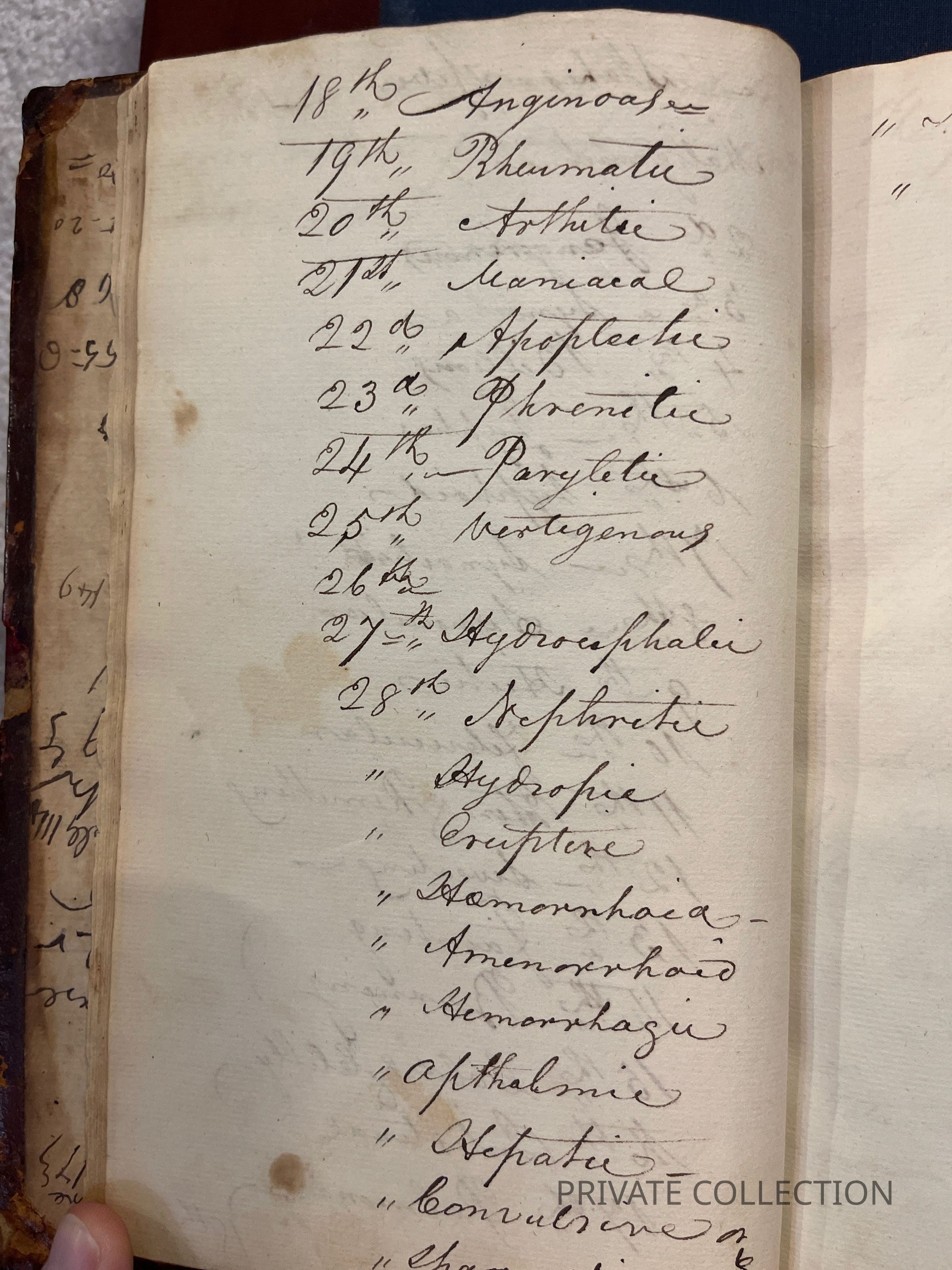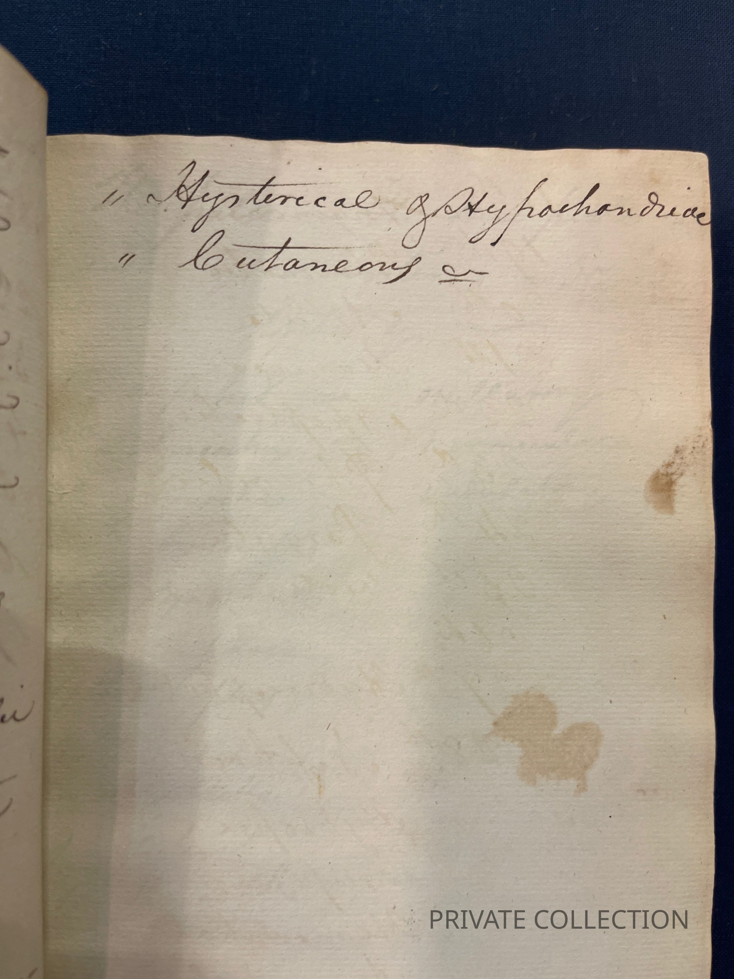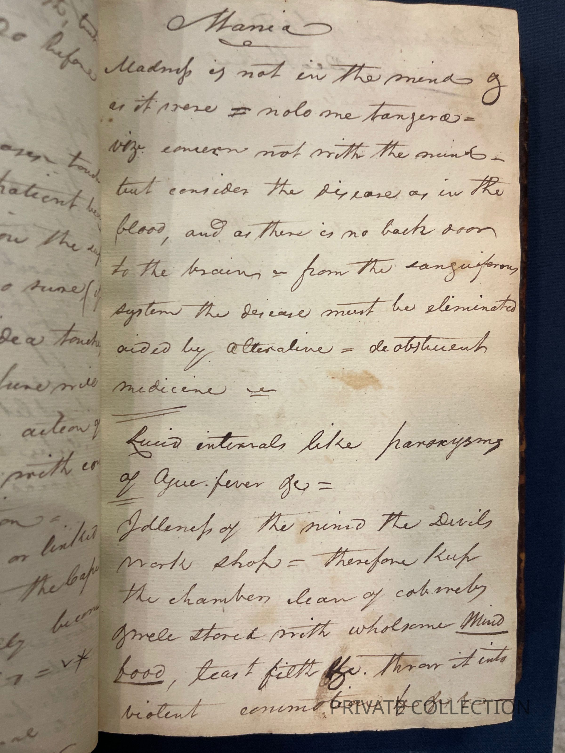 Bound With: “Manuscript Notes of Rice W. Hood (RWH), a private student of Rush’s who continued correspondance with Rush for several years afterwards. (2 letters from Hood to Rush in Libreary Company of PA) “Useful Hints collected from Doctor Rush’s Lectures on the Institutes of Medicine & Animal Practice and Doctor Wistar and Doctor Shippen on Anatomy, Surgery, and Obstetricy, Doctor Woodhouse on Chemistry, Dr. Physic on Chirugial practice and care, Doctor Delbees on Obstetricy, also from the attenand physicians to the Hospital, Bettering HOuse, Prison and Dispensary in Philadelphia with hints taken from different authors read there in the fall, winter and spring - commencing in Novermber 1801 and ending in April 1802”- a fascinating and unique multi-page manuscript filled with the authors lecture notes, self-pontifications, poetry, and other medical tidbits.Condition