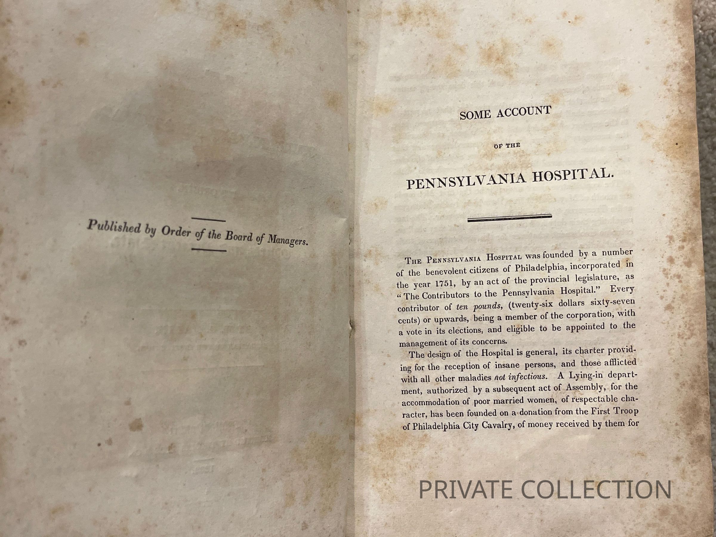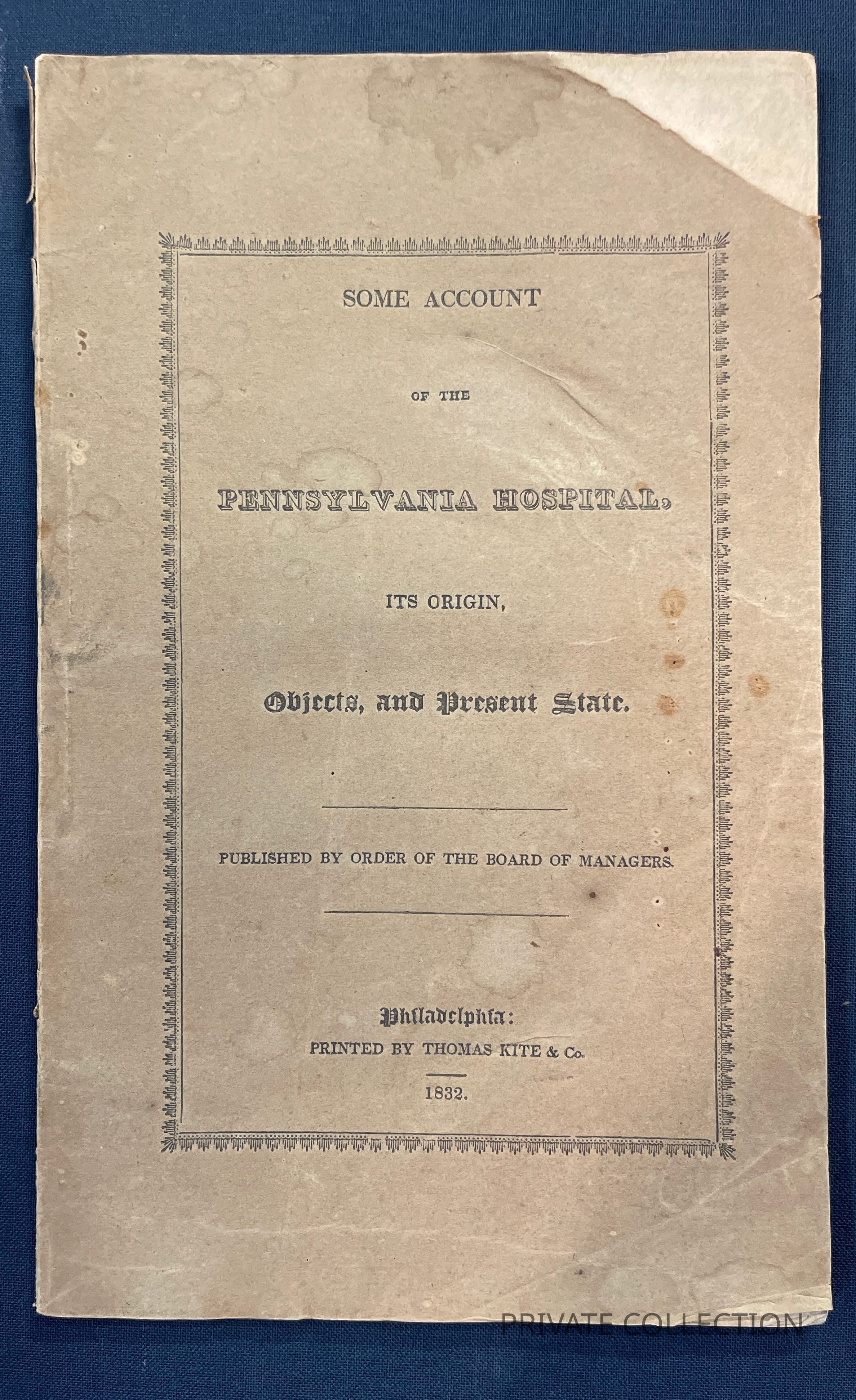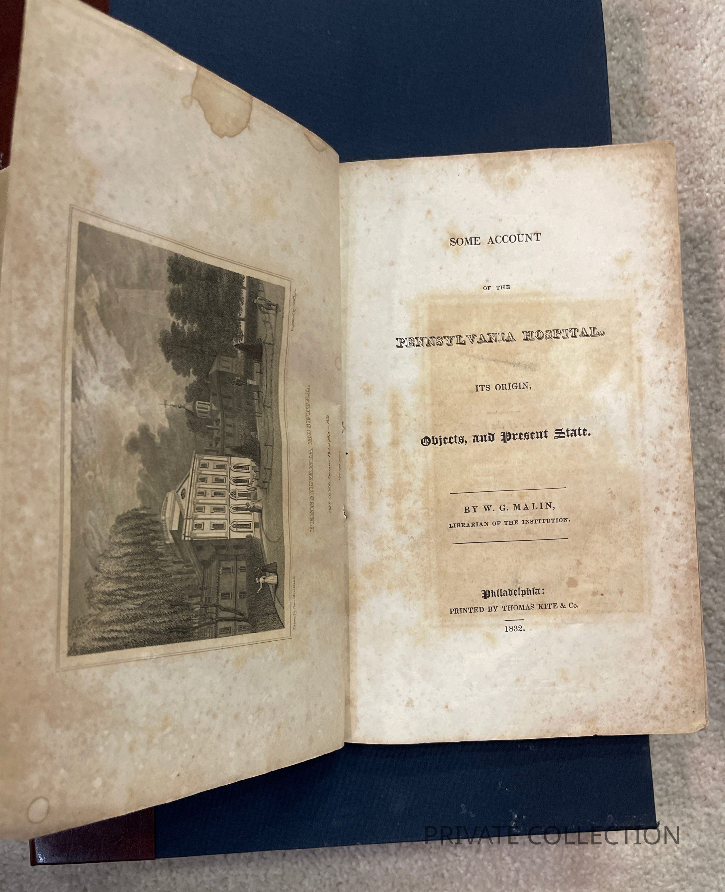 (PHILADELPHIA). MALIN, W.G. Some Account of the Pennsylvania Hospital, Its Origin, Objects, and Present State. Phila.: Thomas Kite, 1832. Frontis. engraving by Childs. 46pp. Scarce.Condition