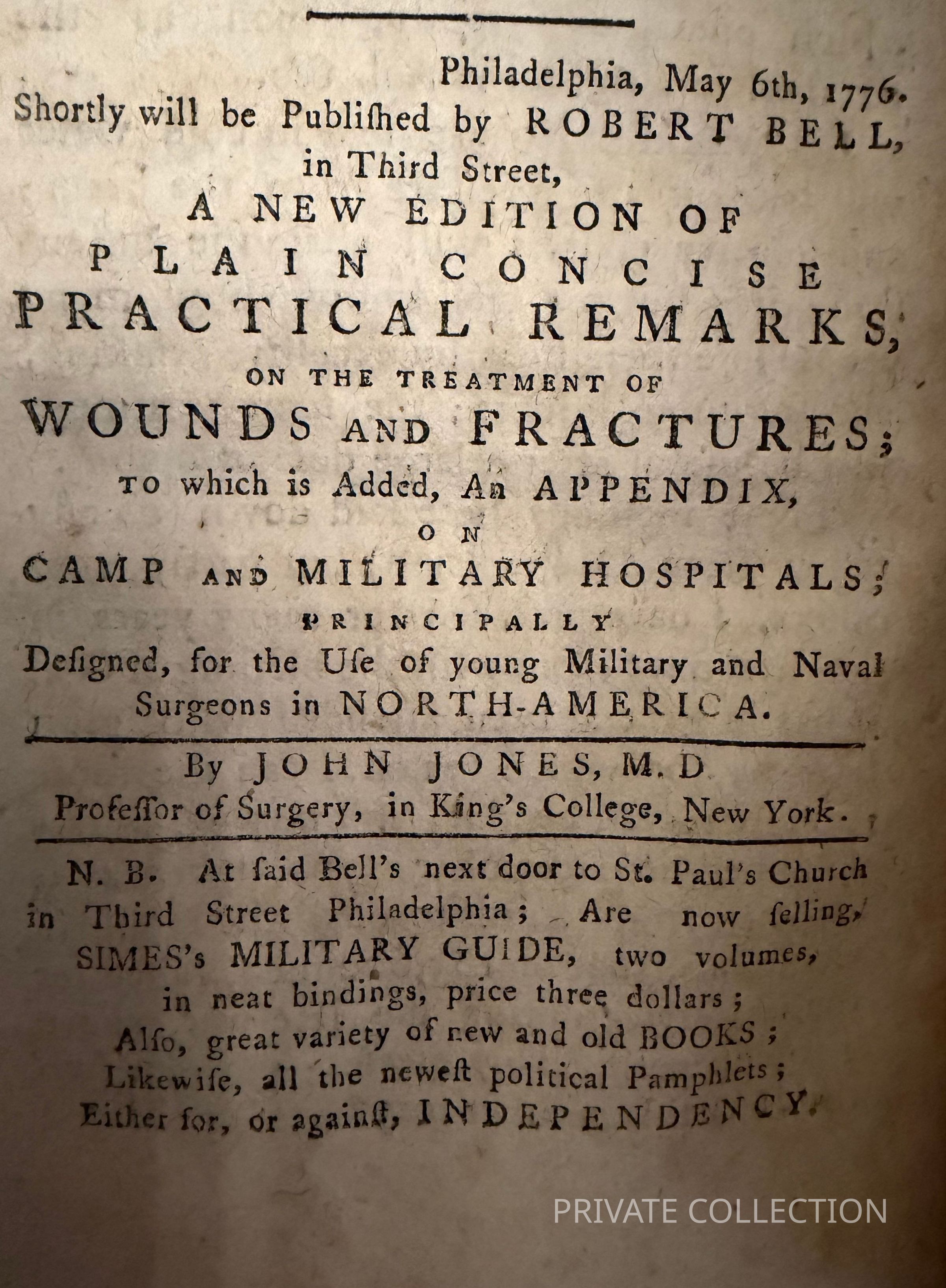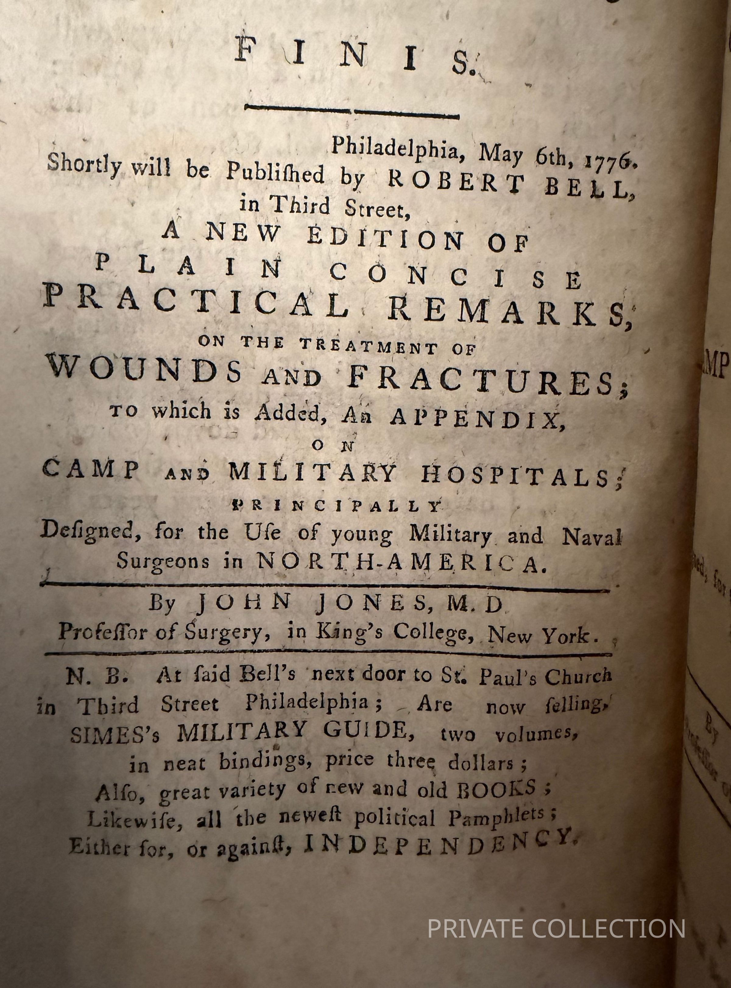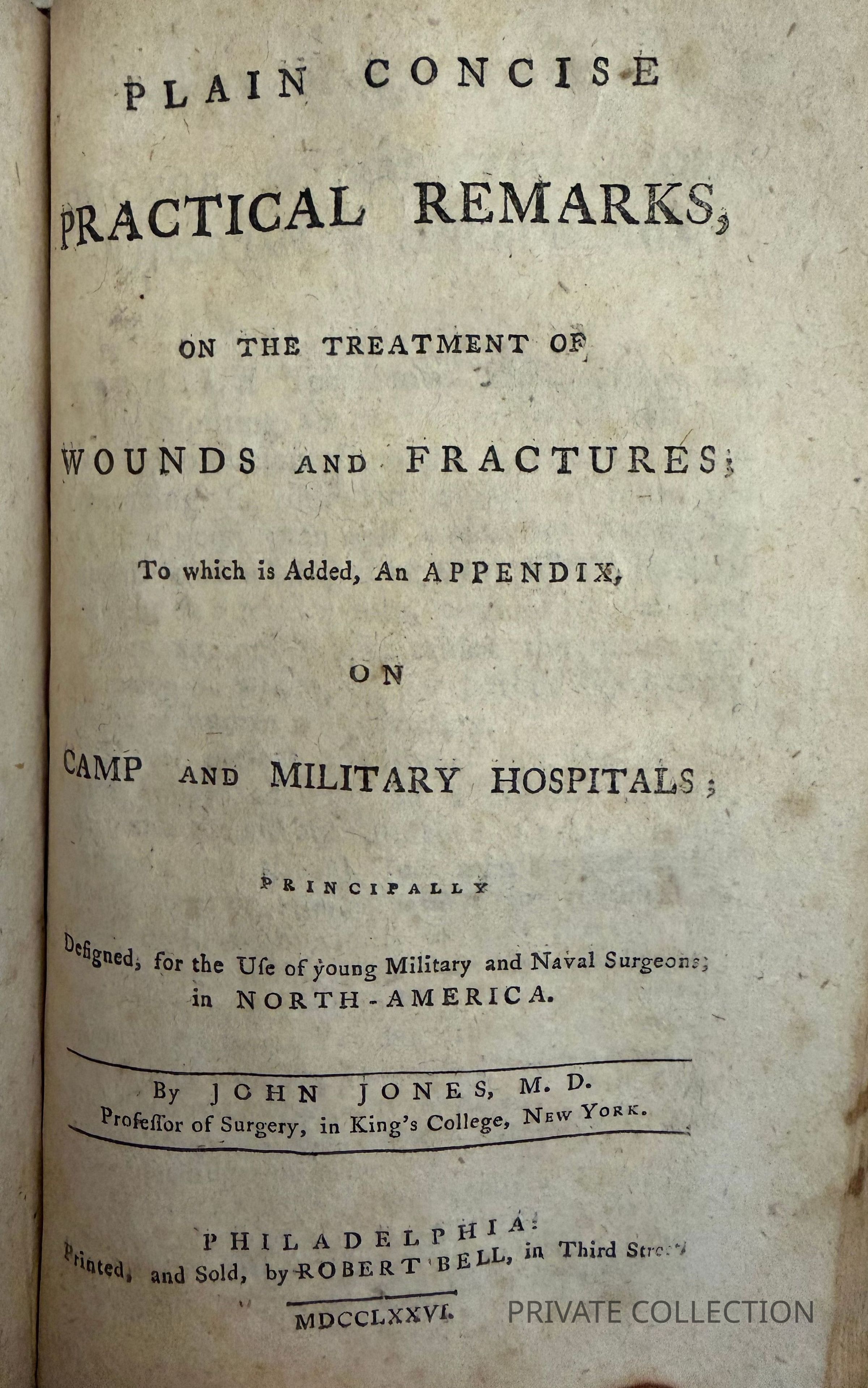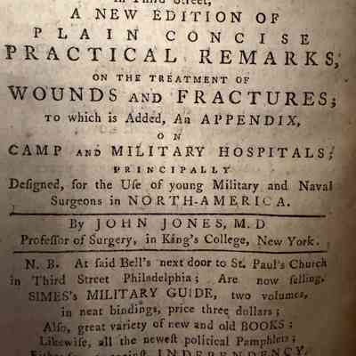https://www.bonhams.com/auction/31200/lot/88/revolutionary-war-jones-john-1729-1791-plain-concise-practical-remarks-on-the-treatment-of-wounds-and-fractures-philadelphia-robert-bell-1776-bound-after-swieten-gerard-lb-freiherr-van-1700-1772-the-diseases-incident-to-armies-with-the-method-of-cure/