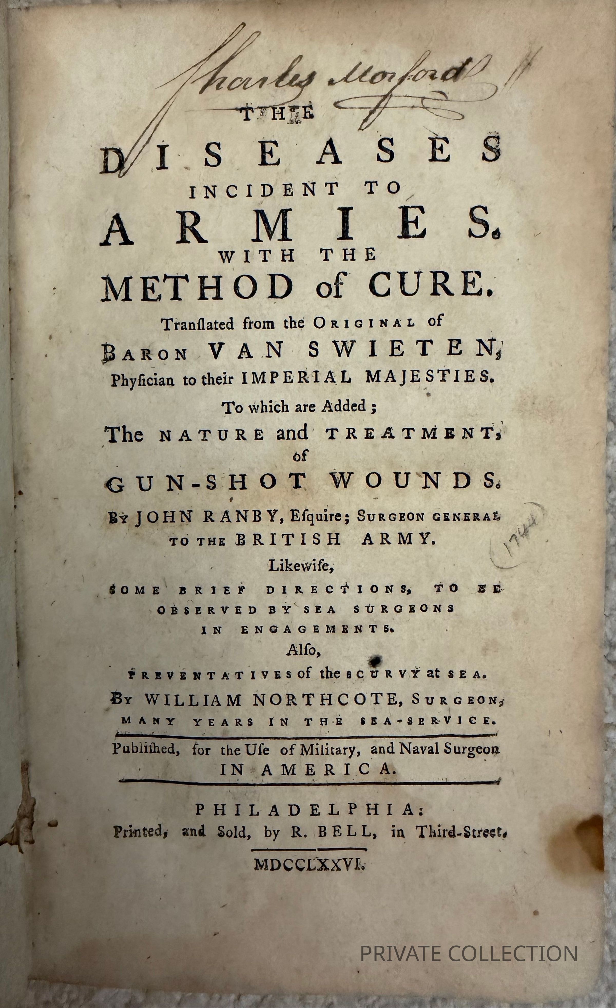 Van Swieten's work offers treatments for a variety of diseases incidental to military conflict, including vomiting, dysentery, diarrhea, gangrene, fever, and much more. The rest of the text, which begins with a separate title-page following page 112, contains works by British physicians Northcote and Ranby on the treatment of gunshot wounds and instructions for naval surgeons. A note on the final text leaf, dated May 6, 1776, promotes "all the newest political pamphlets; either for, or against, Independency" published by Bell. A Boston edition of the entire work appeared the following year.
