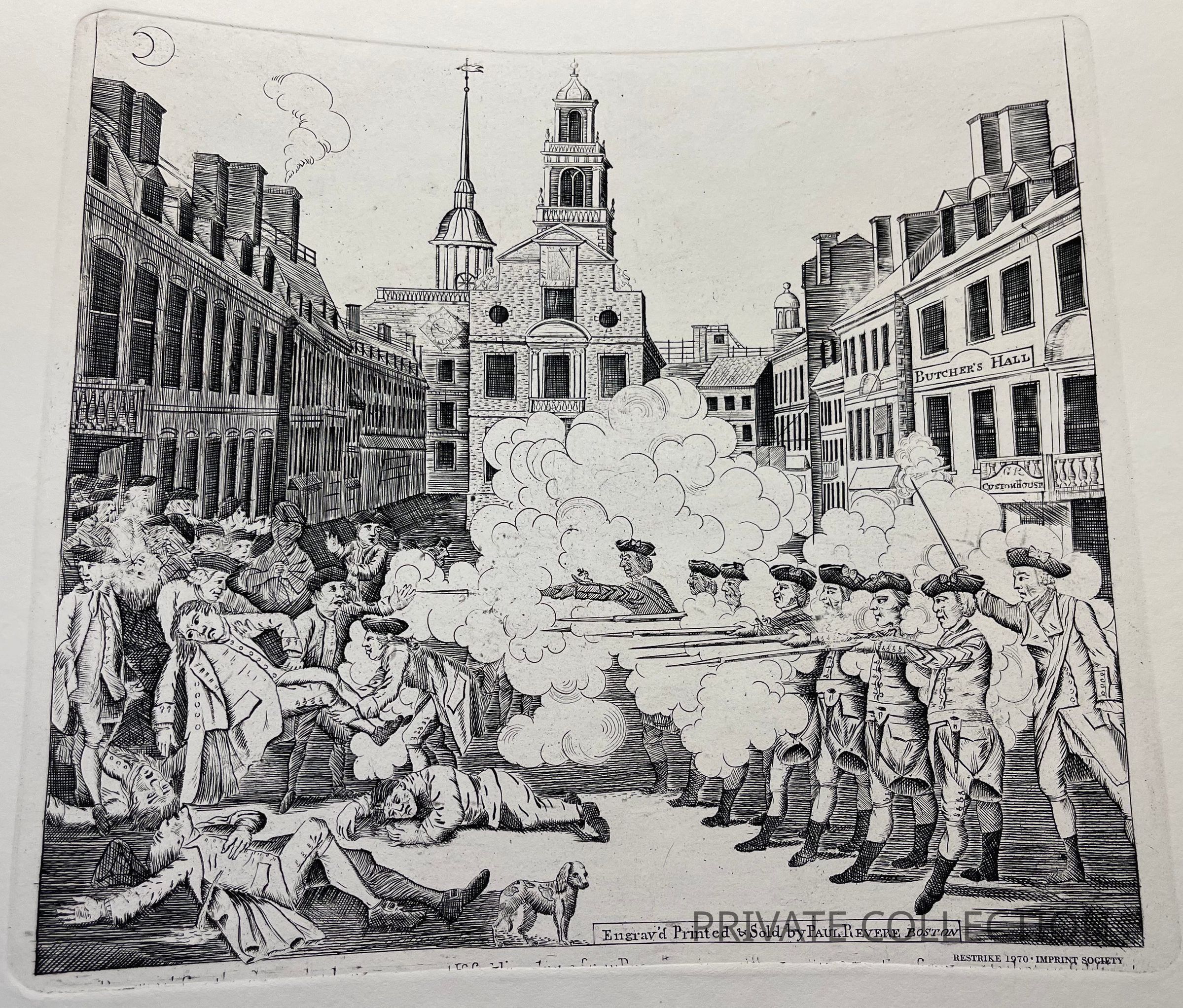 (MASSACHUSETTS). HALE, Richard. The Bloody Massacre Perpetrated in King-Street, Boston, on March 5th, 1770, by a Party of the 29th Regiment. Together With a Print of the Event Taken from the Boston Gazette, and a Note by Dr. Richard Hale. Barre, MA: Imprint Society, 1970. 1st ed. Oblong 4to. [10]pp. of text plus a plate laid in. Orig. cloth, printed paper label on front board.Condition