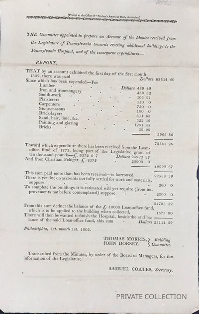 [Philadelphia, PA]: Office of "Poulson's American Daily Advertiser", 1803. Single sheet, 33.5 x 22.5 cm. Signed in type at conclusion by Thomas Morris and John Dorsey, of the Building Committee, "Philadelphia, 1st. month 1st. 1803," and by Samuel Coates, who transcribed the account as Secretary of the Board of Managers. Three horizontal folds, one lightly browned. A very good copy, on heavy paper watermarked "MATHEWS." Not found in Shaw & Shoemaker. OCLC locates one copy, catalogued together with a similar report of the Building Committee from 1805, held by the College of Physicians, Philadelphia. The text here lists by category approximately $72,500 expended for labor and materials, toward which nearly $25,000 had been provided by the Legislature, and $25,000 provided by Christian Febiger, with a balance of $23,114.59 borrowed by the hospital. The third (center) wing of the Hospital was completed in 1804: "Completion of the Center section allows for the opening of the surgical amphitheatre, made famous largely by the operations performed and lectures given there by Dr. Physick." [see: timeline on the Penn Medicine website].Other Names and Numbers