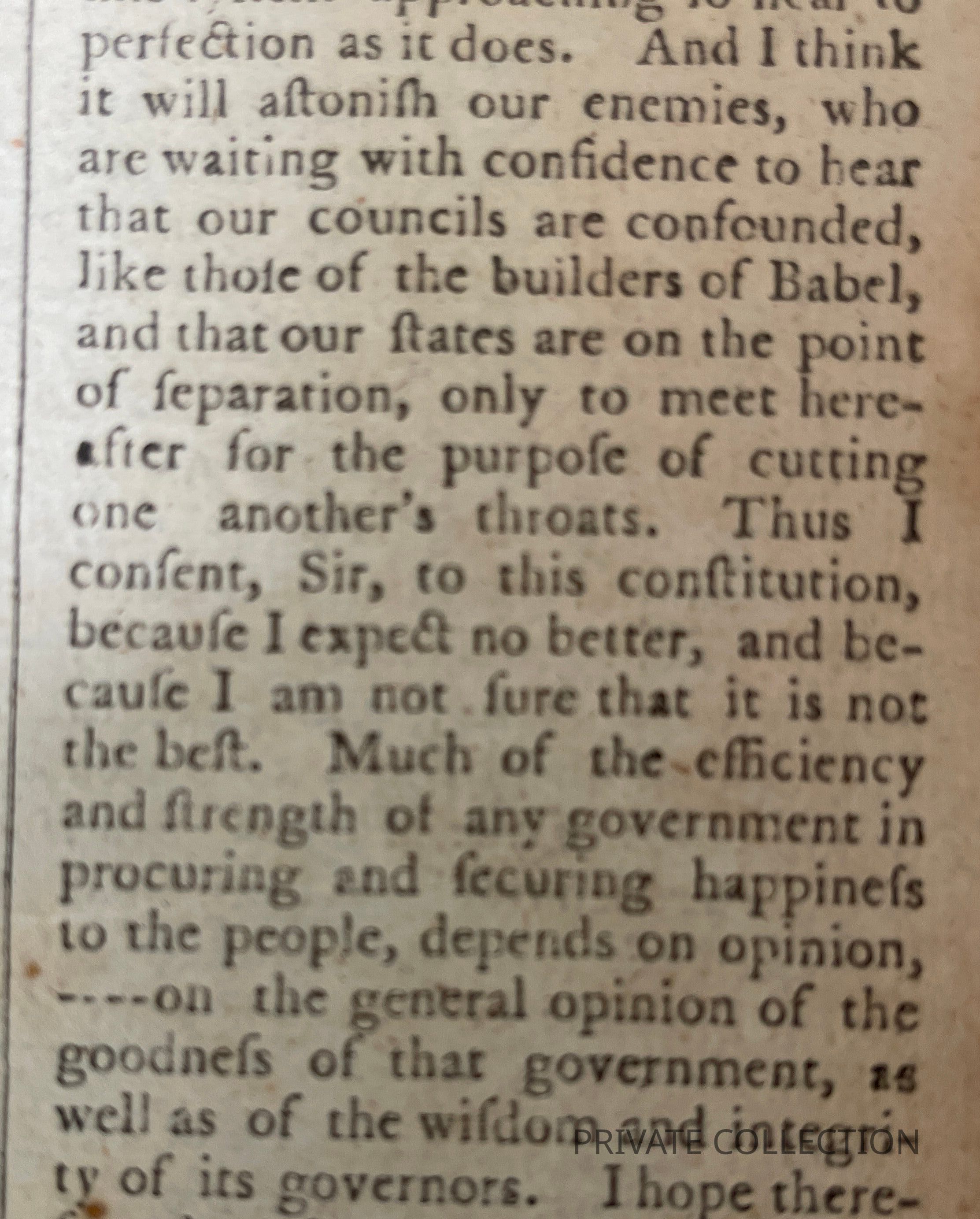 FRANKLIN QUOTES RICHARD STEELE ON RELIGION IMMEDIATELY BEFORE SIGNING THE U.S. CONSTITUTION: "... The only difference between our two churches, in the opinion of the certainty of their doctrine, is, the Romish church is infallible and the English church is NEVER IN THE WRONG. "Franklin addressed his speech to the President of the Federal Convention, i.e. George Washington, and expresses the opinion that, although he does "not entirely approve of this constitution at present" it should nevertheless be signed by all members as he doubts any better version is likely and believes a unanimous front should be presented.Condition