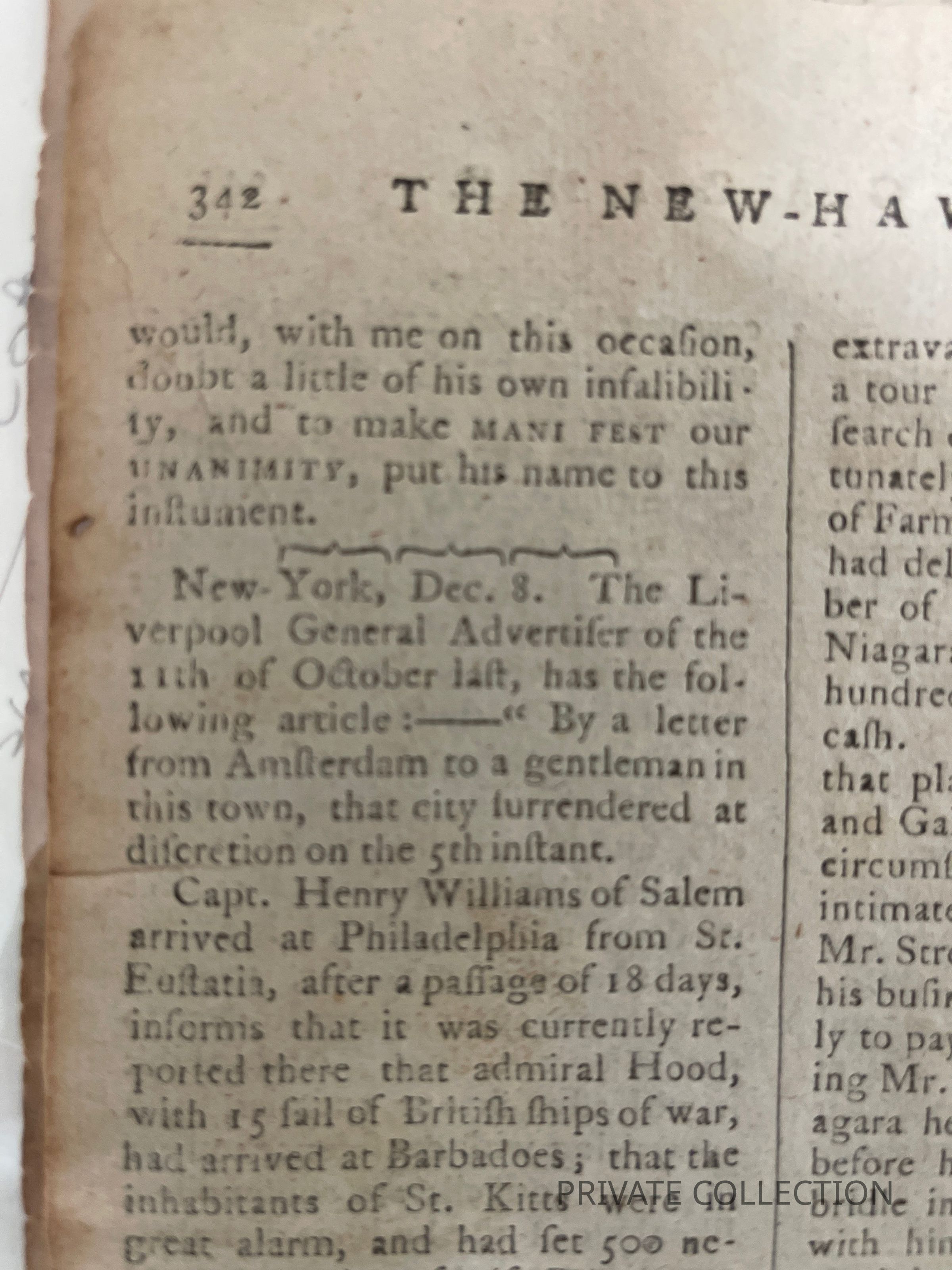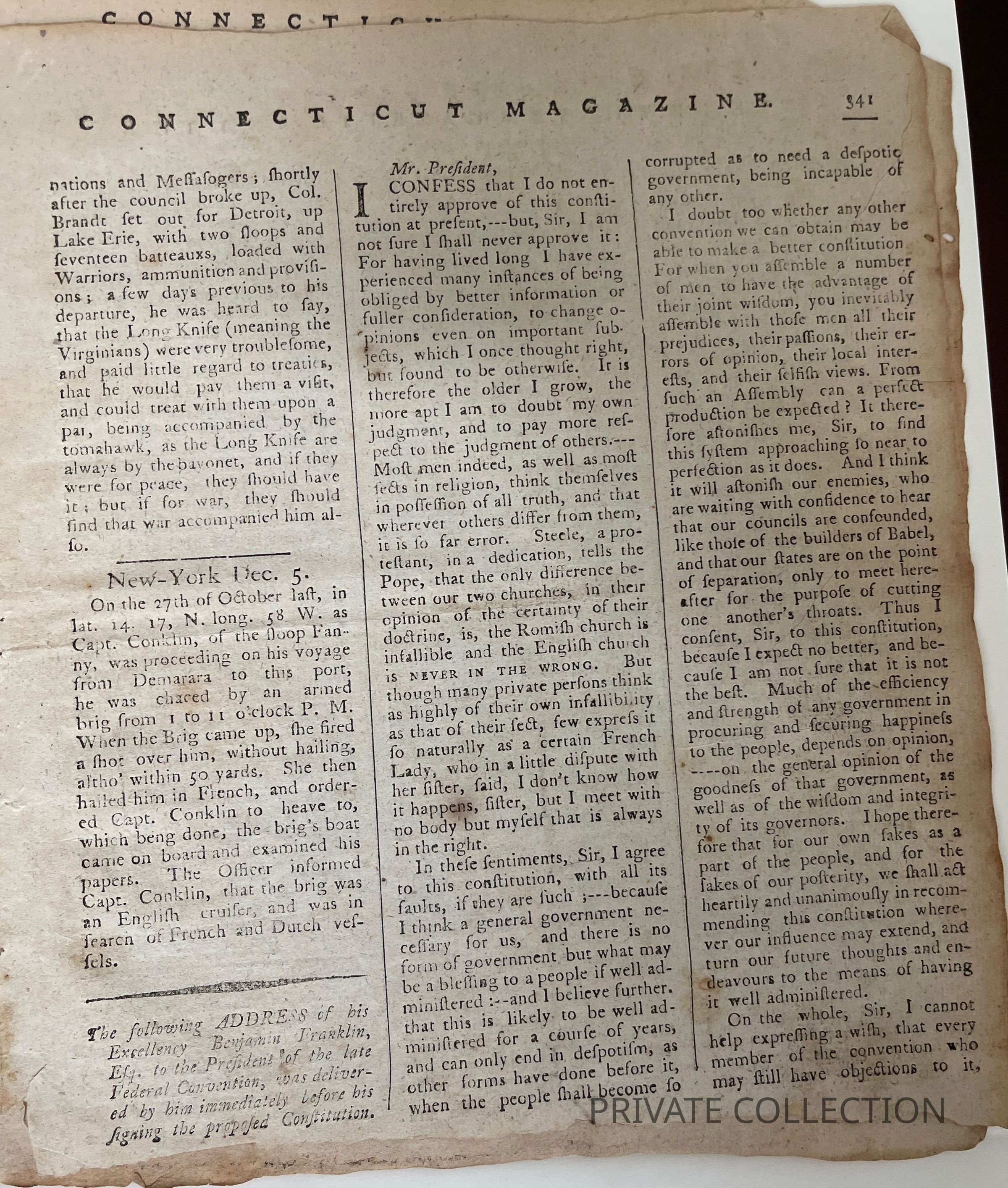[FRANKLIN, BENJAMIN. 1706-1790.] The New-Haven Gazette and the Connecticut Magazine. New Haven: Josiah Meigs, December 13, 1787. No. 43. 4to (264 √ó 218 mm). 8 pp. Tiny holes to first leaf, closed cut to third leaf, some toning, few stains.