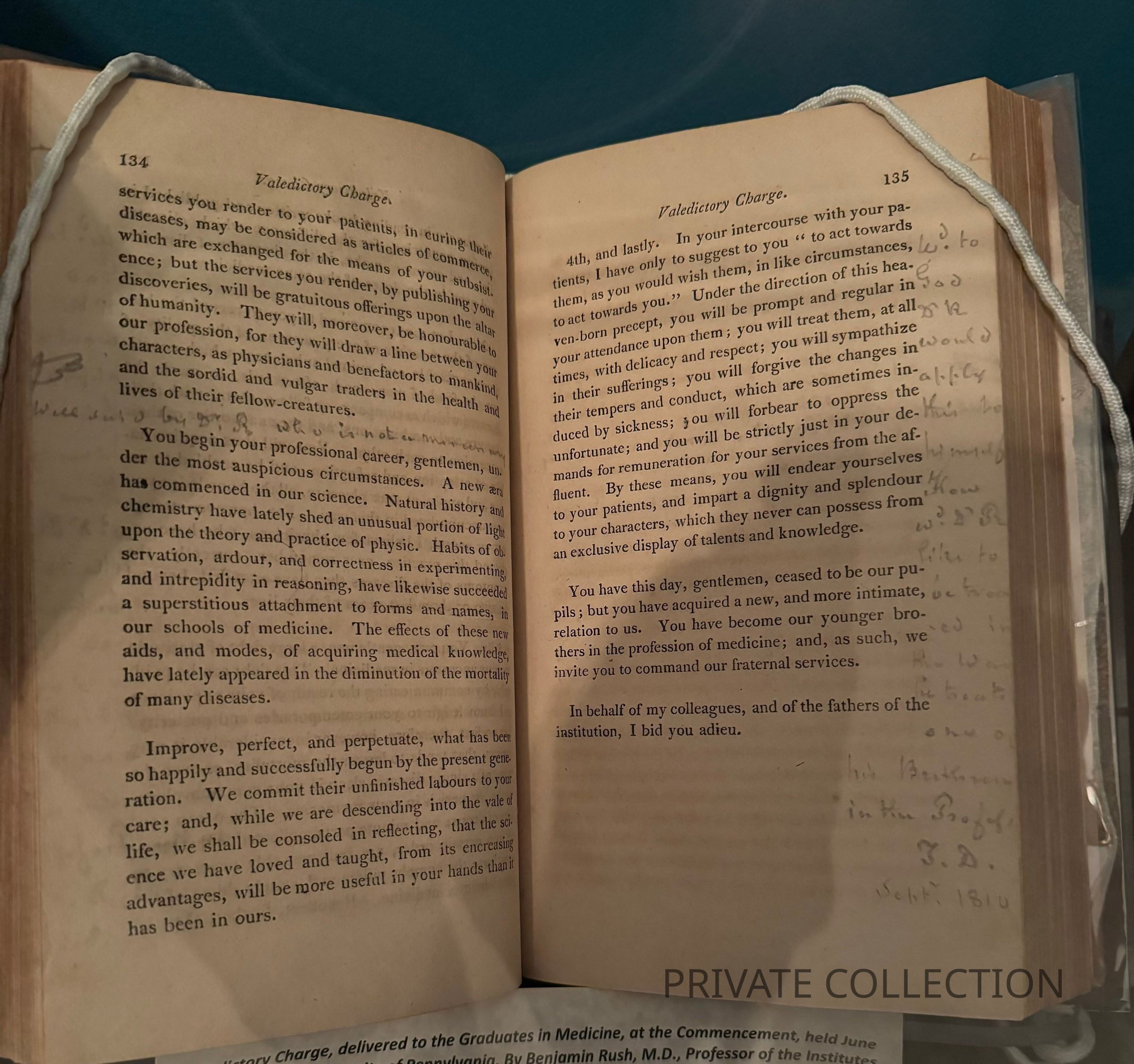 Includes a valedictory charge written by Benjamin Rush (Fox 1805-8) with handwritten comments from