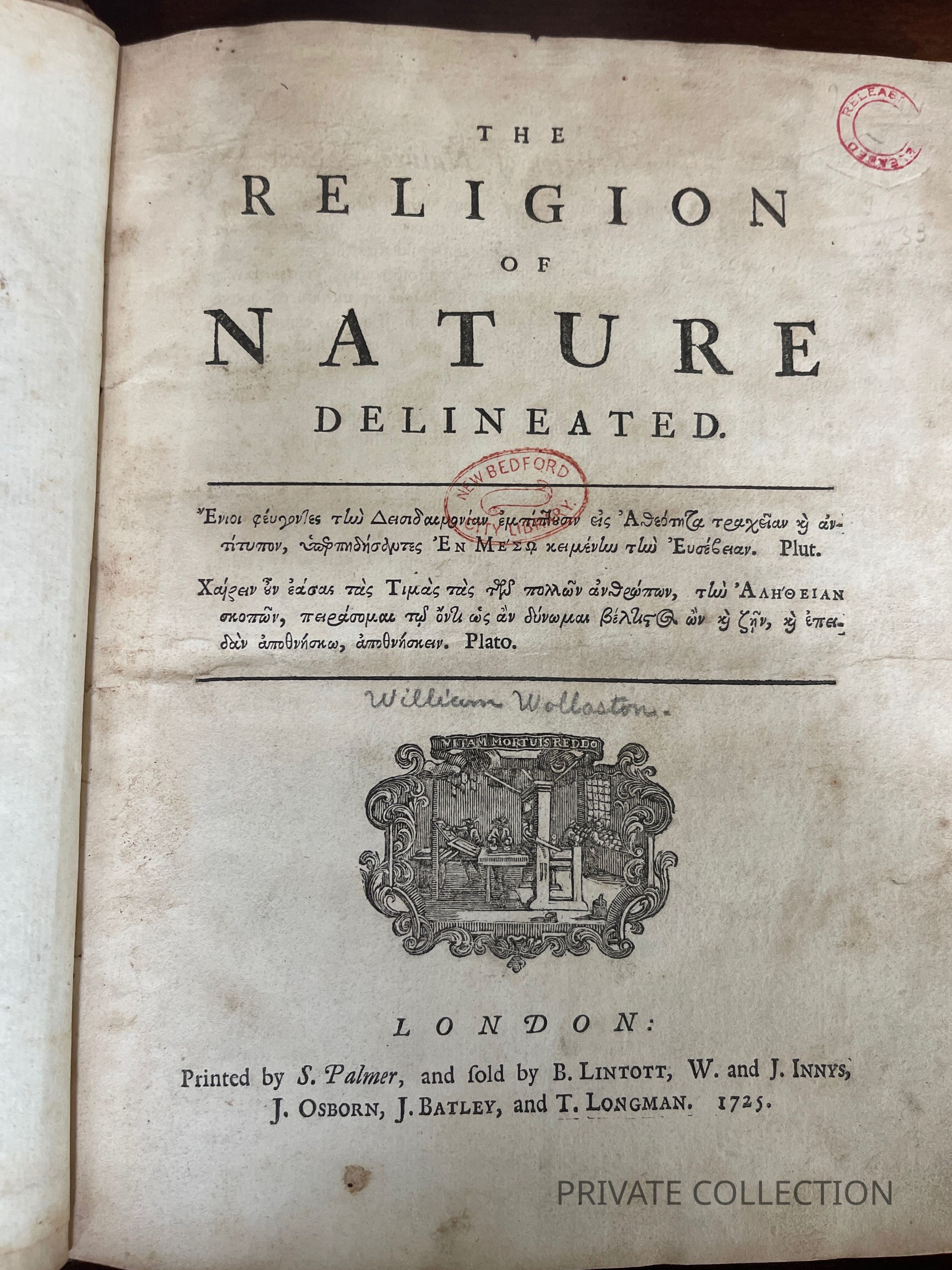 "Religion of Nature Delineated," which is on large paper and which bears the im-print:
