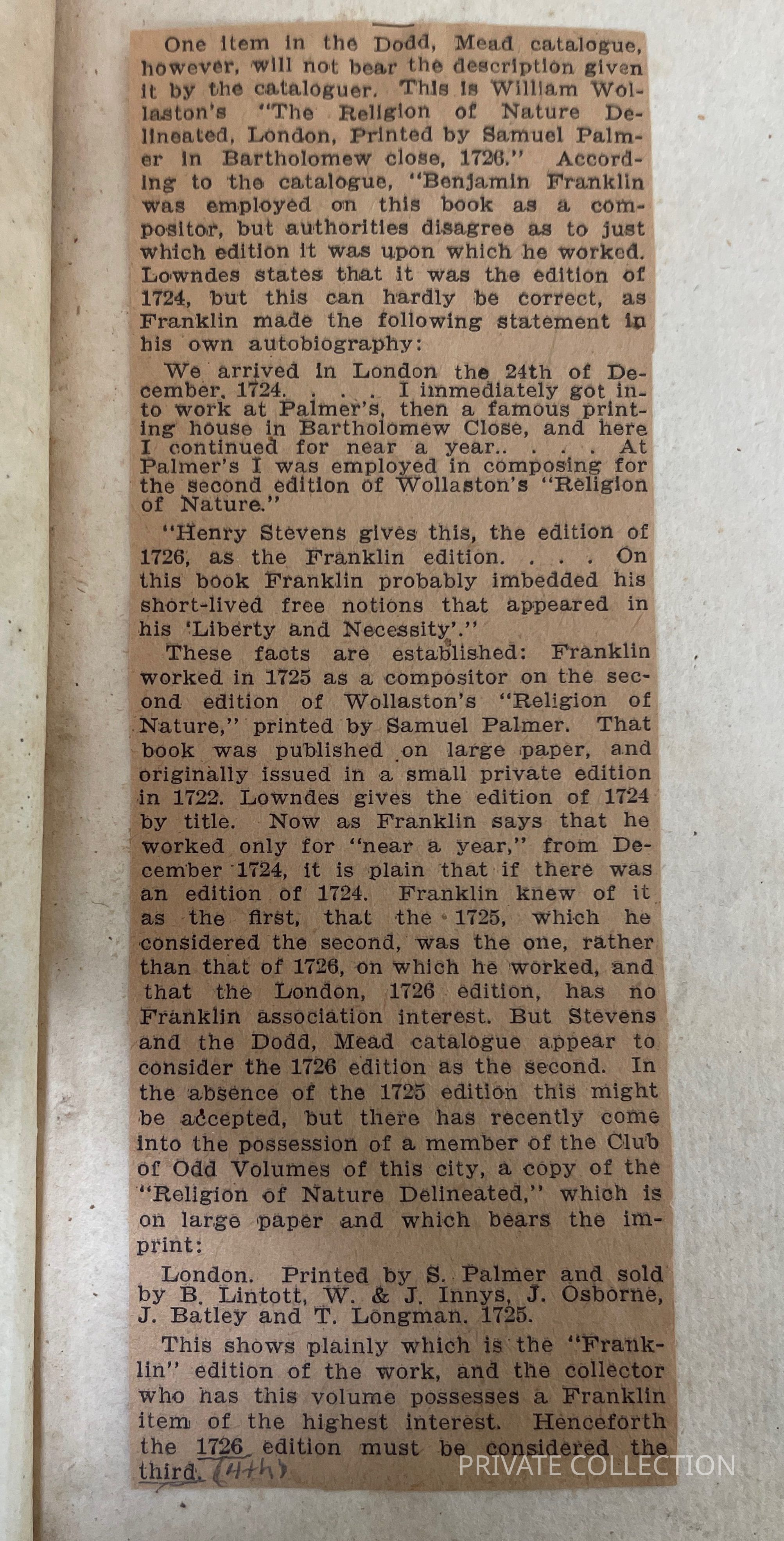There is no doubt or argument that Franklin worked on William Wollaston’s “The Religion of Nature Delineated, London, Printed by Samuel Palmer, Bartholomew close, 1726.” The discussion is which on which edition he worked. Some argue that the Franklin edition was the 1724 edition, but that cannot be the case as Franklin himself states in his autobiography: “We arrived in London the 24th of December in 1724…I immediately got to work at Palmer’s, then a famous printing house in Bartholomew Close, and here I continued for near a year…At Palmer’s I was employed in composing for the second edition of “Wollaston’s Religion of Nature.”
