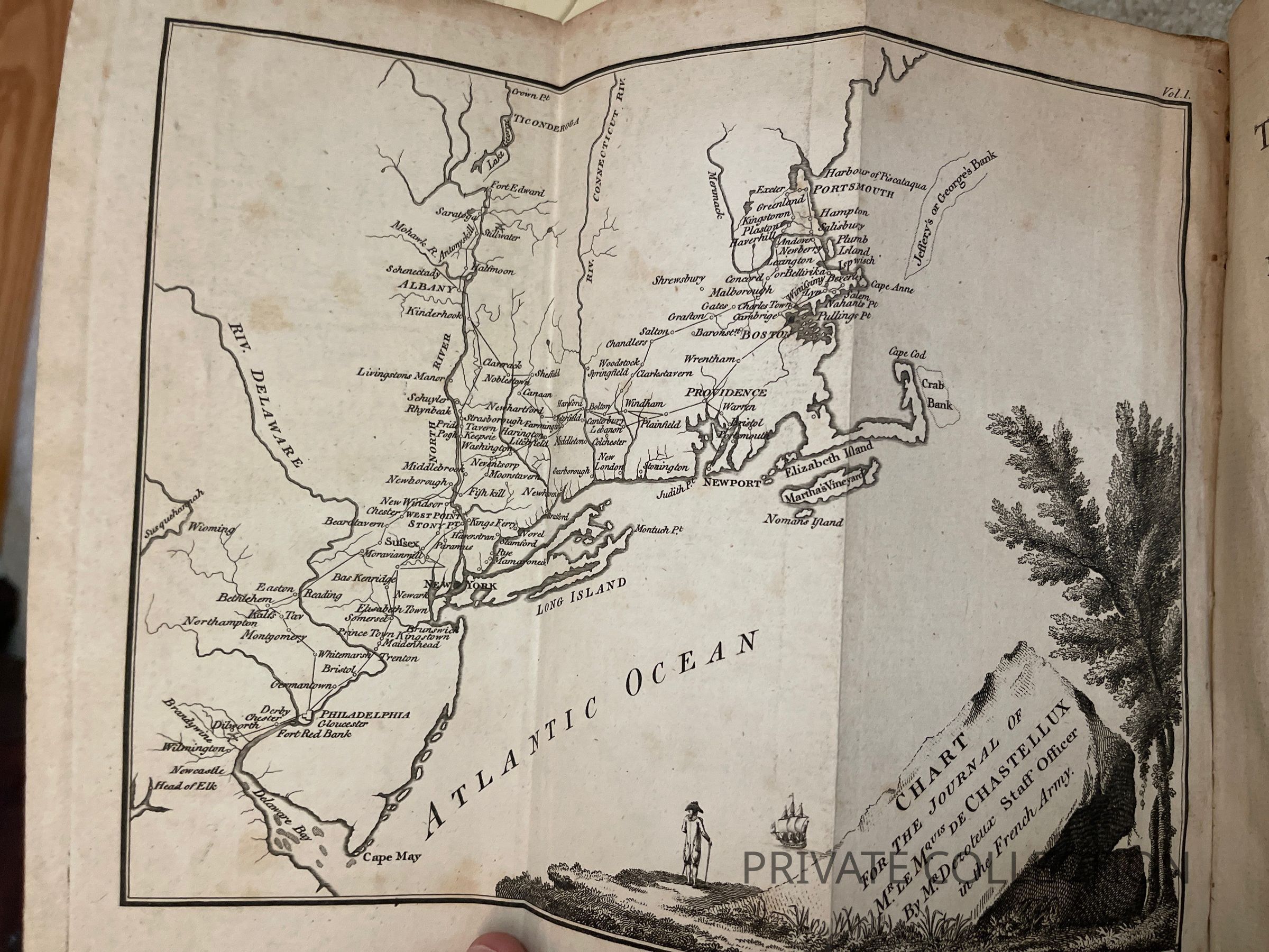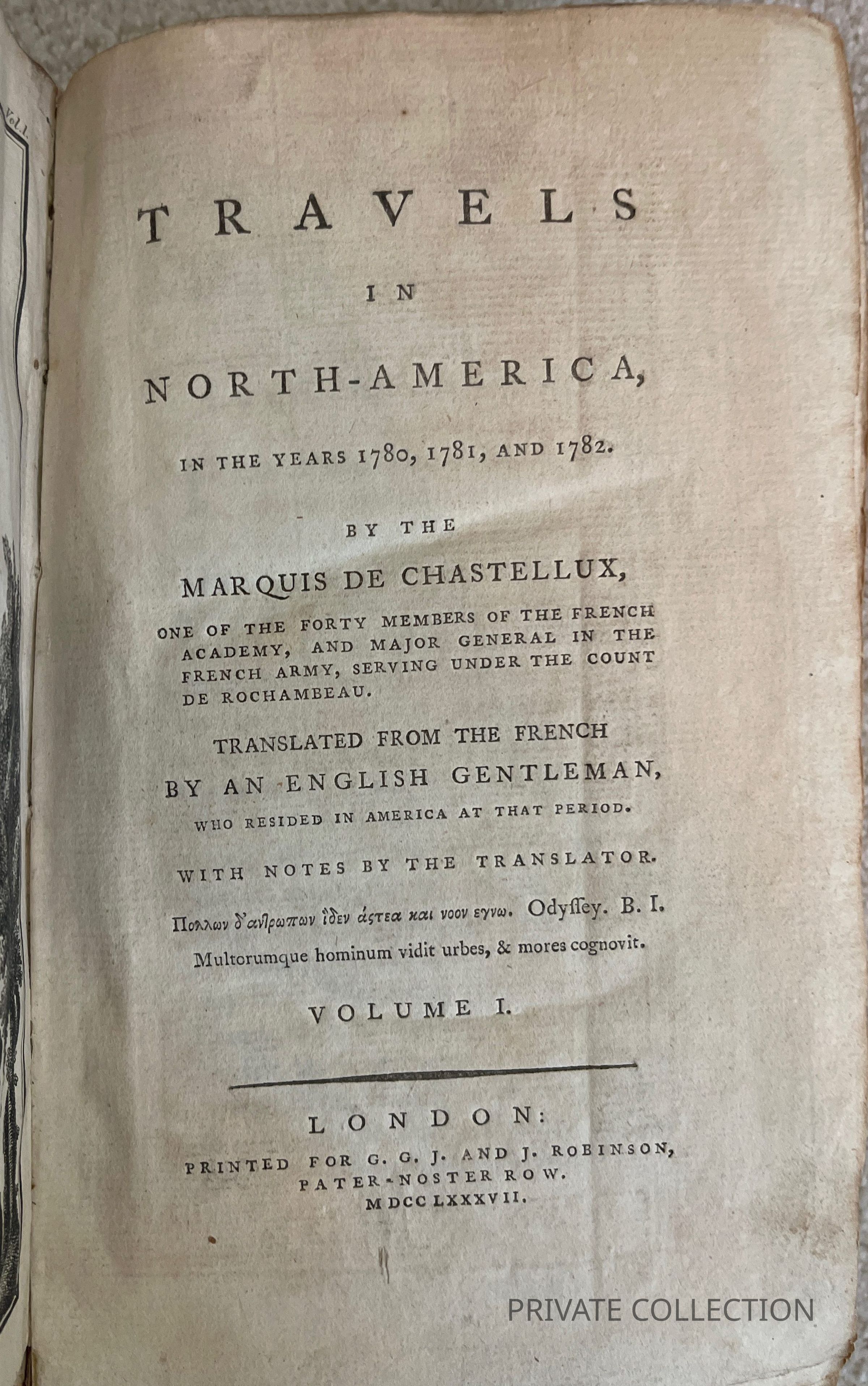 Howes C-234, “aa.” Calrk I:212. Reese, The Revolutionary Hundred 82. Sabin 12227. A classic American travel narrative, called by Howes “ the first trustworthy account of life I the United States.” Chastellux was second in command of the French forces in America during the American Revolution. A member of the French Academy and an elightened and perceptice man, his work describes his travels in Connectivut, New York, New Jersey, and Virginia, and his visits with Washington and Jefferson, with much material relating to the Revolution. The maps trace the author’s route, one showing Virginia, and the other illustrating America from New Jerswey to New England.Other Names and Numbers