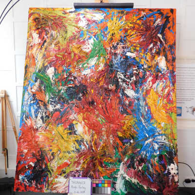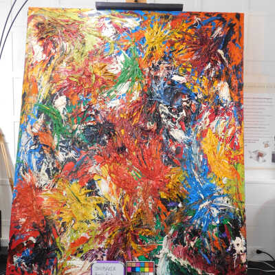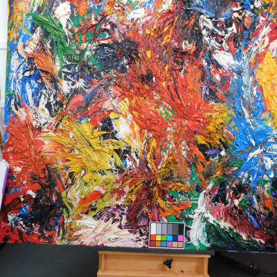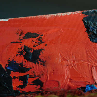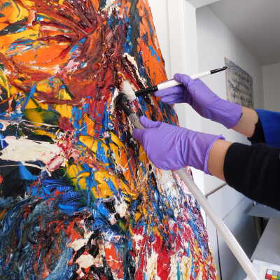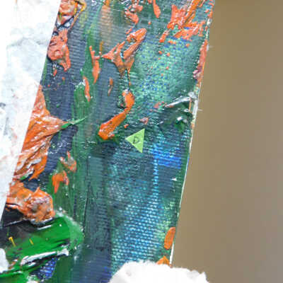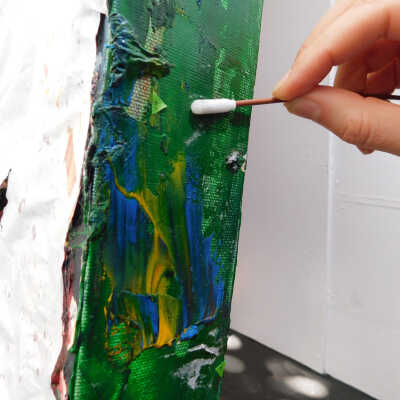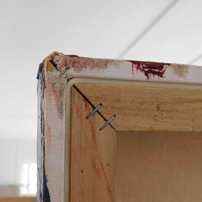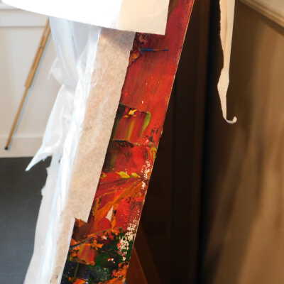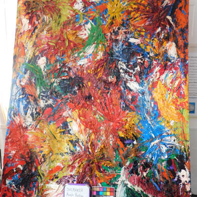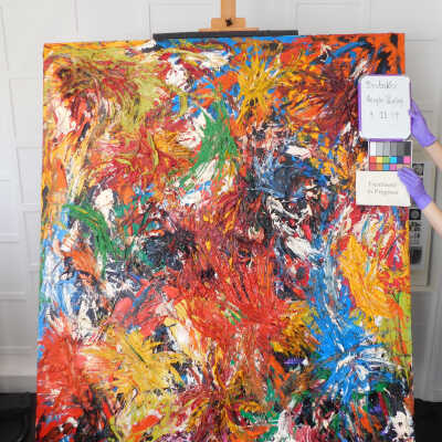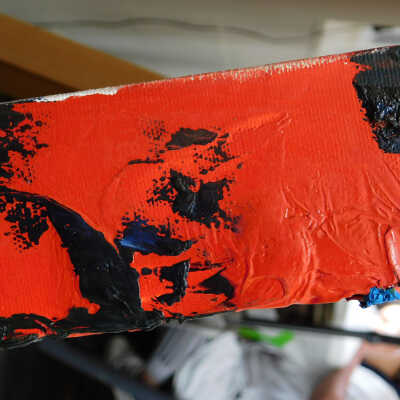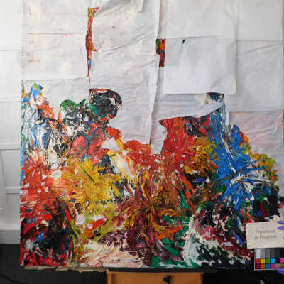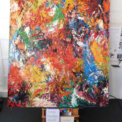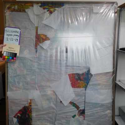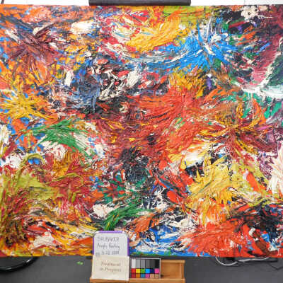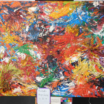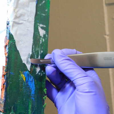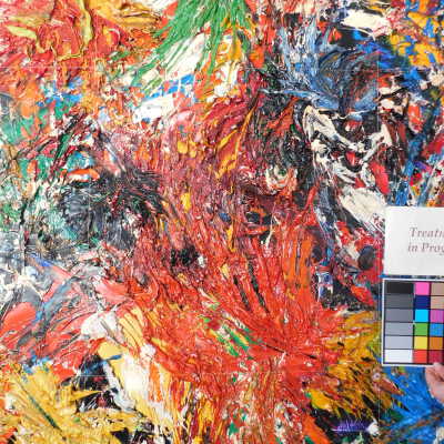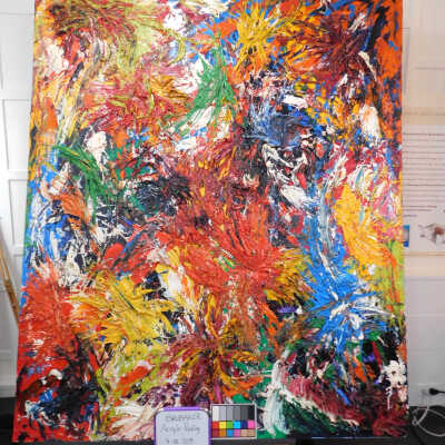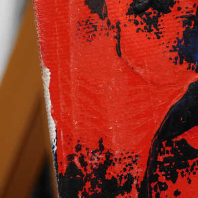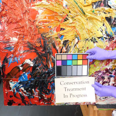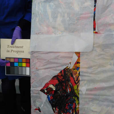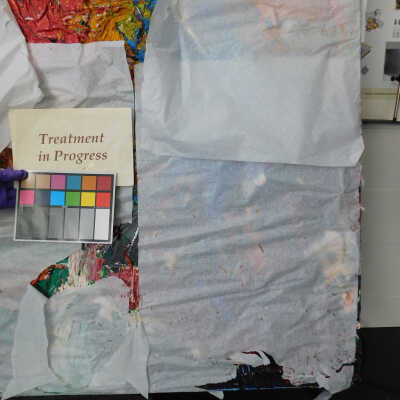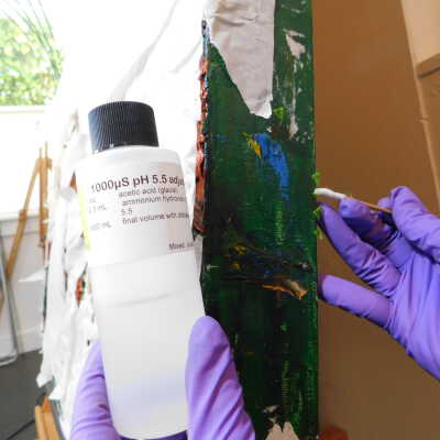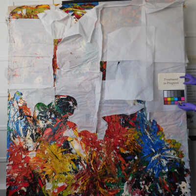 Saturated surface with D4. Cleaned with ME and then rinsed with D4 (D4 with brush/ME with brush/D4 with cotton swab). Red paint is very sensitive to ME. Red and other sensitive paints were cleaned with Velvesil Plus + 40% adjusted water (5.00 pH/6.000mS). The gel was removed with cotton swab and surface rinsed with D4. Cleaned lint and dust using cotton swabs and sponge swabs. Flipped the painting on its side and removed paper from two edges. Saturated paper with D4 and with cotton swabs with pH 5.0/6.000mS adjusted water to pull paper off. Continued cleaning painting as above. Cleaning edges with Velvesil Plus and 5.0 pH solution.Acute Treatment