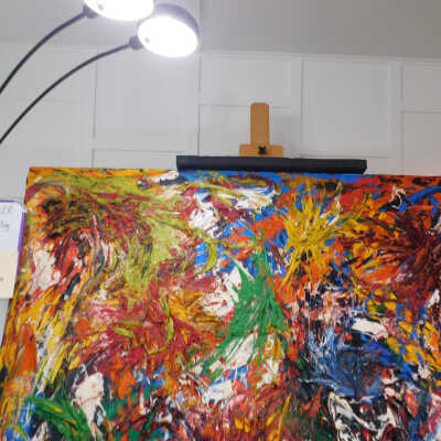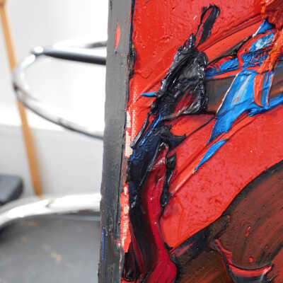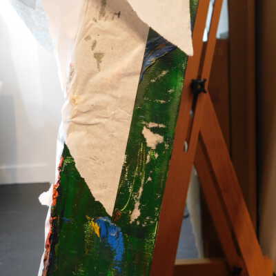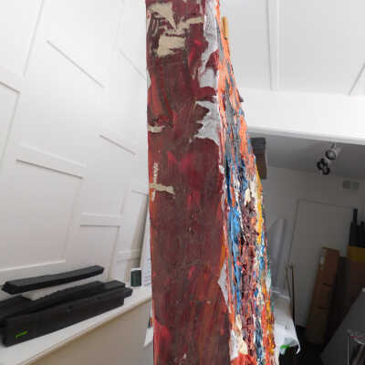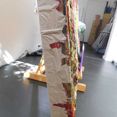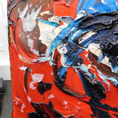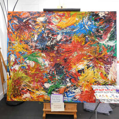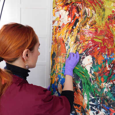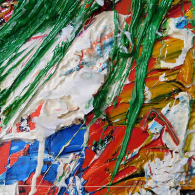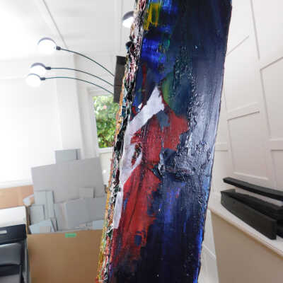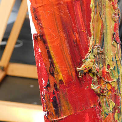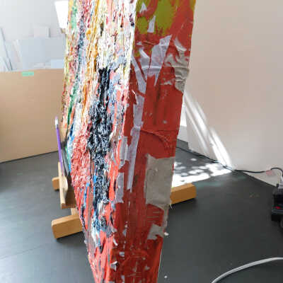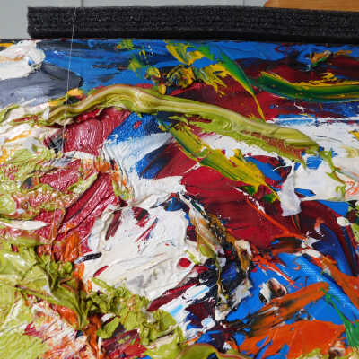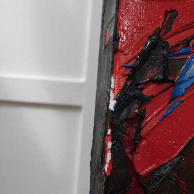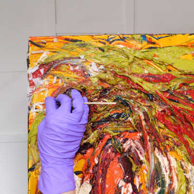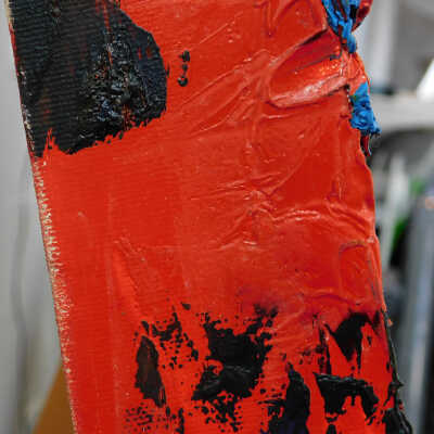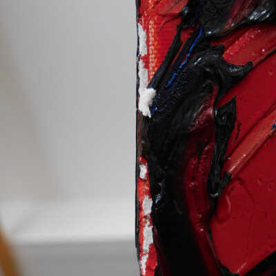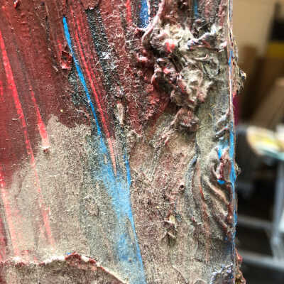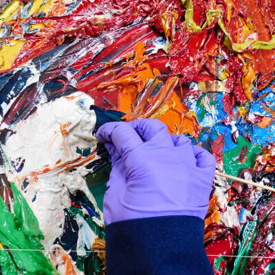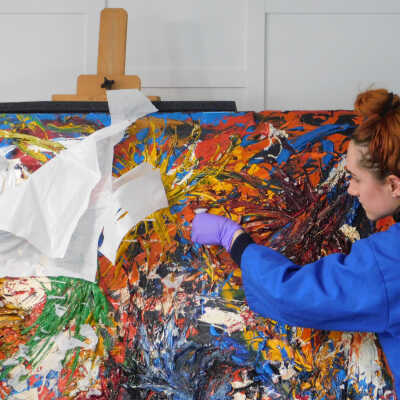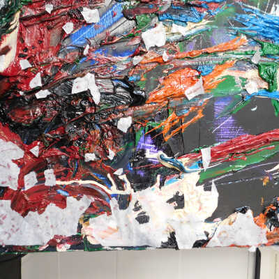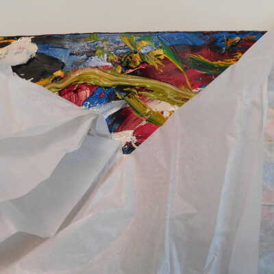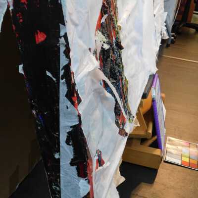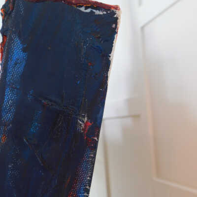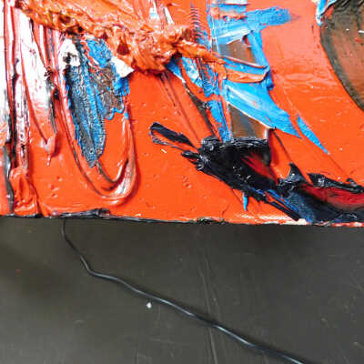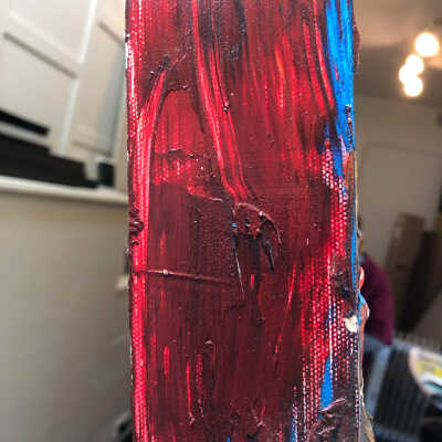Saturated surface with D4. Cleaned with ME and then rinsed with D4 (D4 with brush/ME with brush/D4 with cotton swab). Red paint is very sensitive to ME. Red and other sensitive paints were cleaned with Velvesil Plus + 40% adjusted water (5.00 pH/6.000mS). The gel was removed with cotton swab and surface rinsed with D4. Cleaned lint and dust using cotton swabs and sponge swabs. Flipped the painting on its side and removed paper from two edges. Saturated paper with D4 and with cotton swabs with pH 5.0/6.000mS adjusted water to pull paper off. Continued cleaning painting as above. Cleaning edges with Velvesil Plus and 5.0 pH solution.Acute Treatment