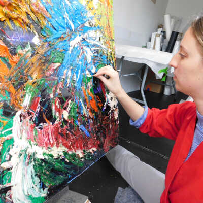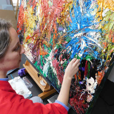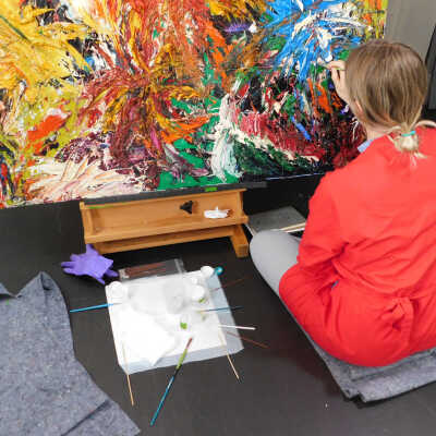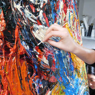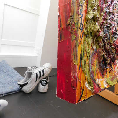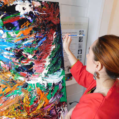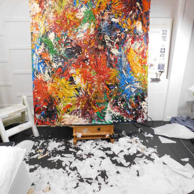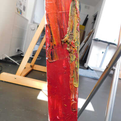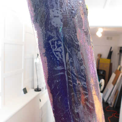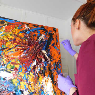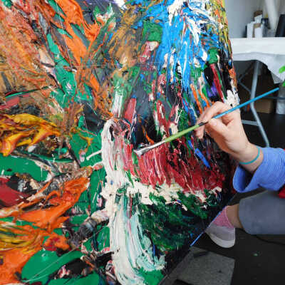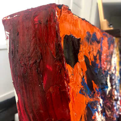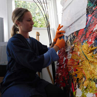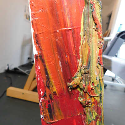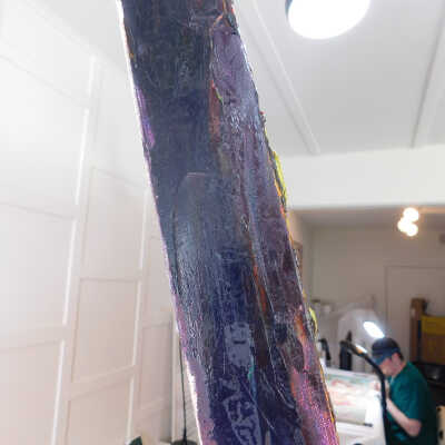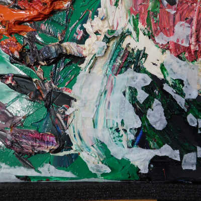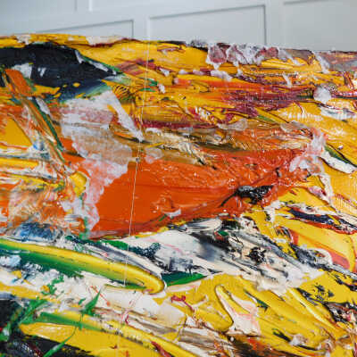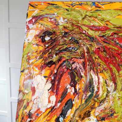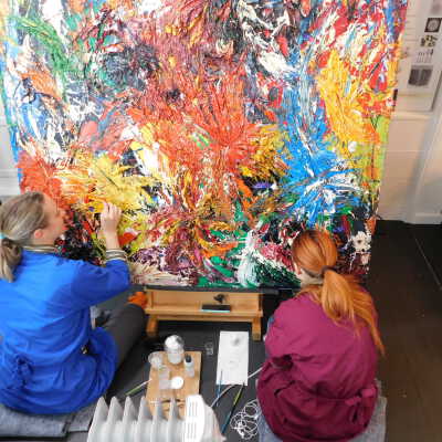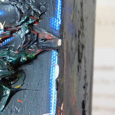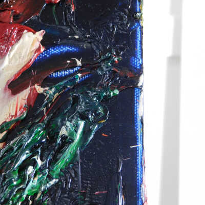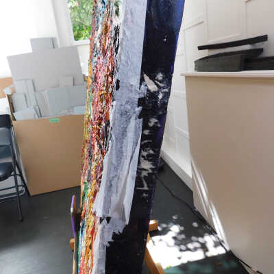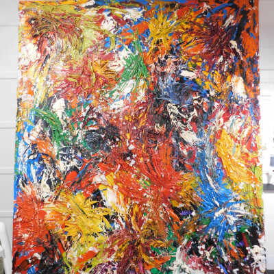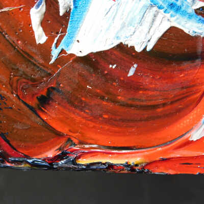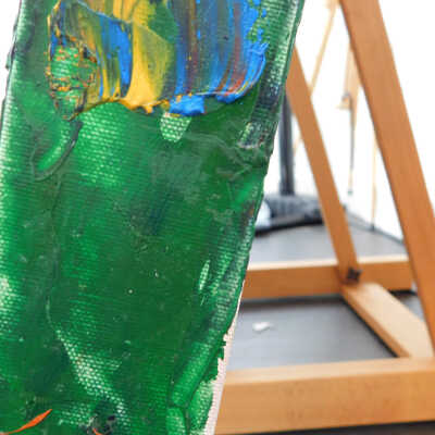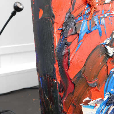 Saturated surface with D4. Cleaned with ME and then rinsed with D4 (D4 with brush/ME with brush/D4 with cotton swab). Red paint is very sensitive to ME. Red and other sensitive paints were cleaned with Velvesil Plus + 40% adjusted water (5.00 pH/6.000mS). The gel was removed with cotton swab and surface rinsed with D4. Cleaned lint and dust using cotton swabs and sponge swabs. Flipped the painting on its side and removed paper from two edges. Saturated paper with D4 and with cotton swabs with pH 5.0/6.000mS adjusted water to pull paper off. Continued cleaning painting as above. Cleaning edges with Velvesil Plus and 5.0 pH solution.Acute Treatment