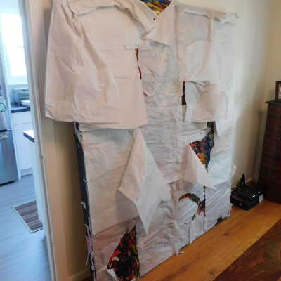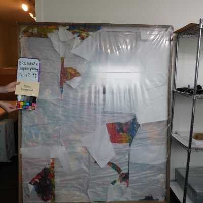 Removed lint with air compressor. Prepared collar paneled with Tyvek. Packed the artwork and took “After Treatment” photos.