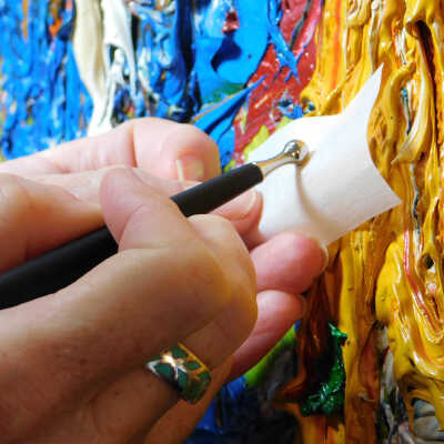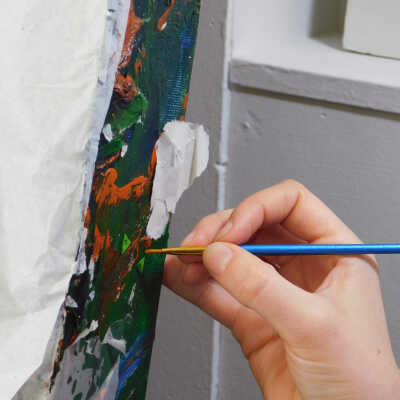 Retouching of paper fibers with QOR color. Removed some lint with tweezers. Filled few small losses with Flugger acrylic stucco.Acute Treatment