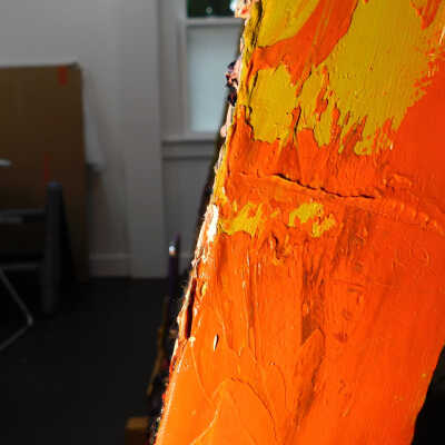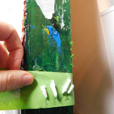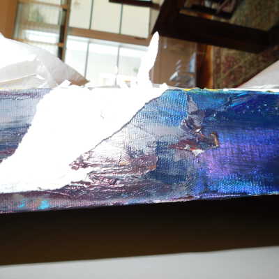 Trimmed threads along four corners and adhered canvas to stretcher with Jade 711. Retouched fillings with QOR watercolors and Larapol. Tried to reshape flat peaks with heating spatula and heating gun, but did not work.Acute Treatment