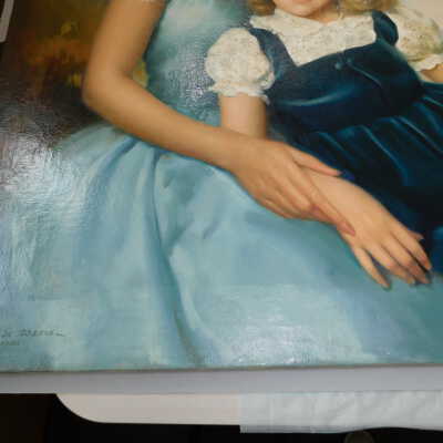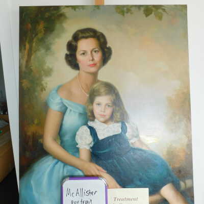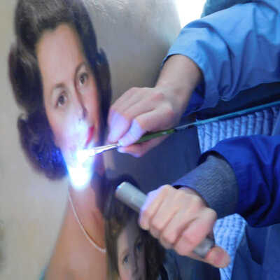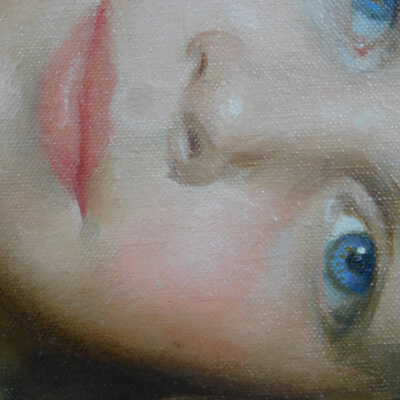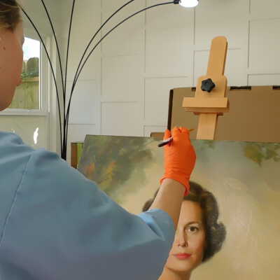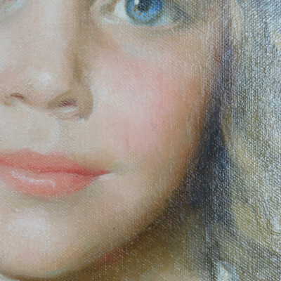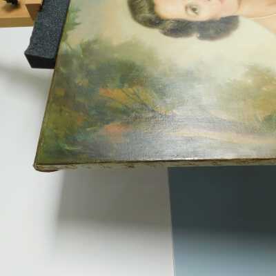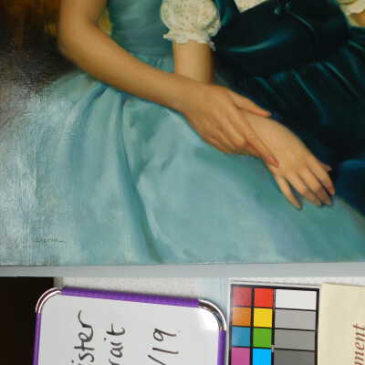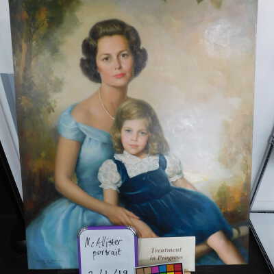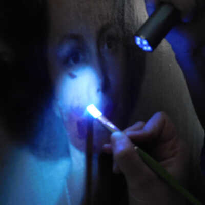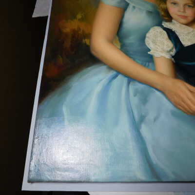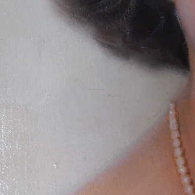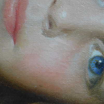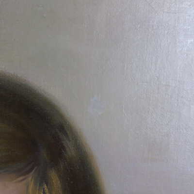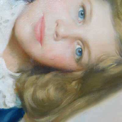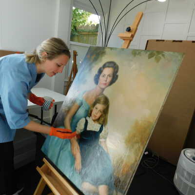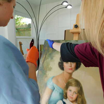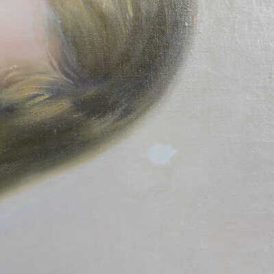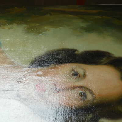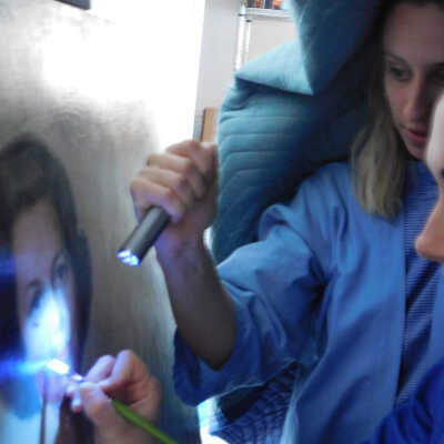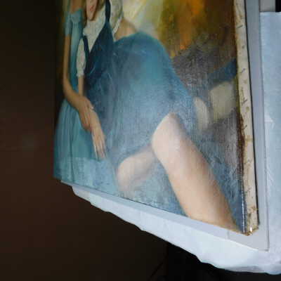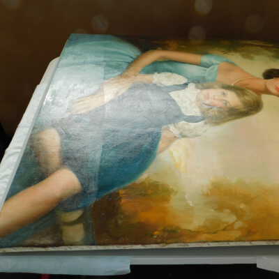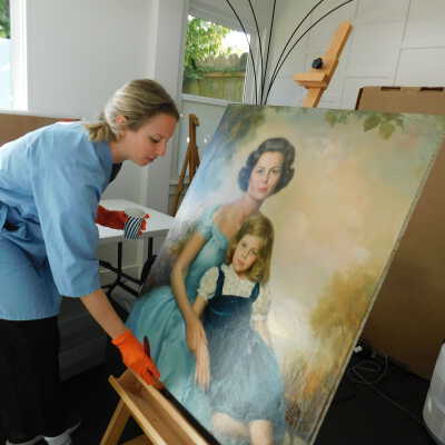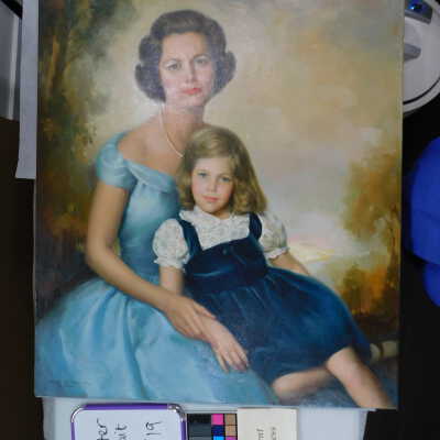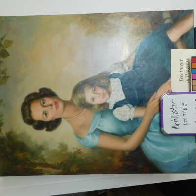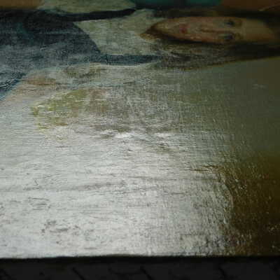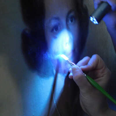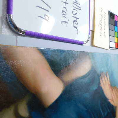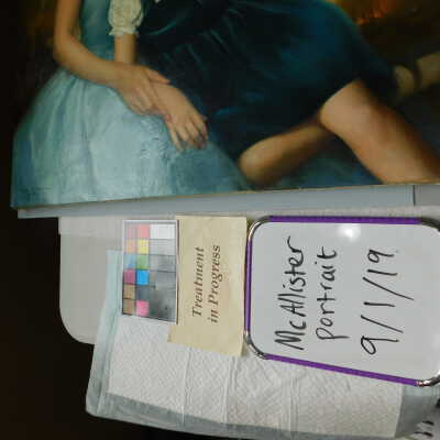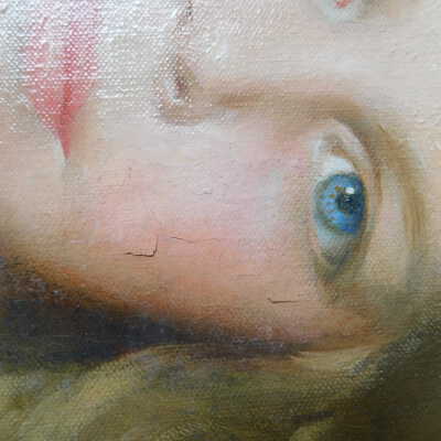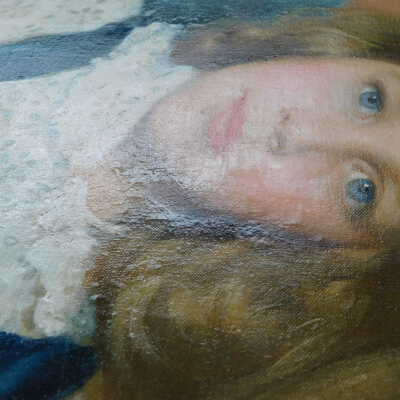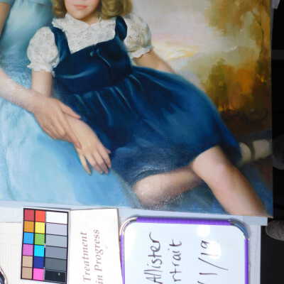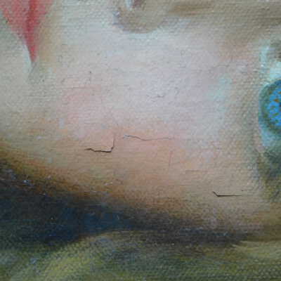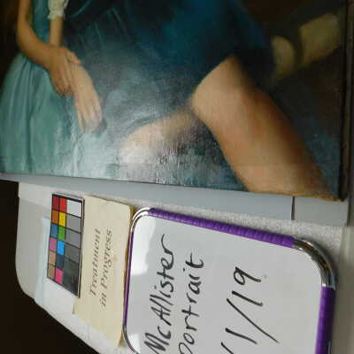 Photographs taken. Consolidations of lifting cracks in girl’s face using 3:1 Beva 371: Naptha, syringed into cracks and set with heat spatula to 150 degrees.Acute Treatment