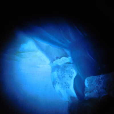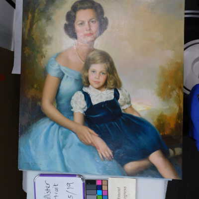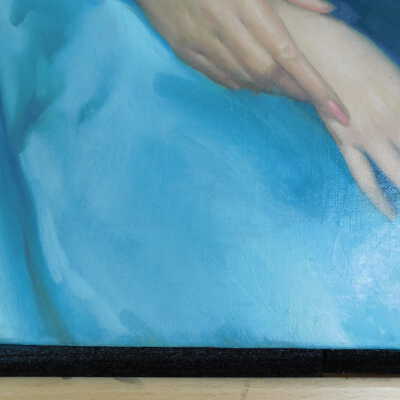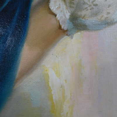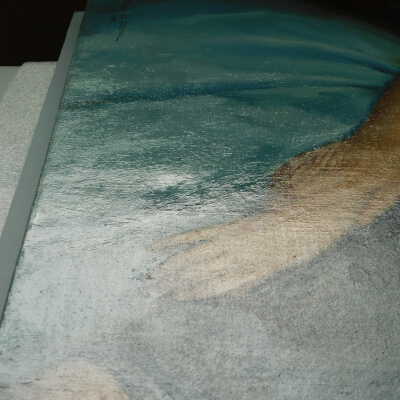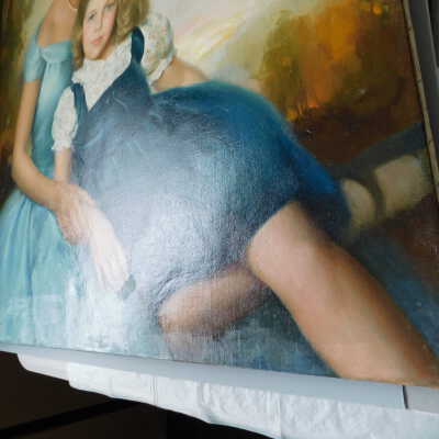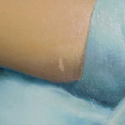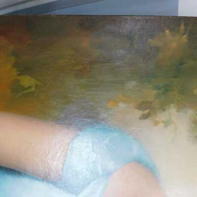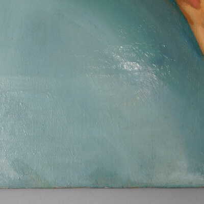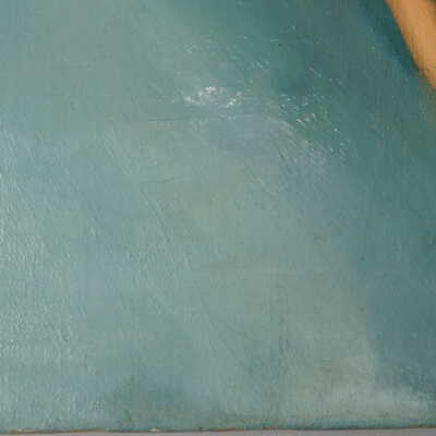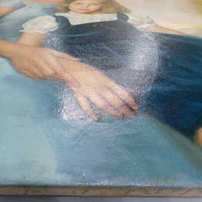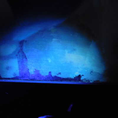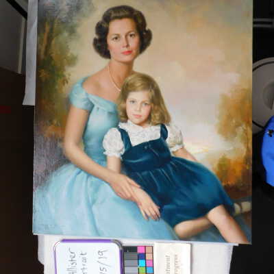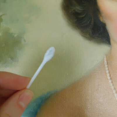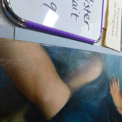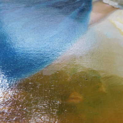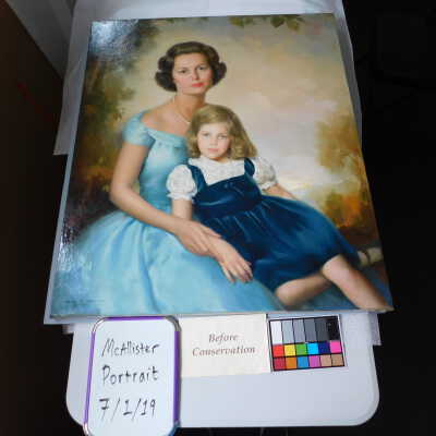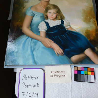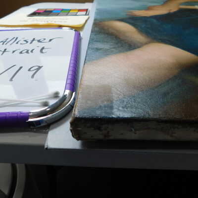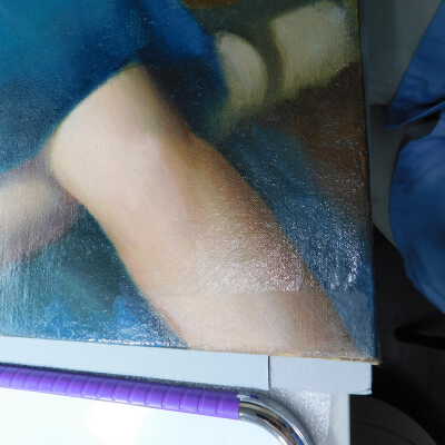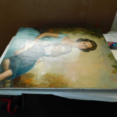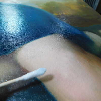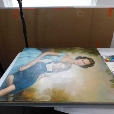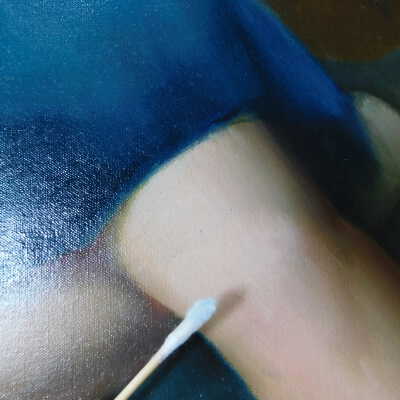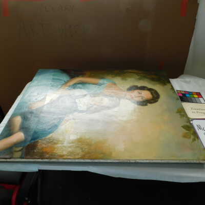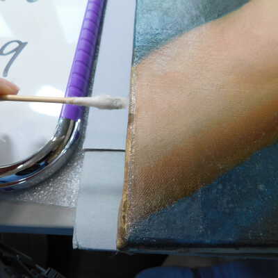 Testing and beginning varnish removal, starting at bottom right corner and moving along bottom edge. Using Naptha, 1/5th of glossy varnish removed. Blue color coming away on swabs confirmed to be due to varnish rather than pigment lifting (did not come up blue on child’s legs). Blue areas still sensitive and susceptible, so being quick in application. Finished varnish removal; reconsolidated cracks in mother’s left arm/child’s right cheek.Acute Treatment