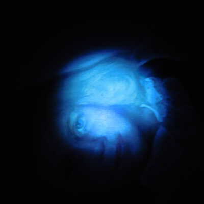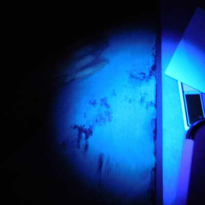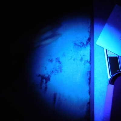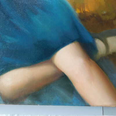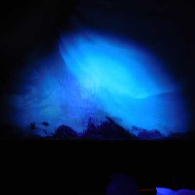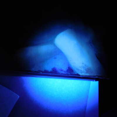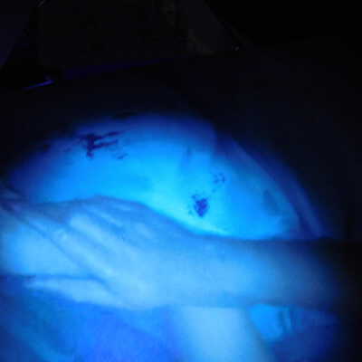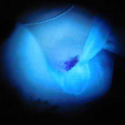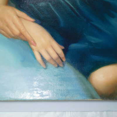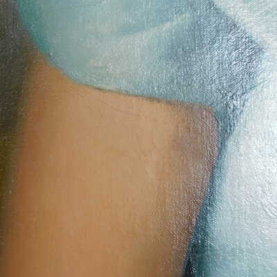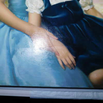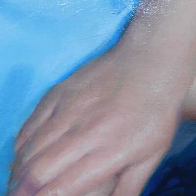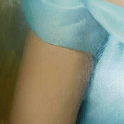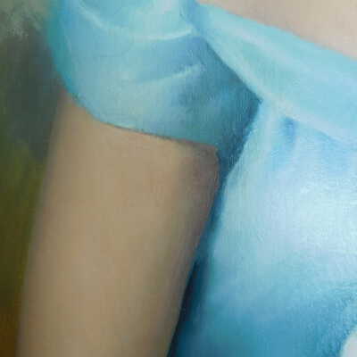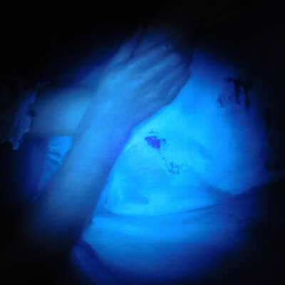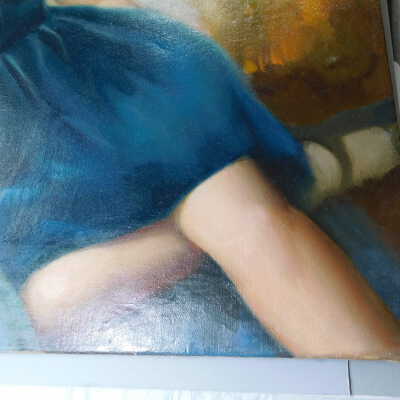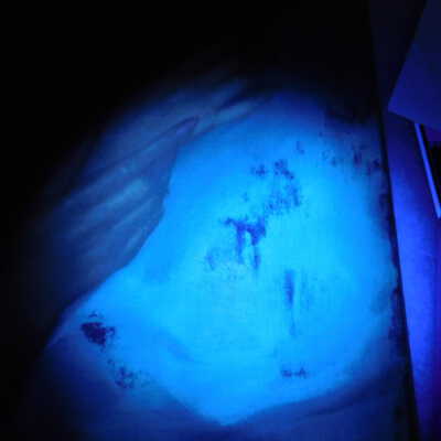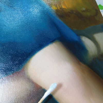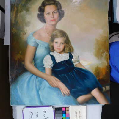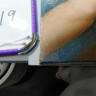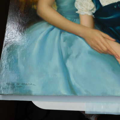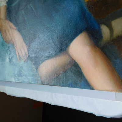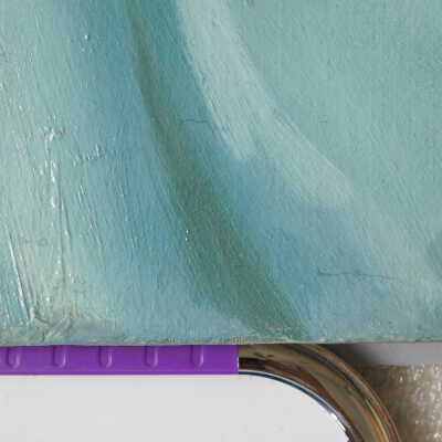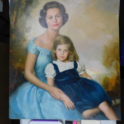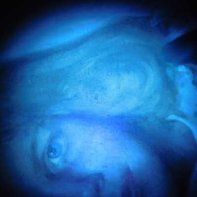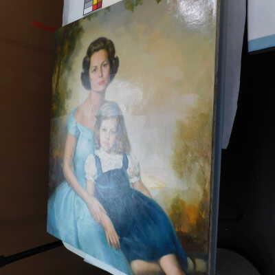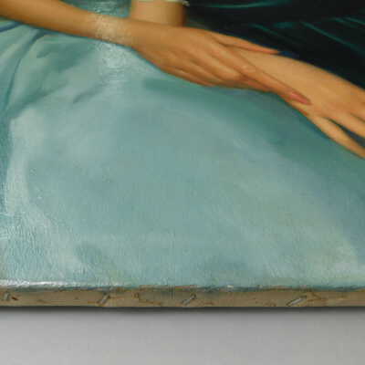 Testing and beginning varnish removal, starting at bottom right corner and moving along bottom edge. Using Naptha, 1/5th of glossy varnish removed. Blue color coming away on swabs confirmed to be due to varnish rather than pigment lifting (did not come up blue on child’s legs). Blue areas still sensitive and susceptible, so being quick in application. Finished varnish removal; reconsolidated cracks in mother’s left arm/child’s right cheek.Acute Treatment