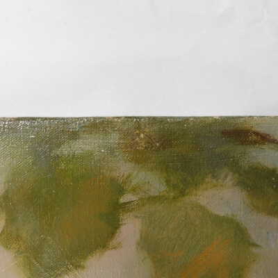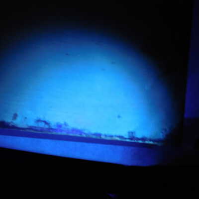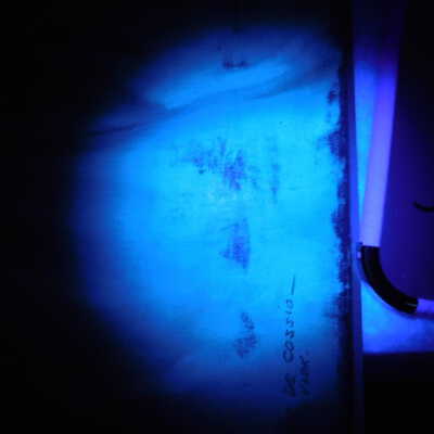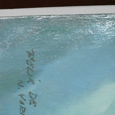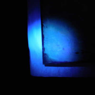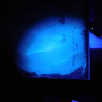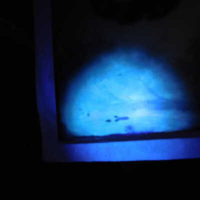 In-filled losses with clear gesso, removed flyspecks with pH adjusted water (8.5). Fills pared back to be level with surface. Barrier layer of Larapol, in-painting with watercolor. Removed adhesive substance of top edge with Naptha. May be the same material as the varnish removed from the painting’s surface. It pulls away like PVA residue. In-painting using Bremer and Daniel Smith watercolors.Acute Treatment