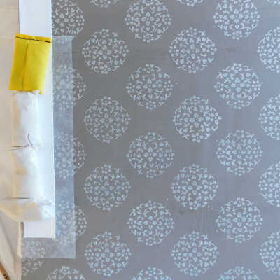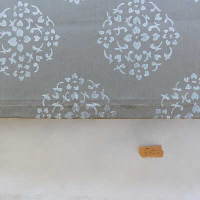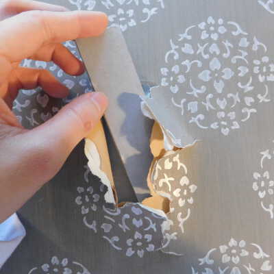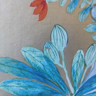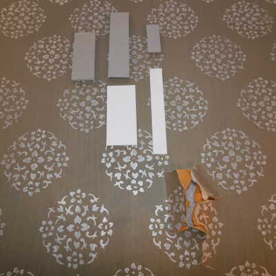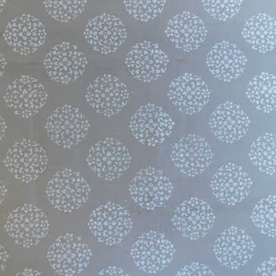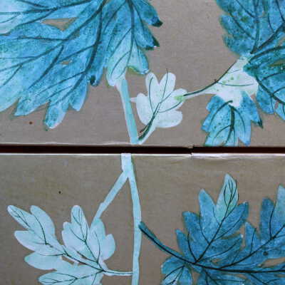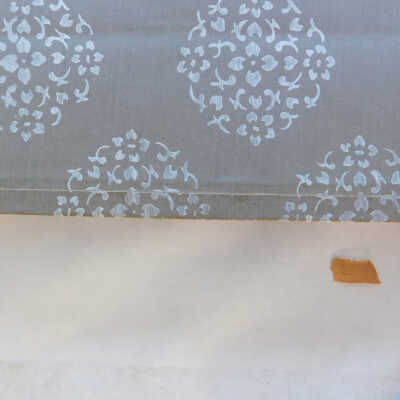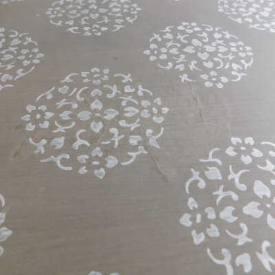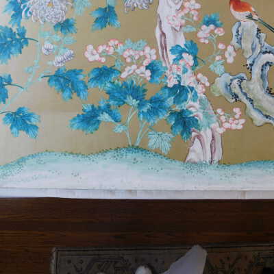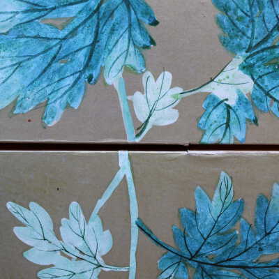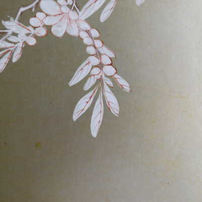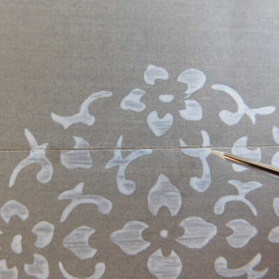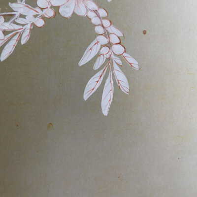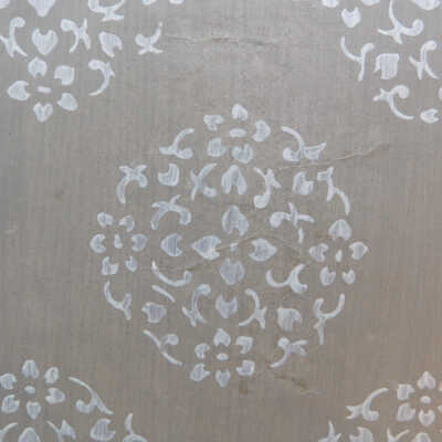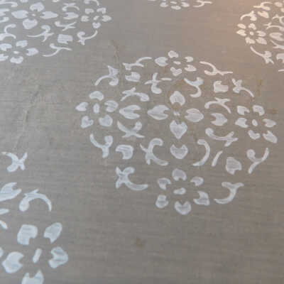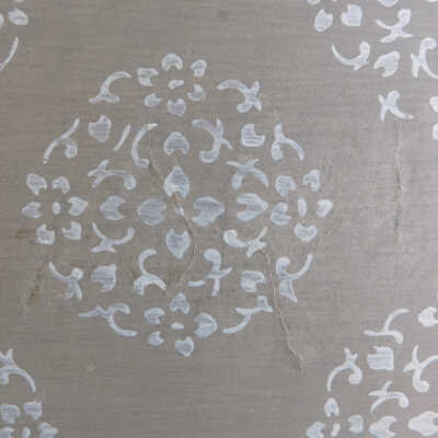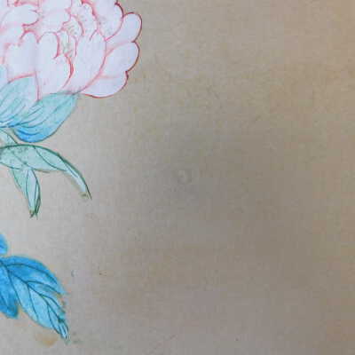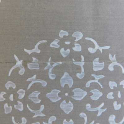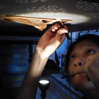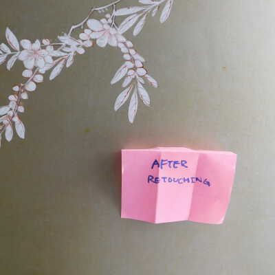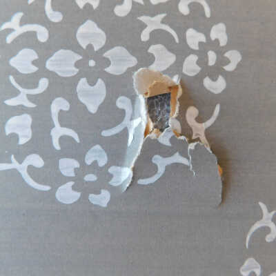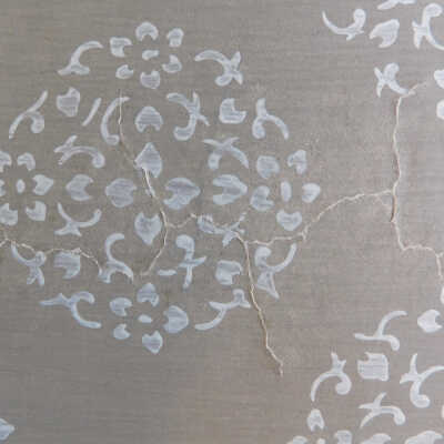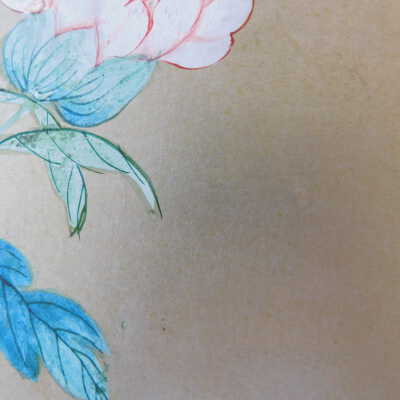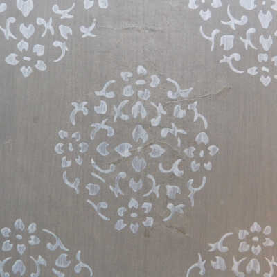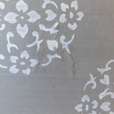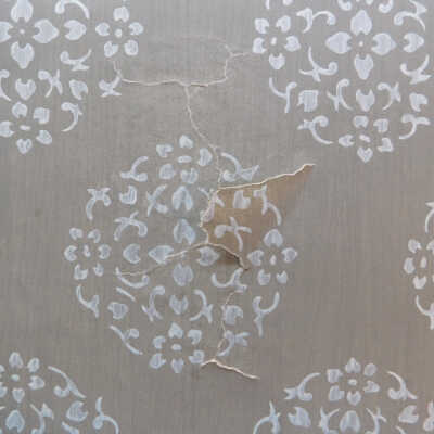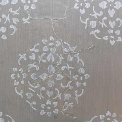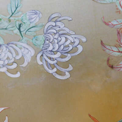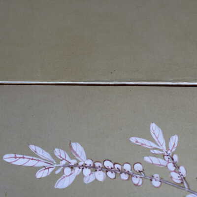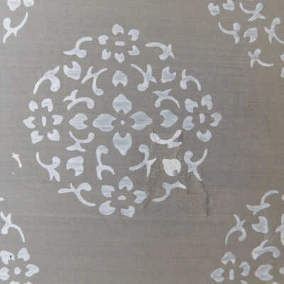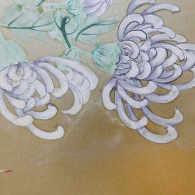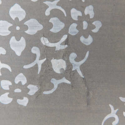 Traced the pattern of the screen (back side). Mixed watercolor to tone the paper for loss filling. Filled the hole with a pice of Japanese paper. Attached the edge of the original screen paper. Mixed watercolor to tone the insert paper. Toned four pieces of paper with watercolor. Used Manila folder to make a stamp seal. Mixed watercolor to draw the pattern. Toned two pieces of paper and drew the pattern on the insert paper. Made a mold of the hole and used it to cut the insert paper. Attached insert paper with starch paste. Filled gap between mended broken pieces with cellulose powder. Retouched the gap and faded out the area. Retouched tears with watercolor.Acute Treatment