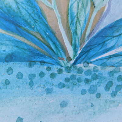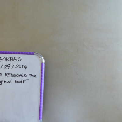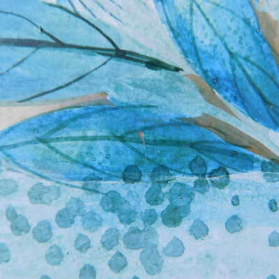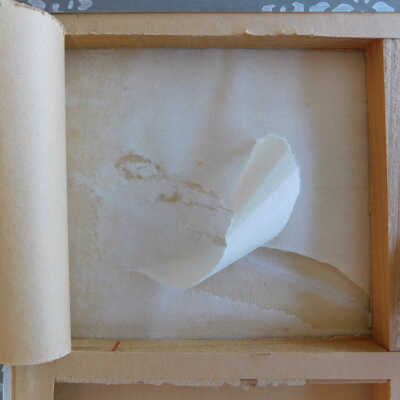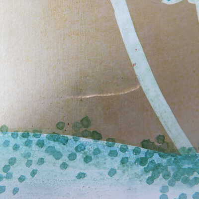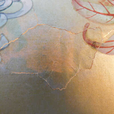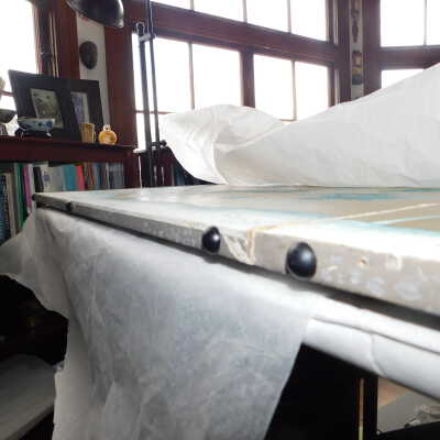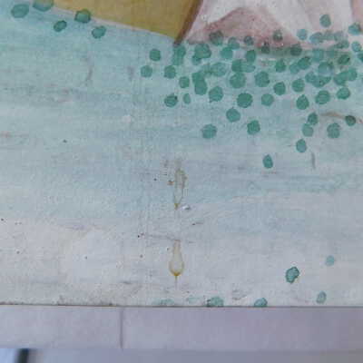 Humidified bigger hole locally using a plastic bag, a piece of Mylar, a piece of wet blotter paper, eight pieces of Hollytex, and a piece of felt. After mending tears, humidified first layer (with drawing) by brush from back side, and pressed into sandwich layers to flatten the first layer.Acute Treatment