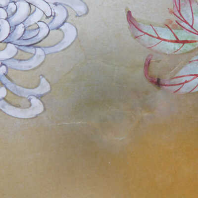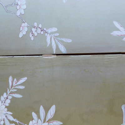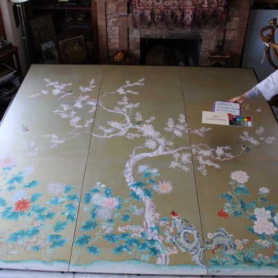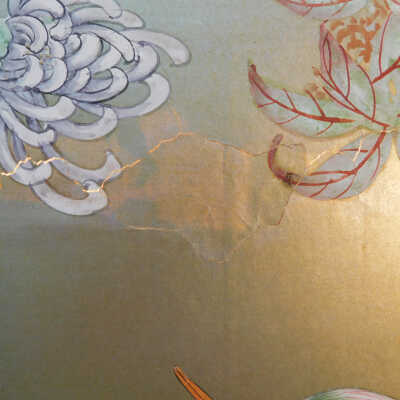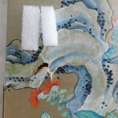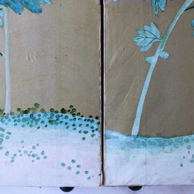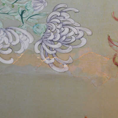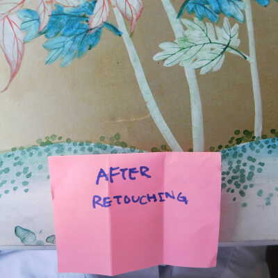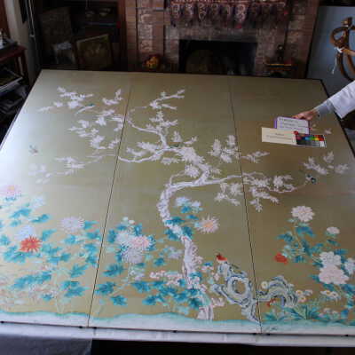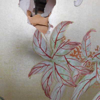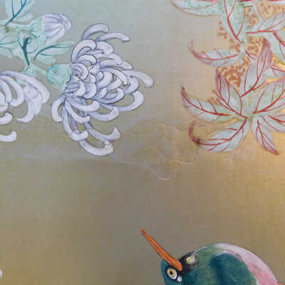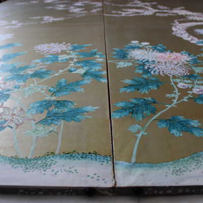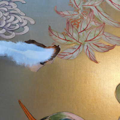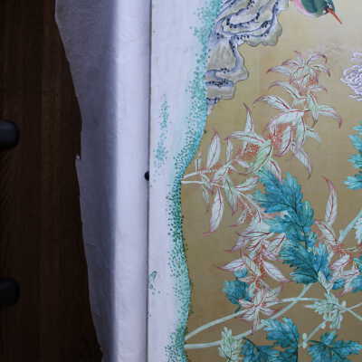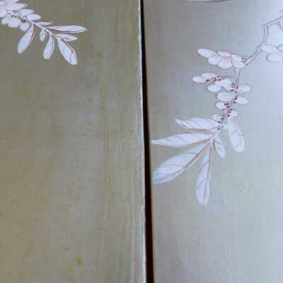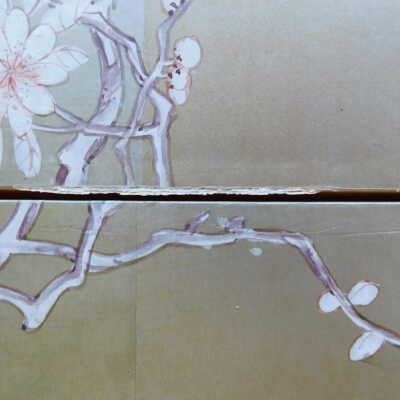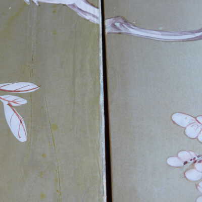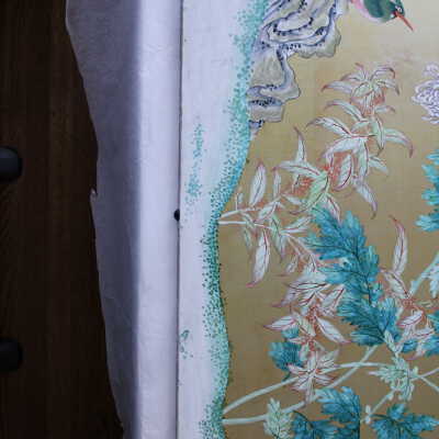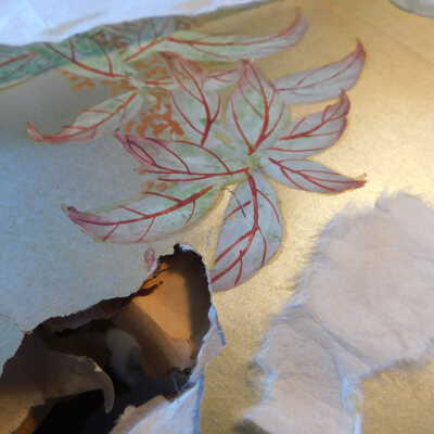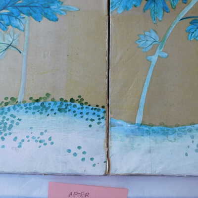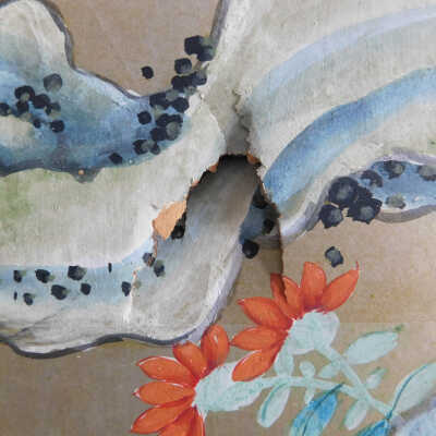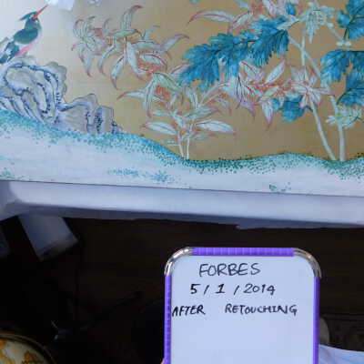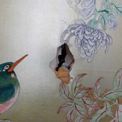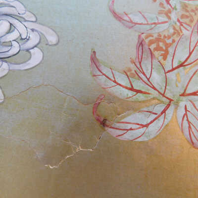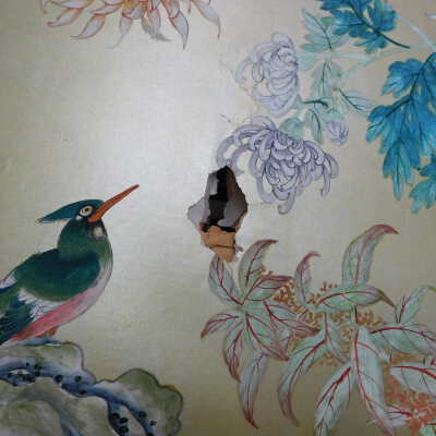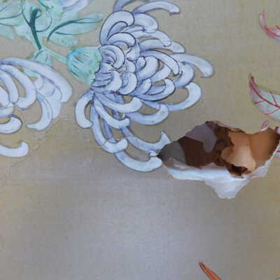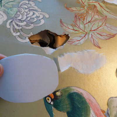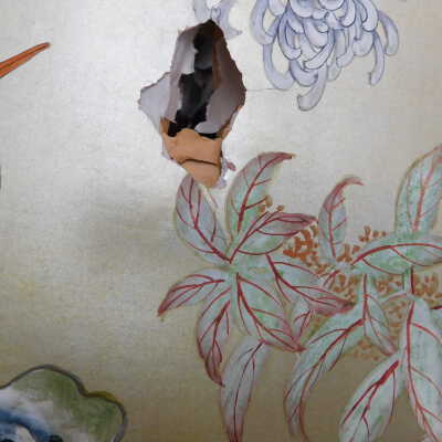 Retouched front side of large puncture, applied clear gesso in the tear gaps to make the surface level. Retouched tears with metallic watercolor. Retouched details on bottom of screen near flaking hinge.Acute Treatment