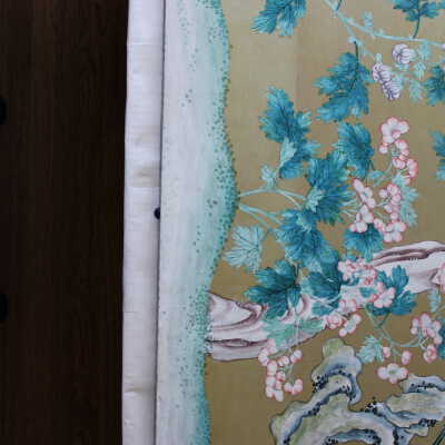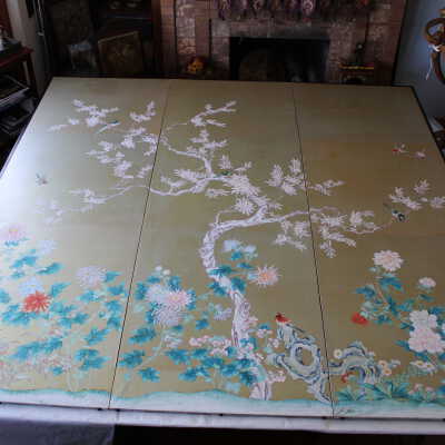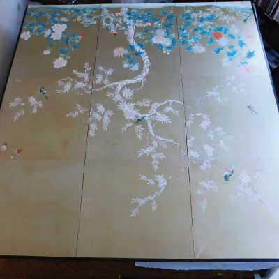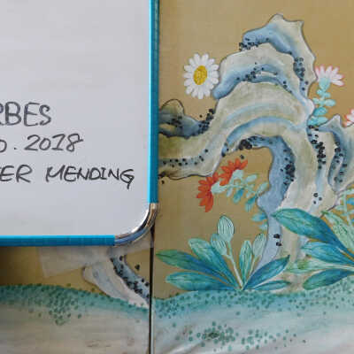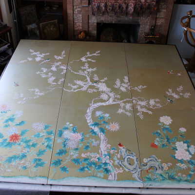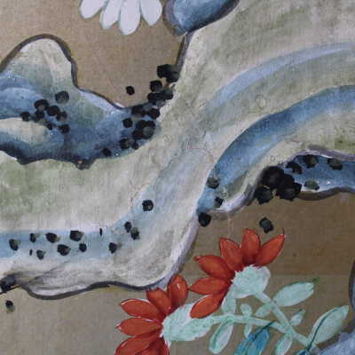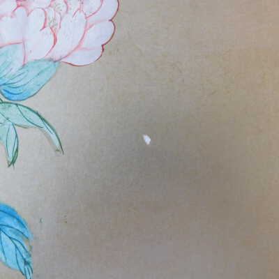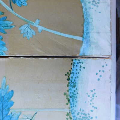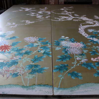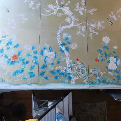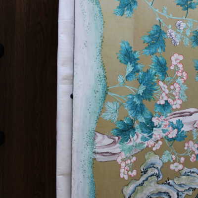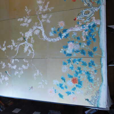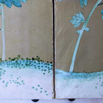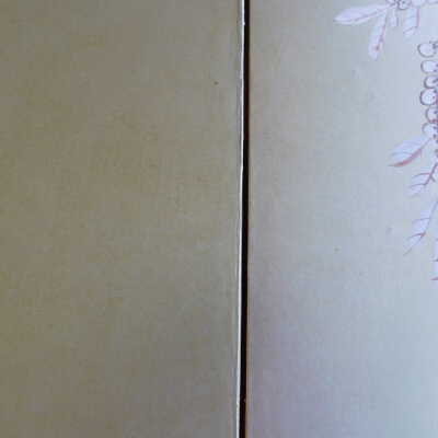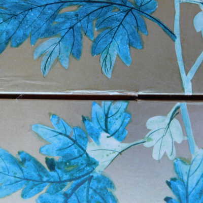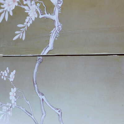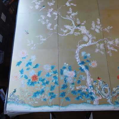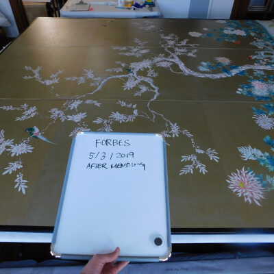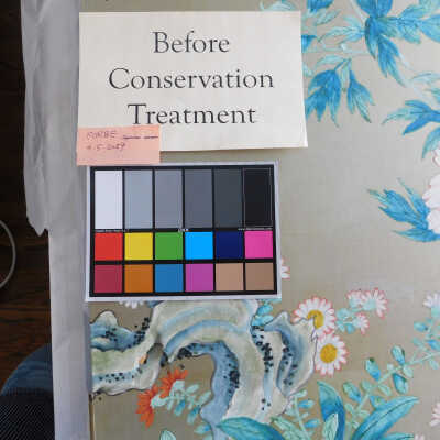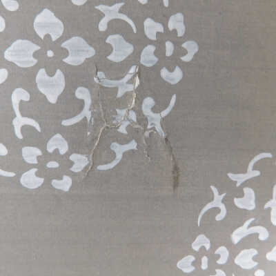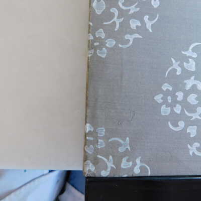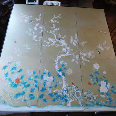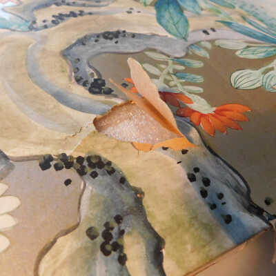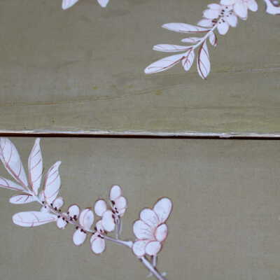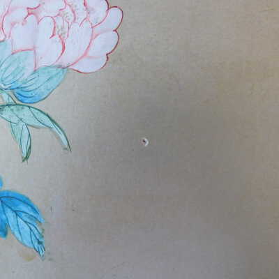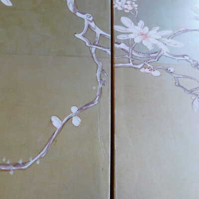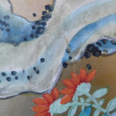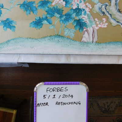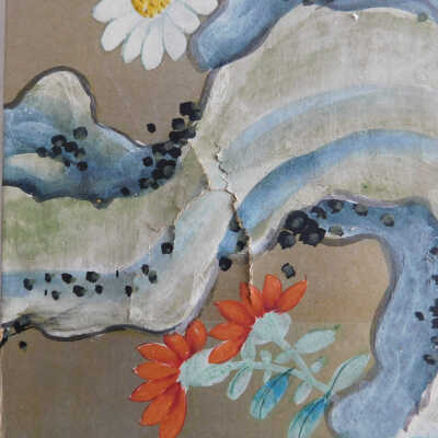 Retouched front side of large puncture, applied clear gesso in the tear gaps to make the surface level. Retouched tears with metallic watercolor. Retouched details on bottom of screen near flaking hinge.Acute Treatment