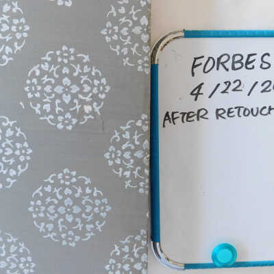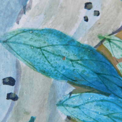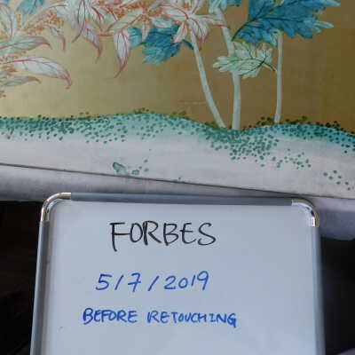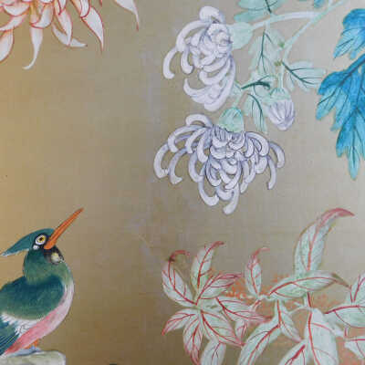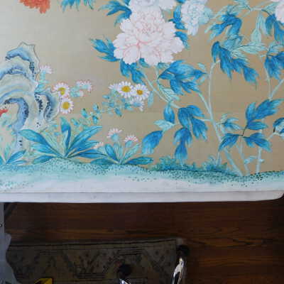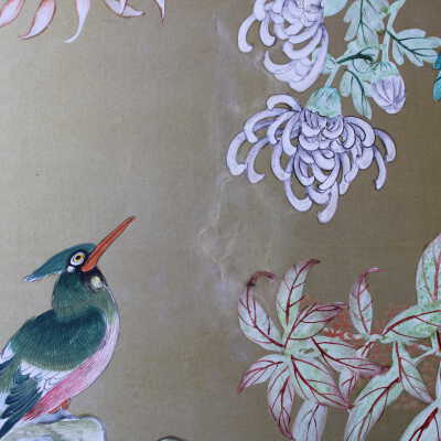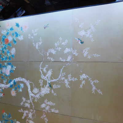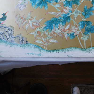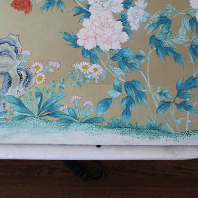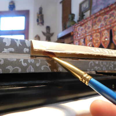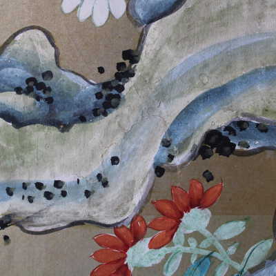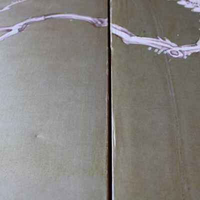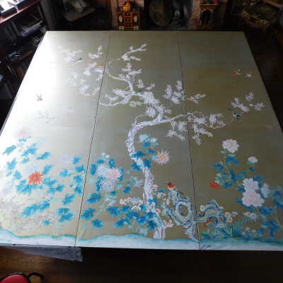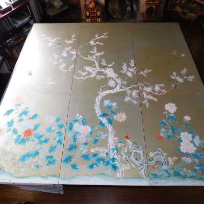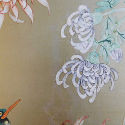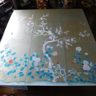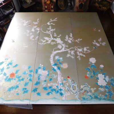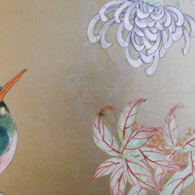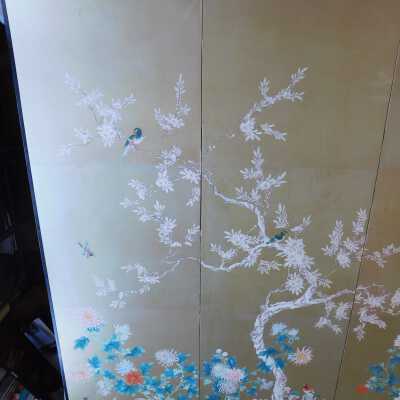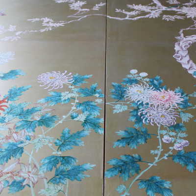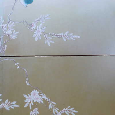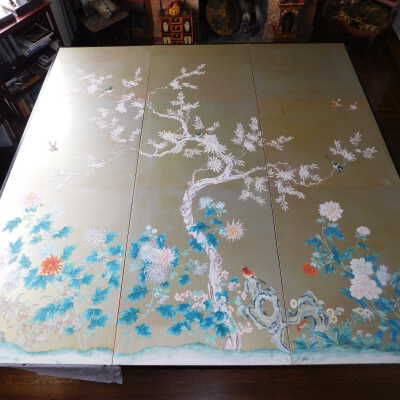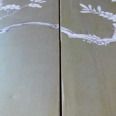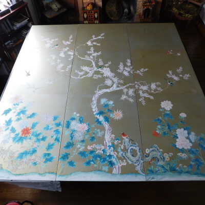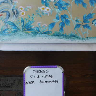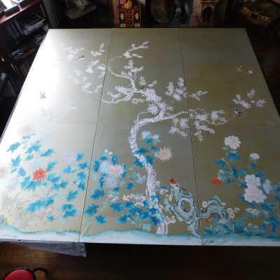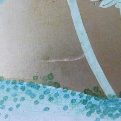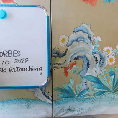 Retouched front side of large puncture, applied clear gesso in the tear gaps to make the surface level. Retouched tears with metallic watercolor. Retouched details on bottom of screen near flaking hinge.Acute Treatment