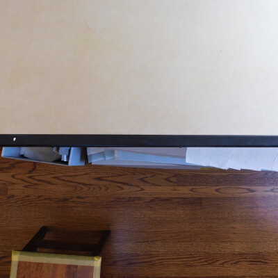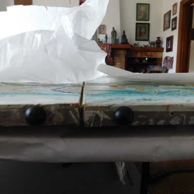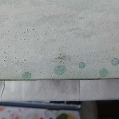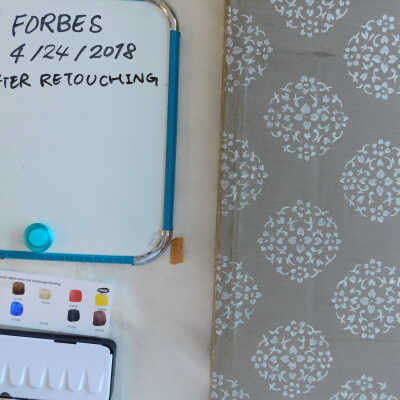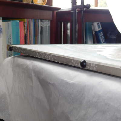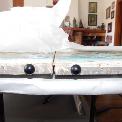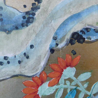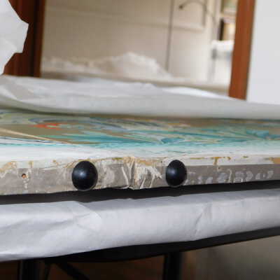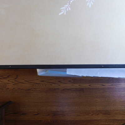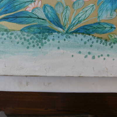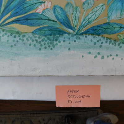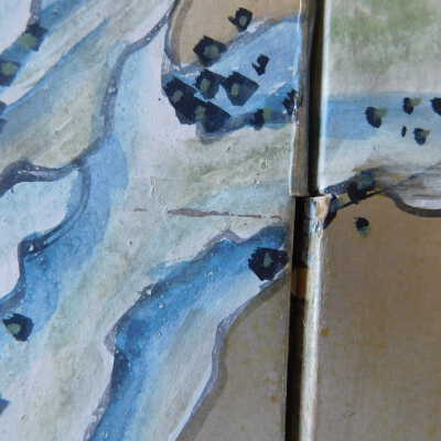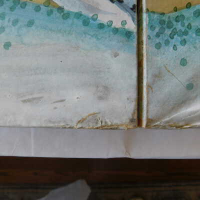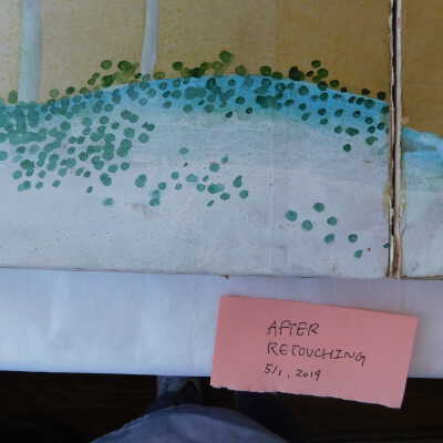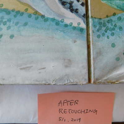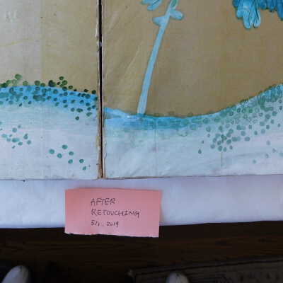 Retouched Bottom part of front side, retouch hole repairs with acrylics mixed with gloss medium (mars black and bone black). Retouched dirty tideline at the bottom of the screen. Attempted cleaning the dirty spot at the top of screen and retouched.Acute Treatment