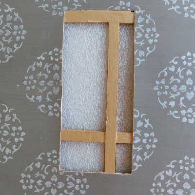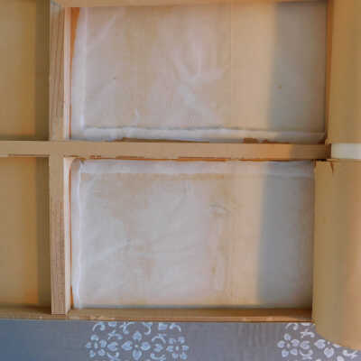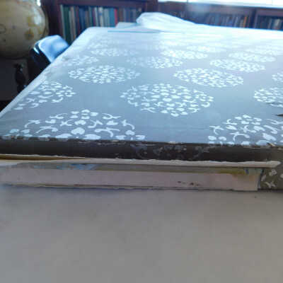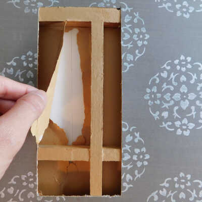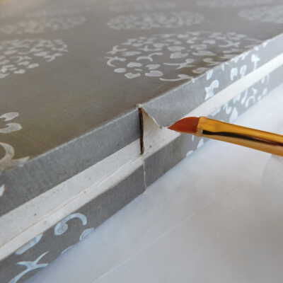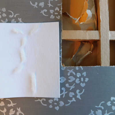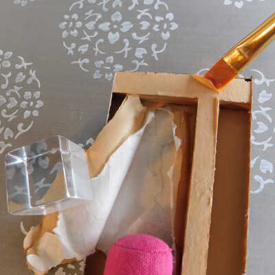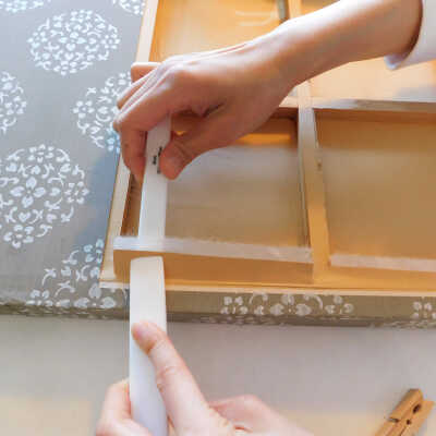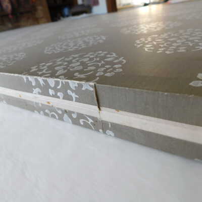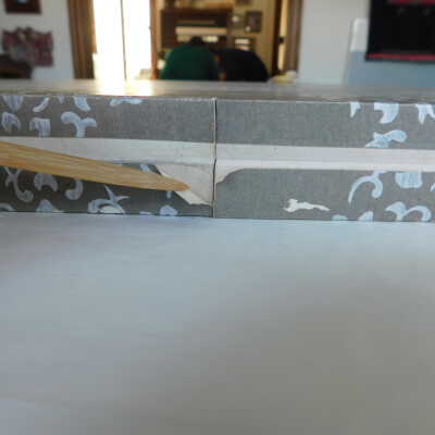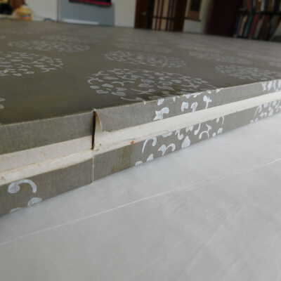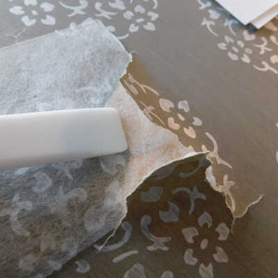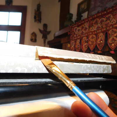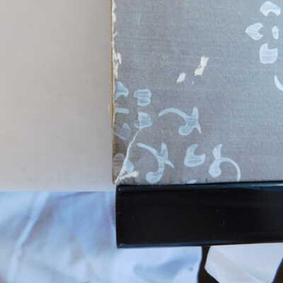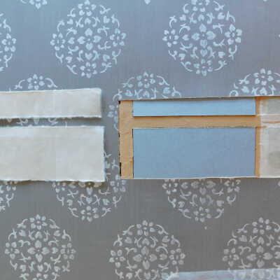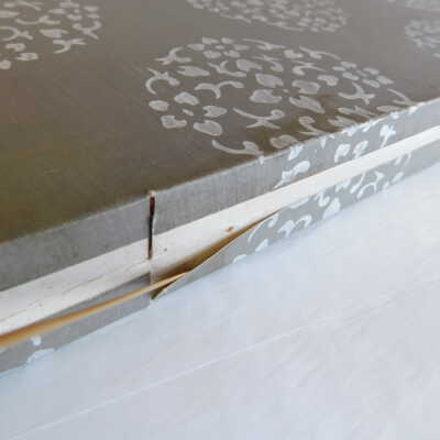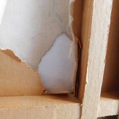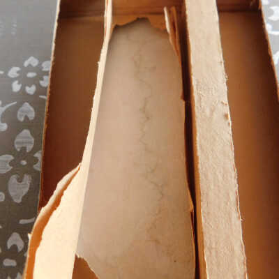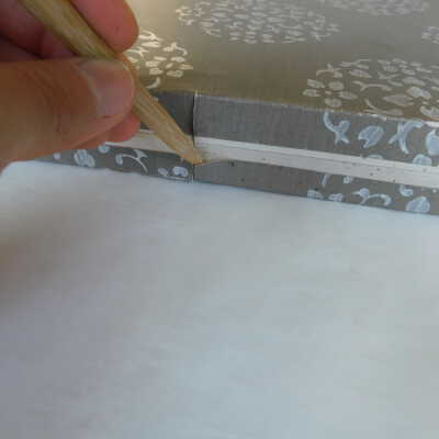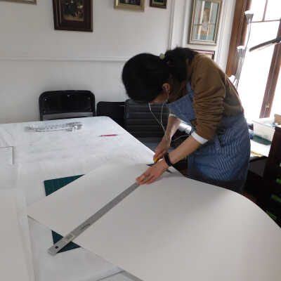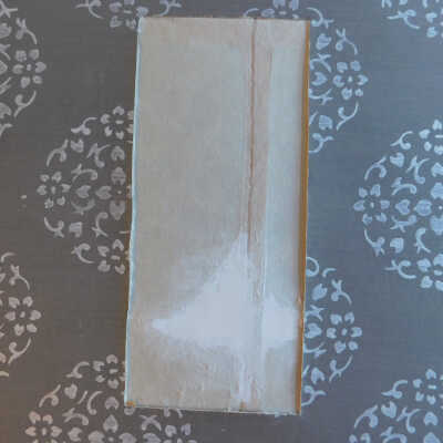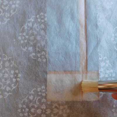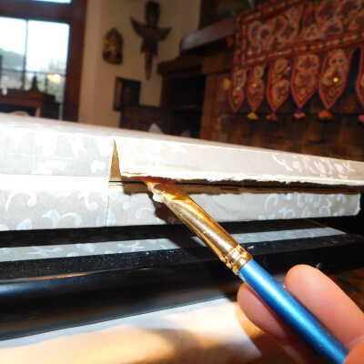 Tearing a piece of Japanese paper for lining. Also cut a piece of cardboard, Hollytex, and blotting paper to the gift size to tuck them under the lining for support. Pressed the lining and let it dry.Acute Treatment