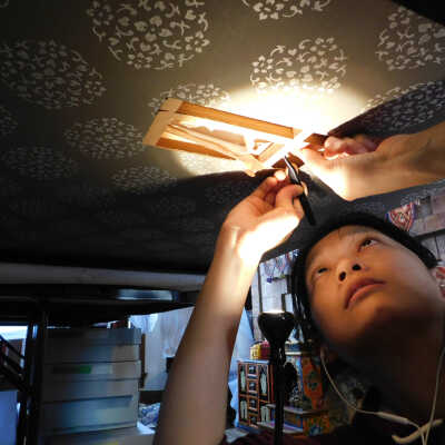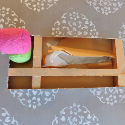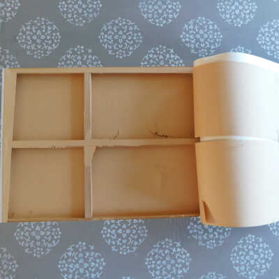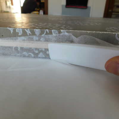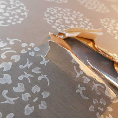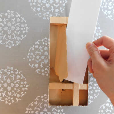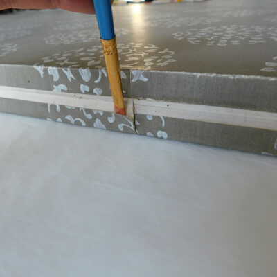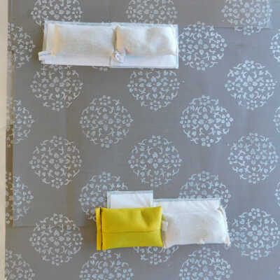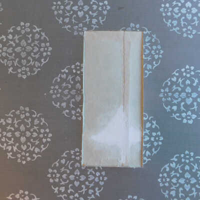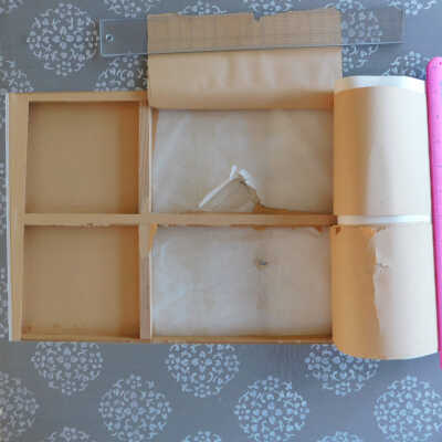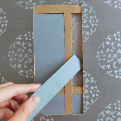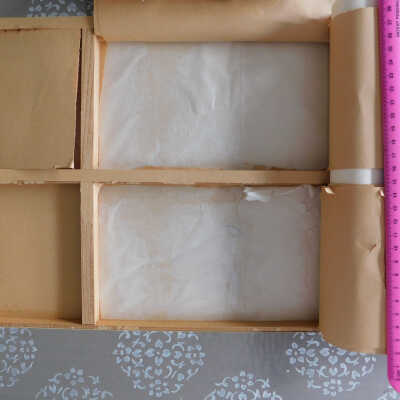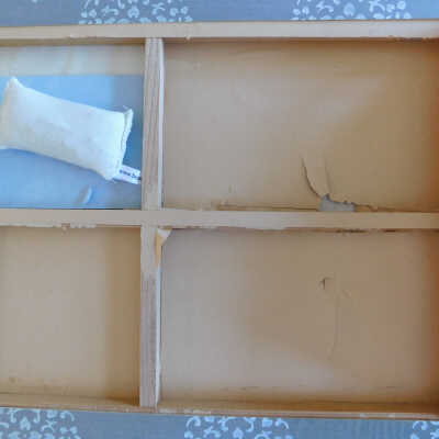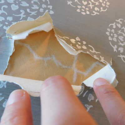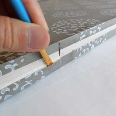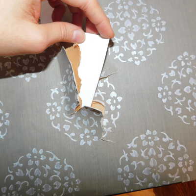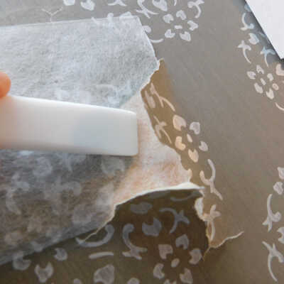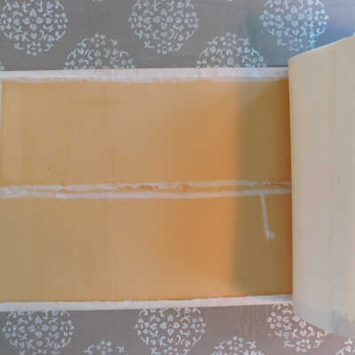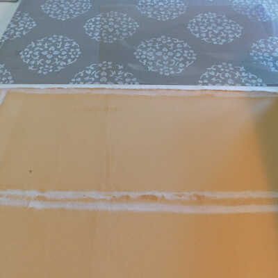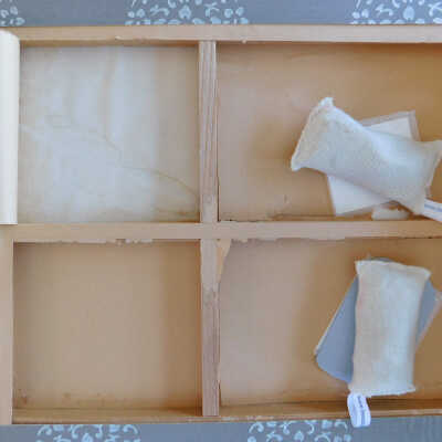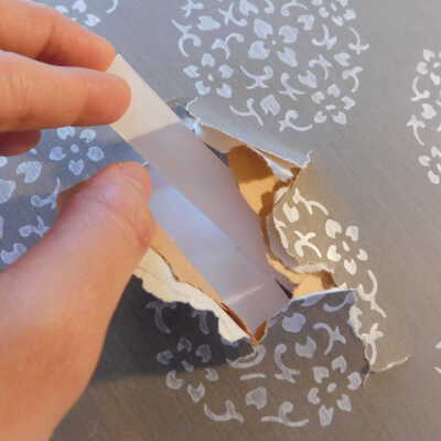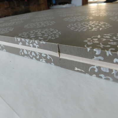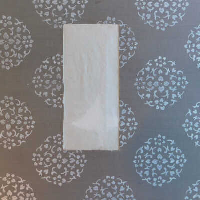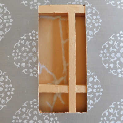 Tearing a piece of Japanese paper for lining. Also cut a piece of cardboard, Hollytex, and blotting paper to the gift size to tuck them under the lining for support. Pressed the lining and let it dry.Acute Treatment