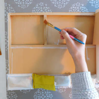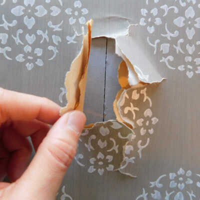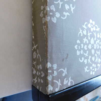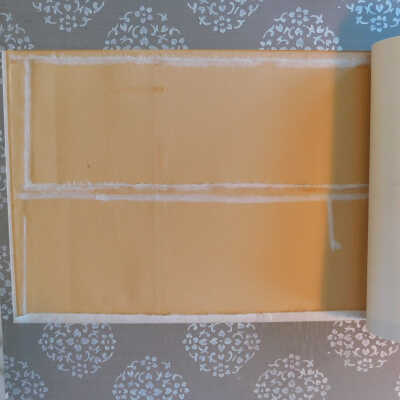 Closed the cut on back of big puncture using Japanese paper strips as hinges on the side. Mended tears with Japanese strips and starch paste. Attached yellow paper to wood frame. Mended cut edges with paper strips for stabilization. Attached gray pattern paper to Japanese paper hinge.Acute Treatment