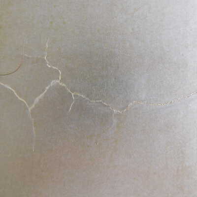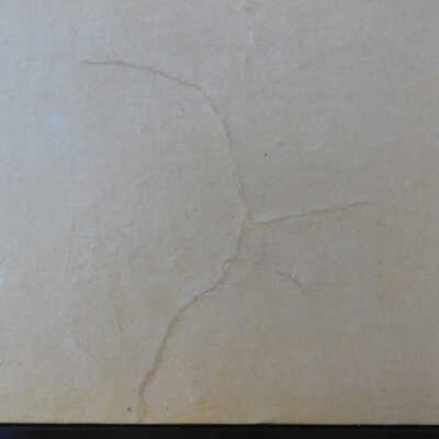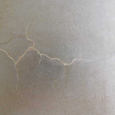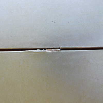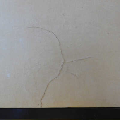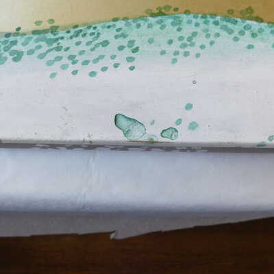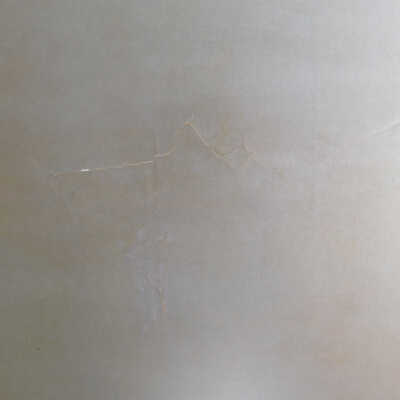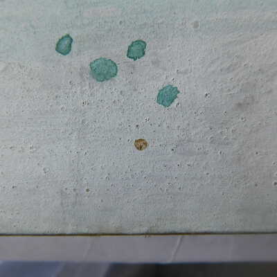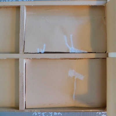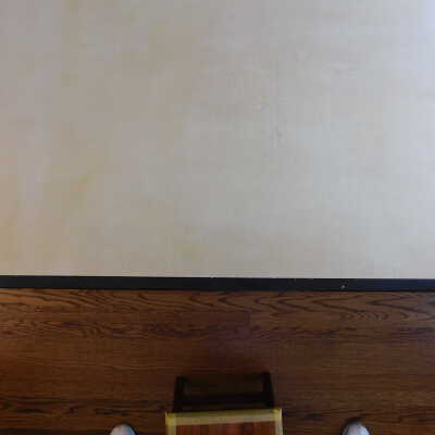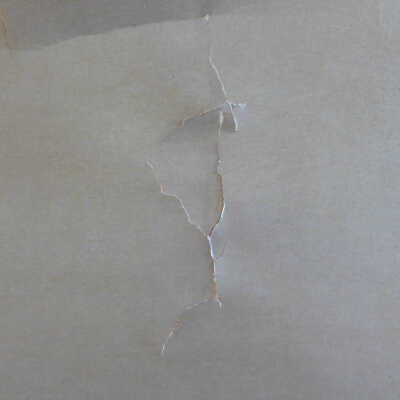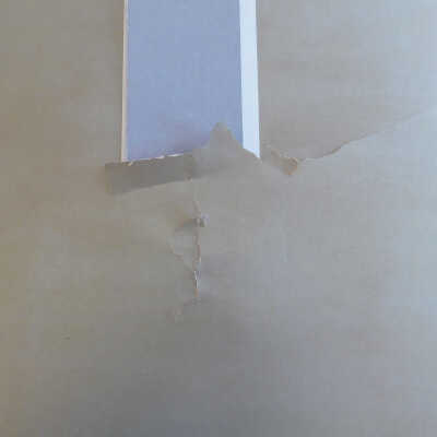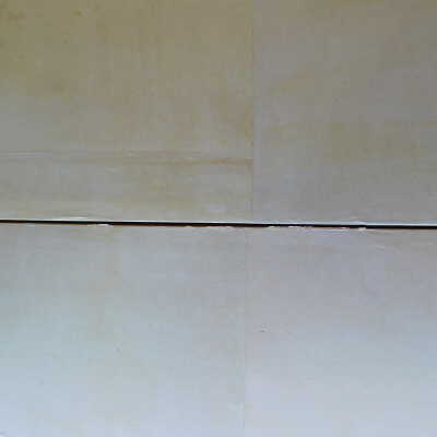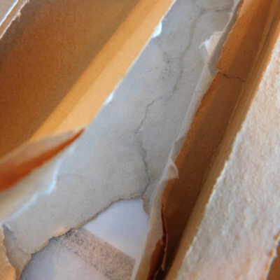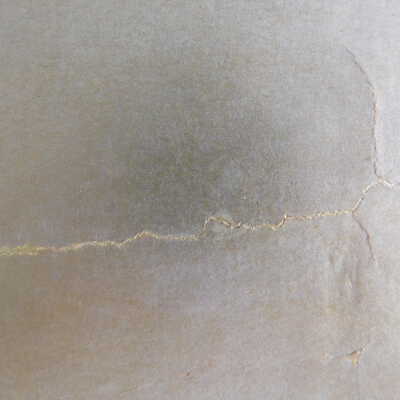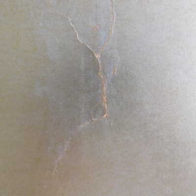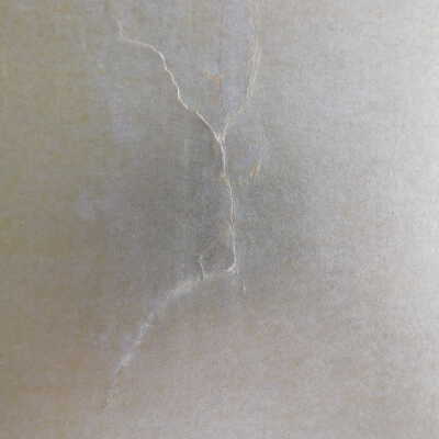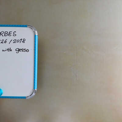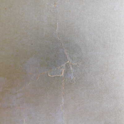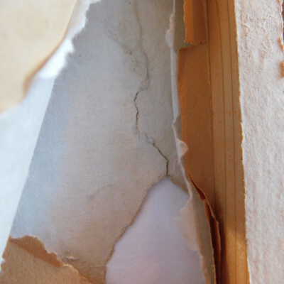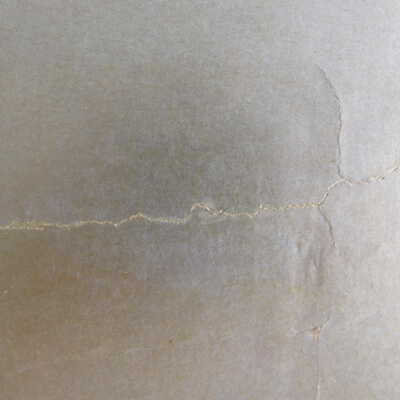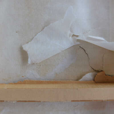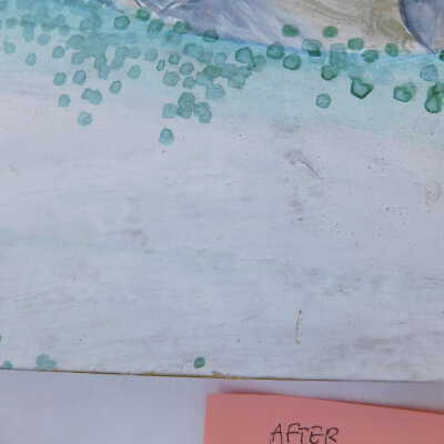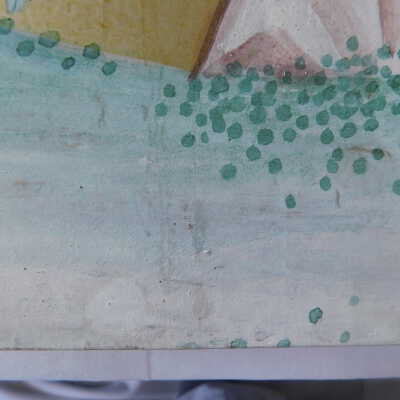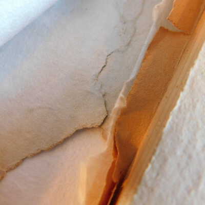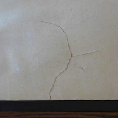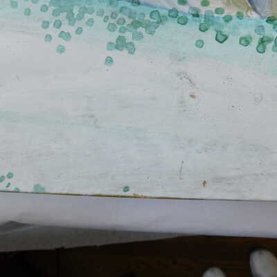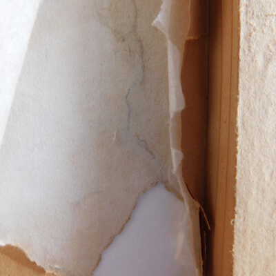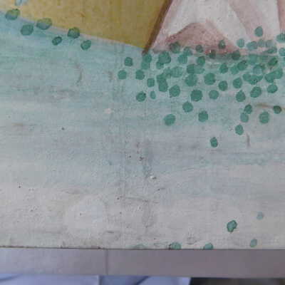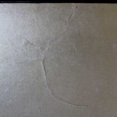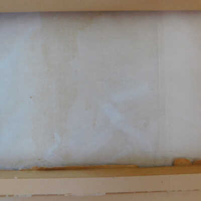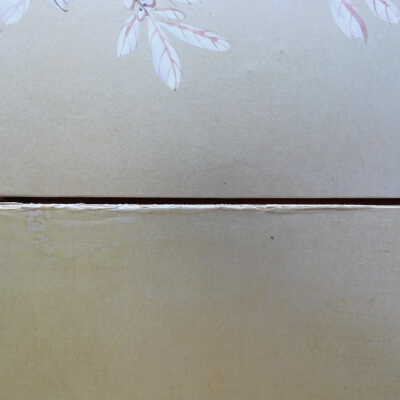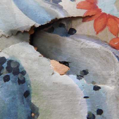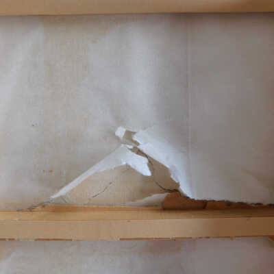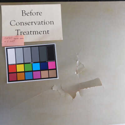For the smaller hole, measured the size of the hole and filled with Ethafoam, blotter paper, and blue board layers. For the bigger hole, patched the loose piece of the hole and put the edge fibers in order. Mended tears with Japanese paper strips and starch paste. For the smaller hoe, mended the first and second layers of the hole with Japanese paper strips and starch paste. Attached the third and fourth layers together, then attached this to the second layers. Pressed and dried overnight. For the bigger hole, mended the tears with Japanese paper strips. Mended some tears covered by wood with a piece of Japanese paper. For the smaller hole, attached the rest of the broken areas piece by piece with starch paste. For bigger hole, attached the original layers and mended tears with Japanese paper strips. For smaller hole, put the fiber of tears in order and smoothed surface. For bigger hole, attached remaining layers and mended. For smaller hole, retouched the edge gap of tears. Filled uneven surface with Modostuc. Sanded the Modostuc.Acute Treatment