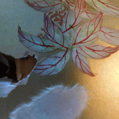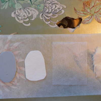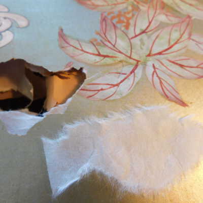 Put the fiber and the bevel of the tears in order from the front side. Attached the fiber and the bevel. Pressed the tears and let it dry. Chose Japanese paper and tear into strips. Mending tears using strips, pressing into sandwich layers. For the bigger hole, put fiber and bevel of the tears in the right order and attached them.Acute Treatment