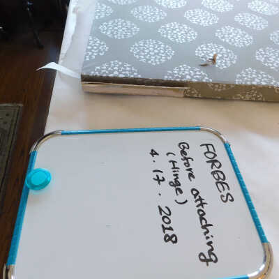 Attached hinge on back side and re-attached hinge on front side (broke again).