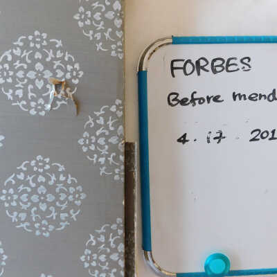 For small puncture on back, adjusted thickness of foam and mended tears. Attached hinge with starch pasteAcute Treatment