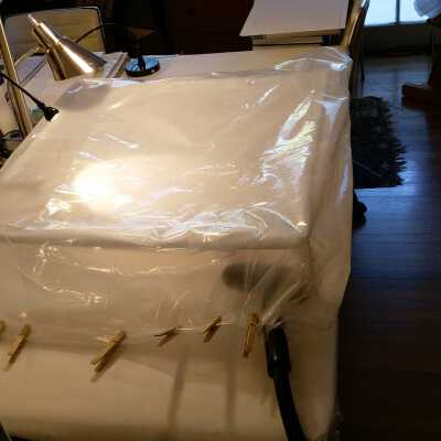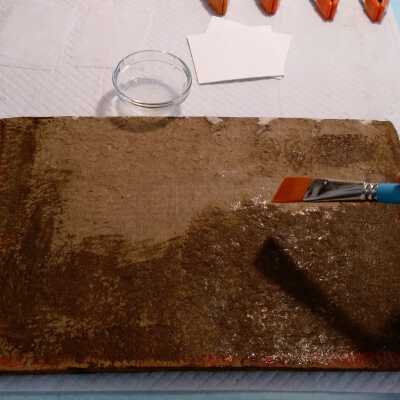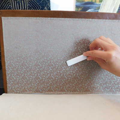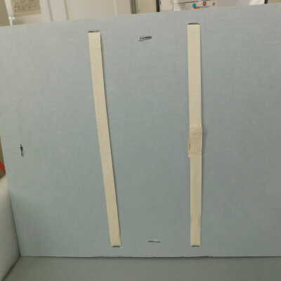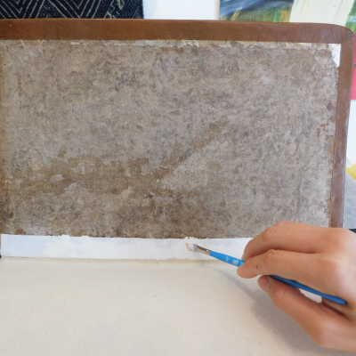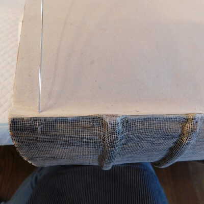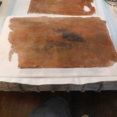 Polished the cover boards with teflon bone folder. Sized boards with methyl cellulose. Fixed the corners with wheat paste and clips. Removed backing of label. Put label in tray with Pellon layer. Used fingers to rub and peel off the backing. Fixed corners with wheat paste again. Mended tears again. Reattached leaves to book block. Sanded boards and filled holes and losses with Modostuc. Peeled the cords and uneven surface of the boards. Sanded until smooth.Acute Treatment