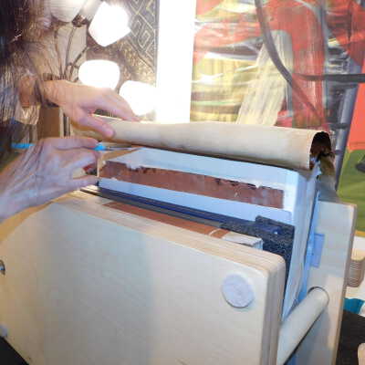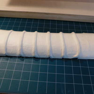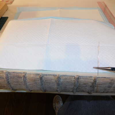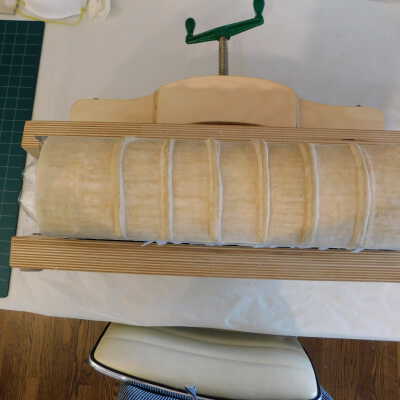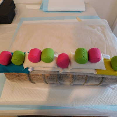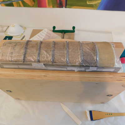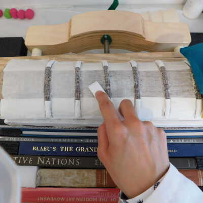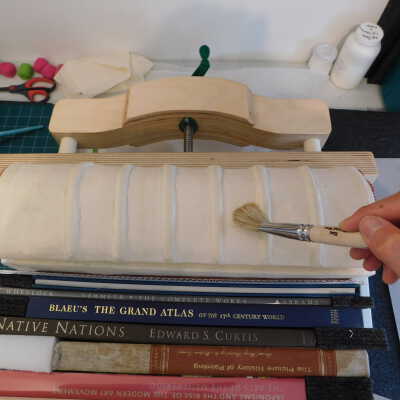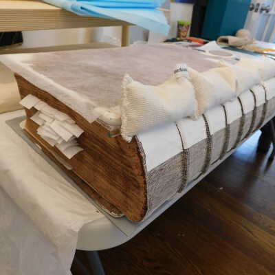 Paste endsheets on textblock and press them. Assembled book press and pressed book. Fixed plastic wrap to spine of book. Used Japanese paper to make case for the spine to have hollow back. Pasted many layers of Japanese paper on plastic wrap and rubbed with bone folder and stiff brush. Pressed case and let it dry. Removed case from spine and drew arrow in bottom part. Used modostuc to shape cover board and sanded. Strengthened end sheets by sewing them to spine. Pricked end sheet and spine with long needle. Waxed the thread and sewed the book using saddle stitch.Acute Treatment