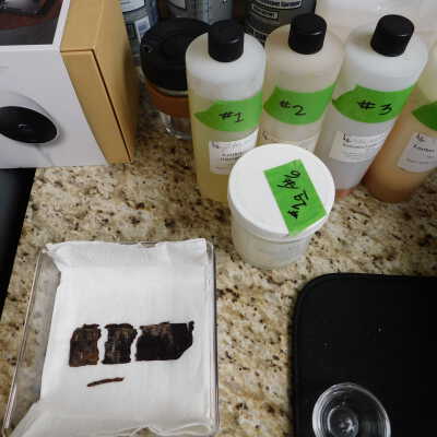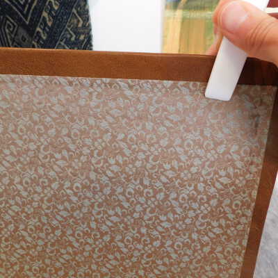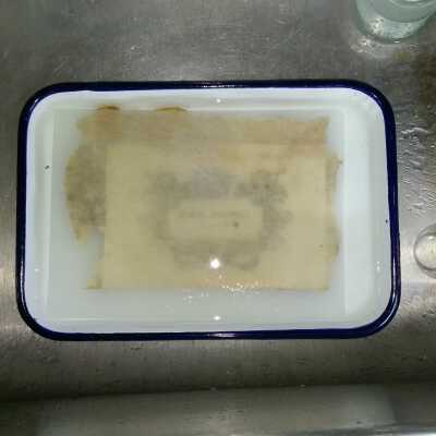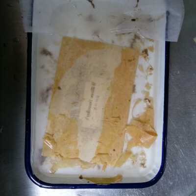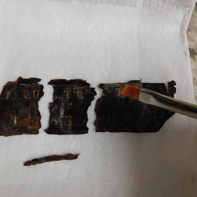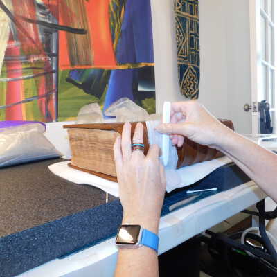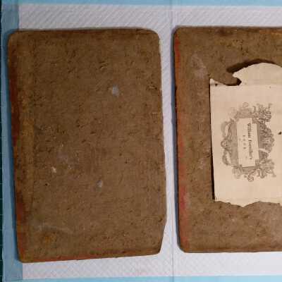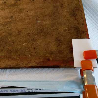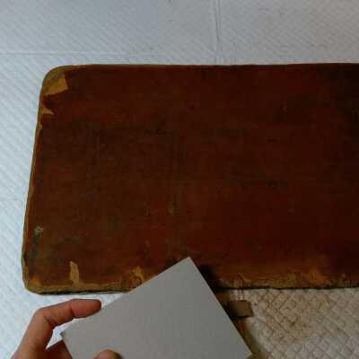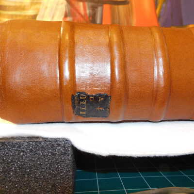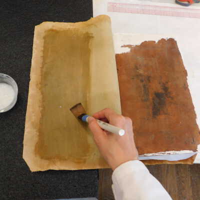 Took old leather off spine using dental tool. Lifted all residue from spine with dental tool and methyl cellulose (10%). Lifted original leather and press with spatula. Removed seals from covers, and removed paste-downs.Acute Treatment