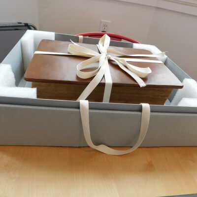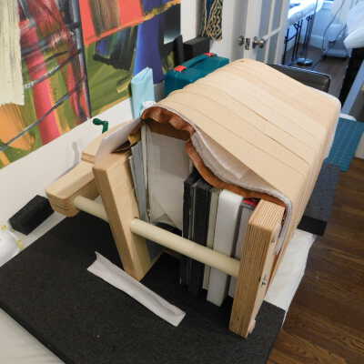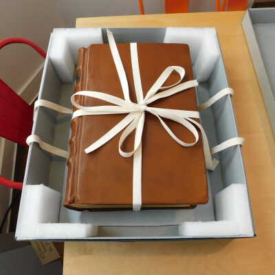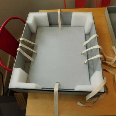 Used pre-made blueboard box and extended height using strips of blueboard and remay tape. Glued ethafoam blocks to create bumper corners for tray. Laminated two sheets of blueboard with 1" margin of book. Cut out slots from tray for single length of twill tape to run through and create handles to lift book on tray. Secured handles with sewn on velcro strips. Cut out slots from tray for twill tape ribbons to hold book in place on top and bottom. Adhered volara to lid of box to protect book cover. Created belt of twill tape to secure lid to bottom of box.