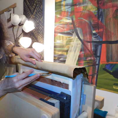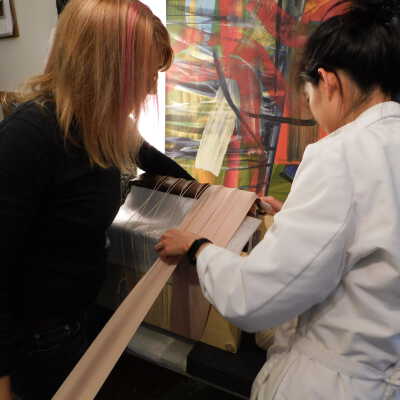 Vacuumed three single sheets, humidified with water and alcohol (by chamber with steam). Flattened three single sheets. Humidified again and pressed sheets to remove part of backing, pressed all sheets. Removed residue of backing by localized humidification. Used Gore-Tex to humidify sheet again. Cleaned tears and pressed again. Trimmed off mending strips. Humidified covers. Mended tears of sheets.Acute Treatment