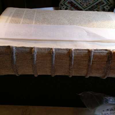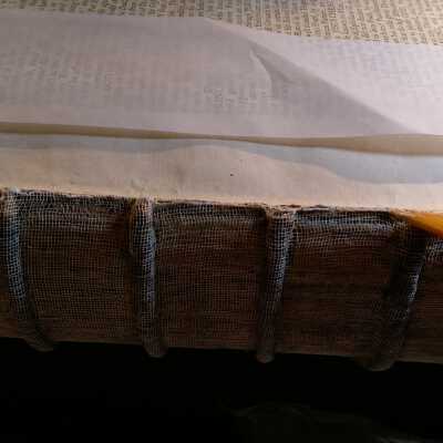 Glued piece of mesh fabric with Jade R and Beva gel (2:1) onto spine. Trimmed surplus mesh. Hinged three sheets, trimmed surplus mending strips. Lined part of sheet after removing residue backing. Mended tears, humidified and pressed again.Acute Treatment