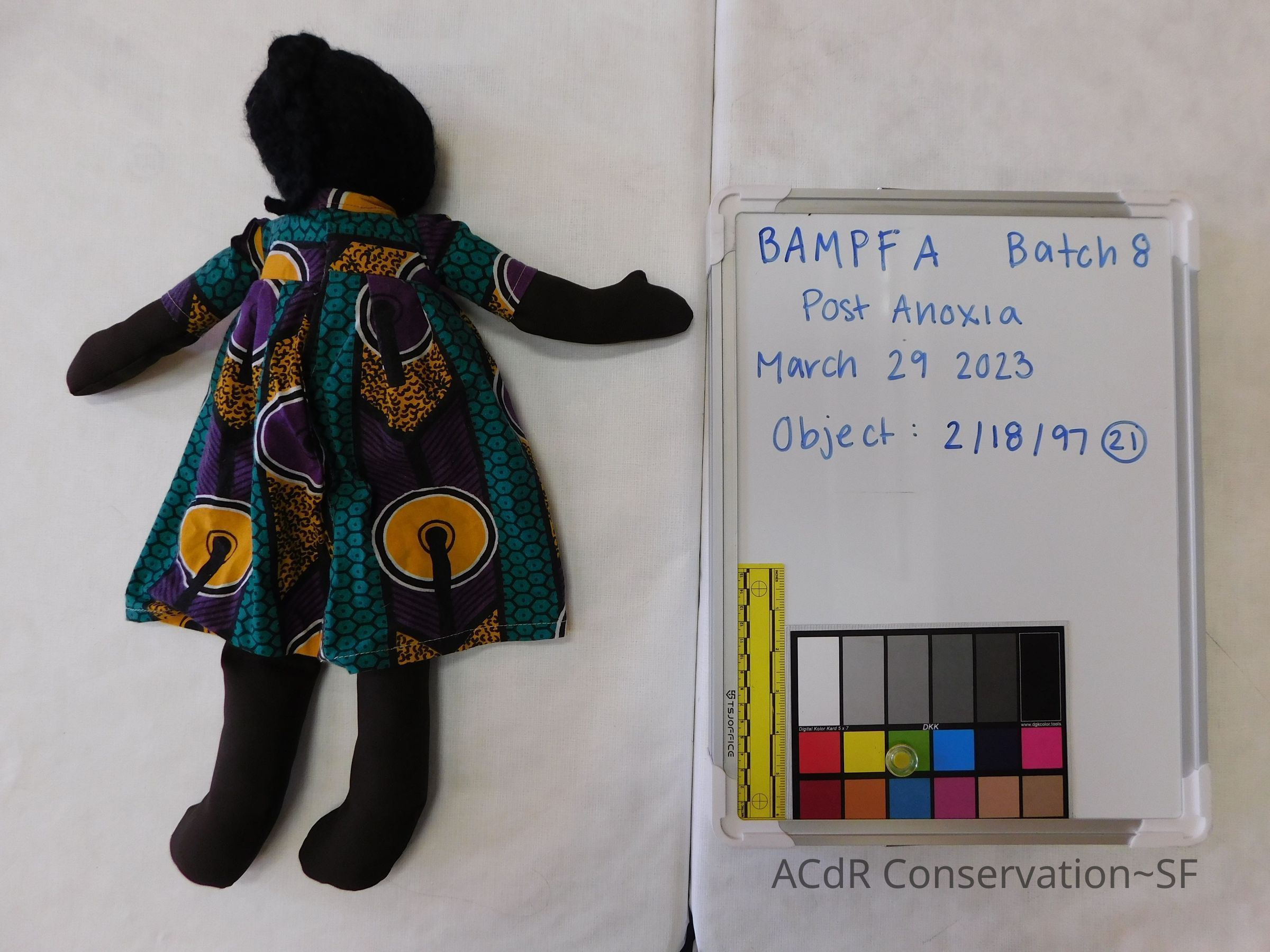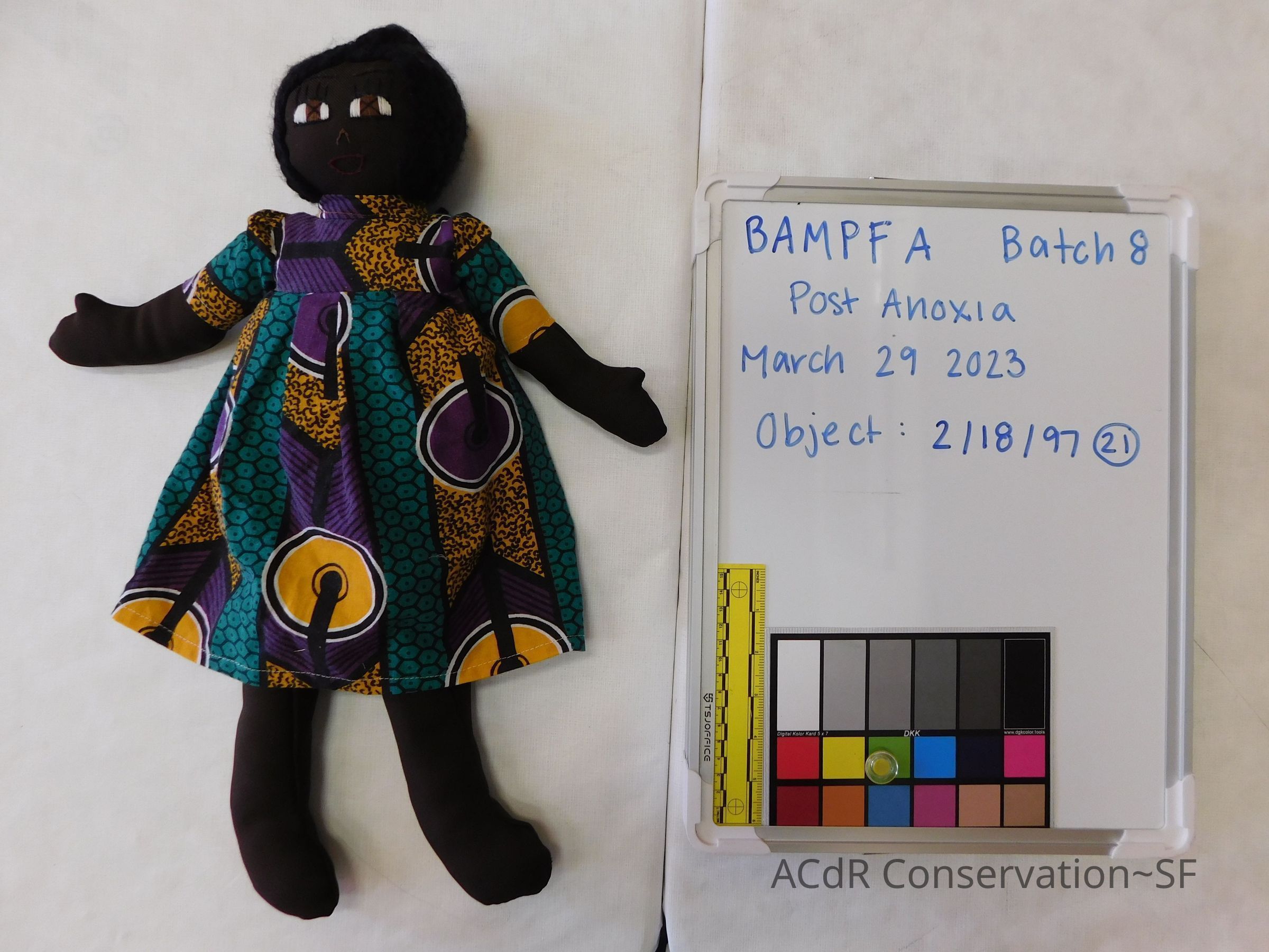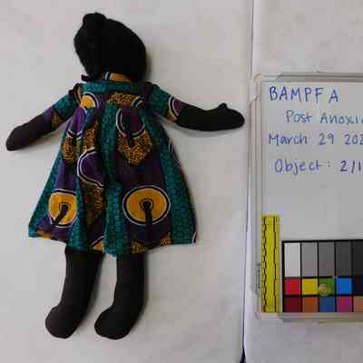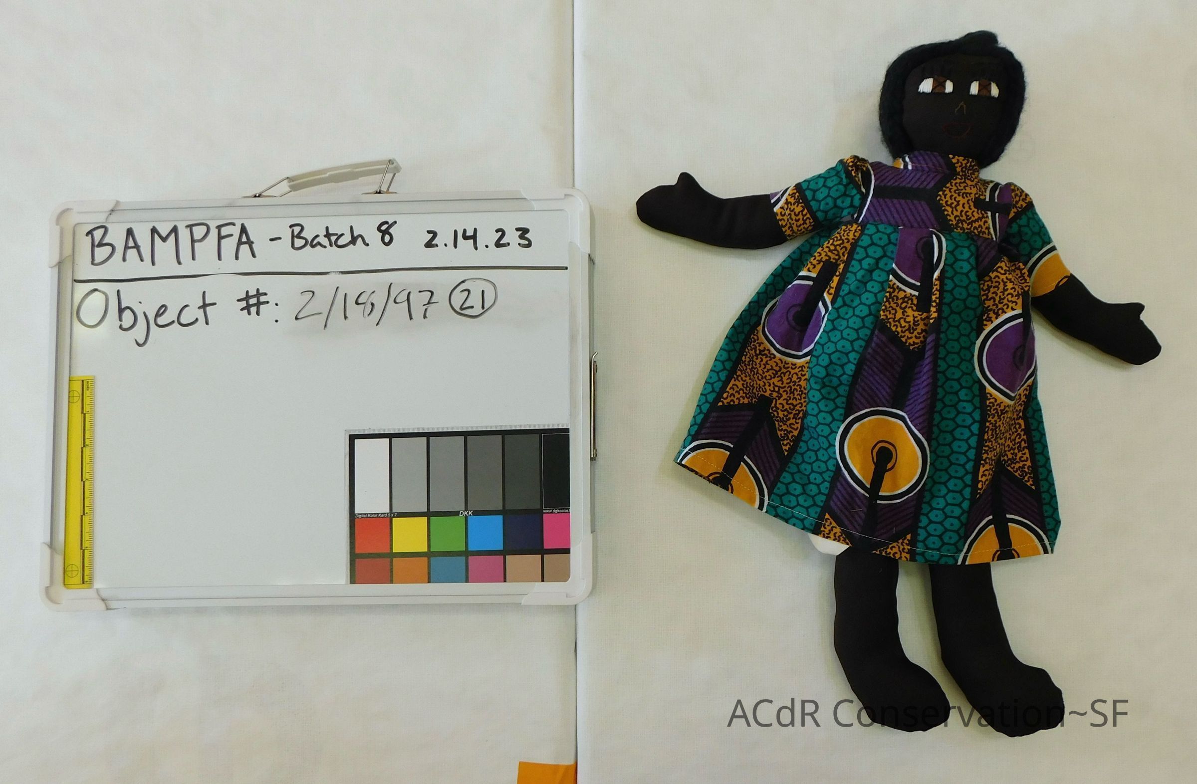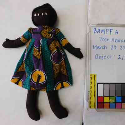 Cloth doll with purple, teal, and yellow dress and yarn hair