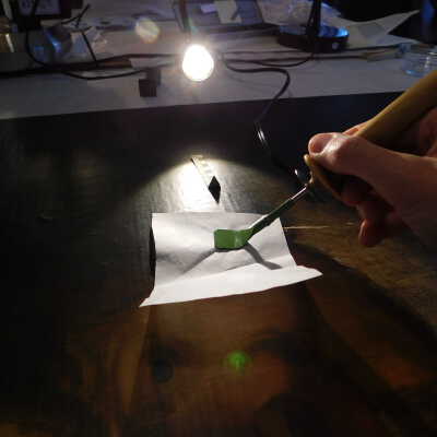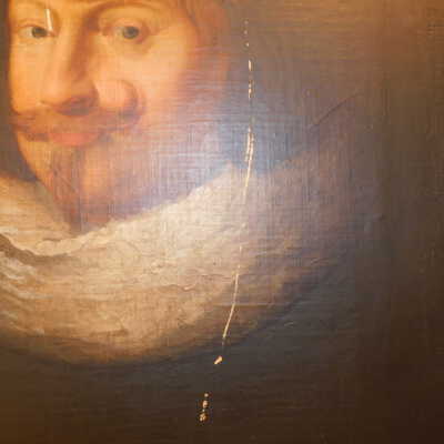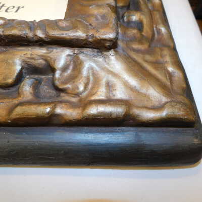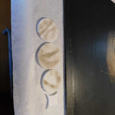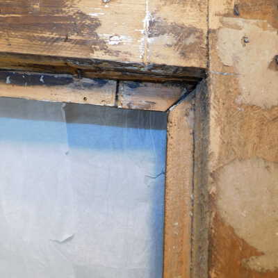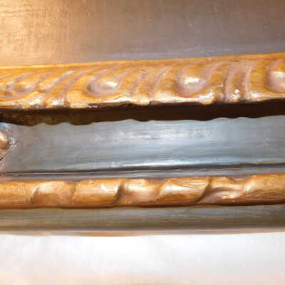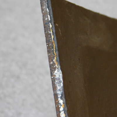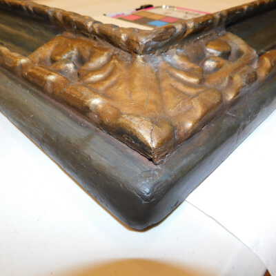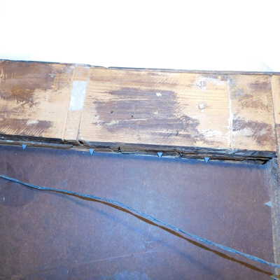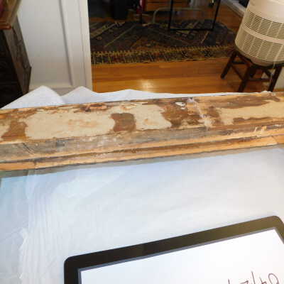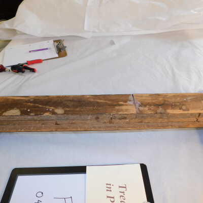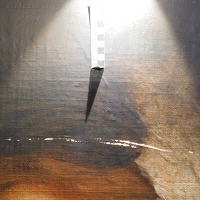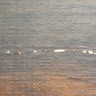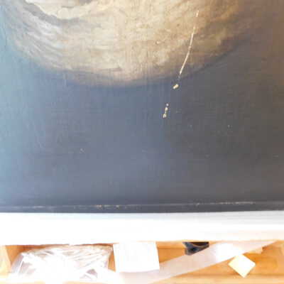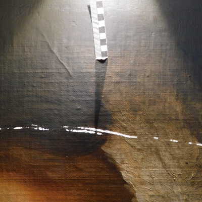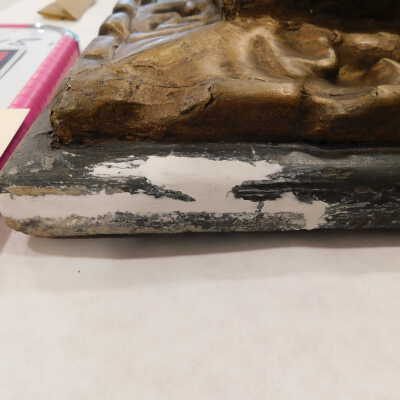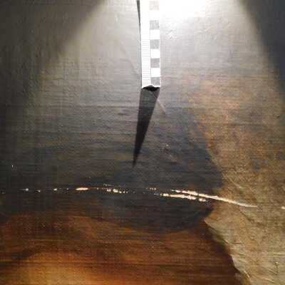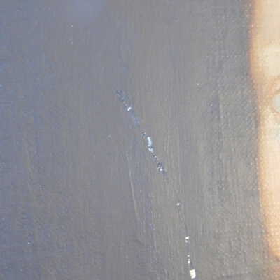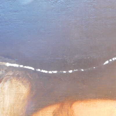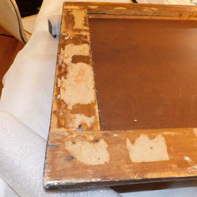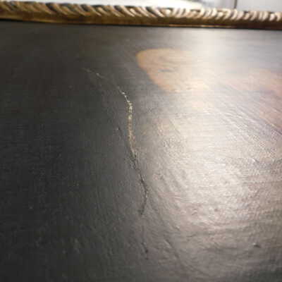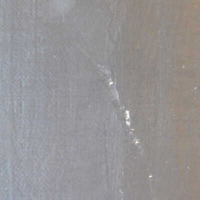 Surface clean with pH sponge and H2O. Infilled scratches. Considered inpainting without infilling, but at least losses should be filled due to rough surface. Several dented areas so scratch will still be visible. Covering dents with infilling material would not be desirableAcute Treatment