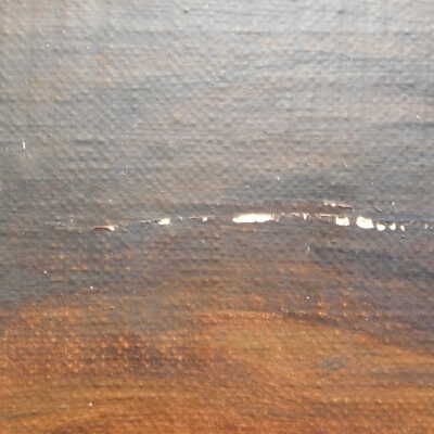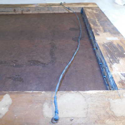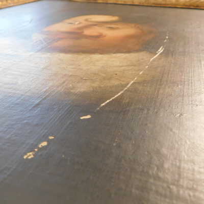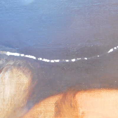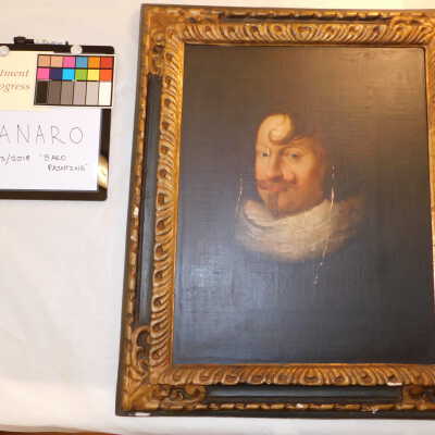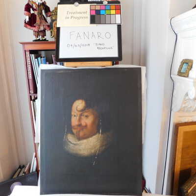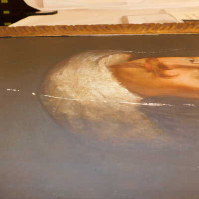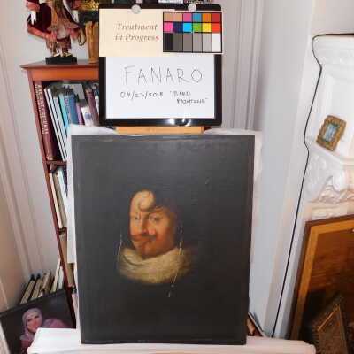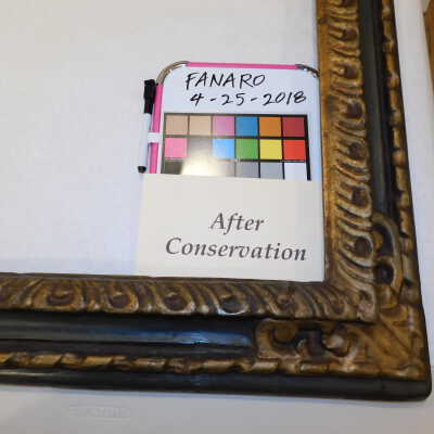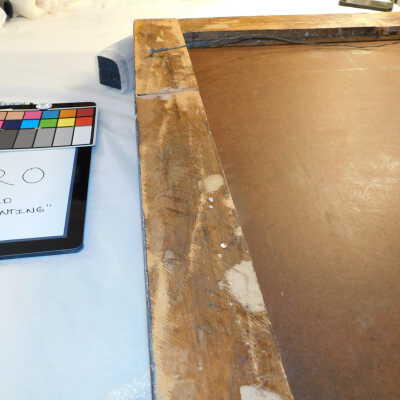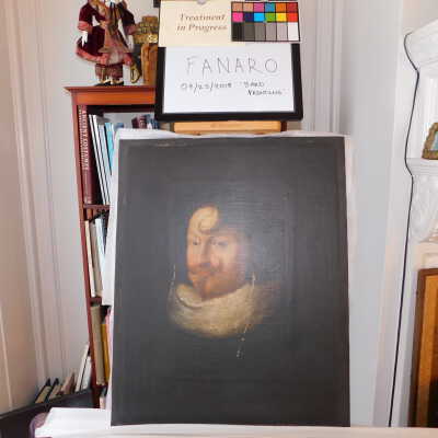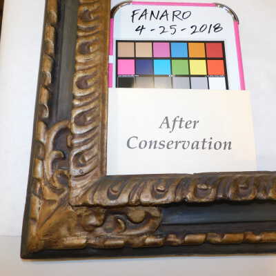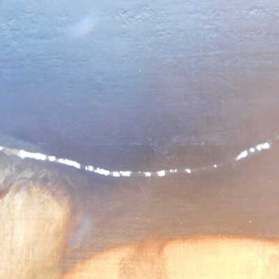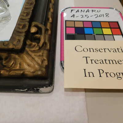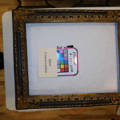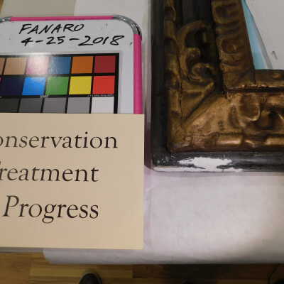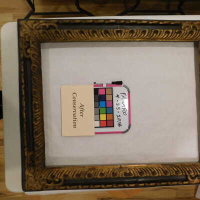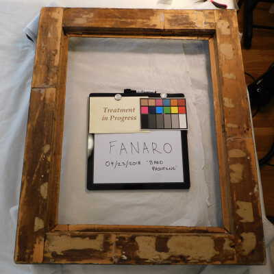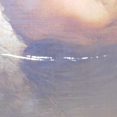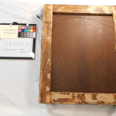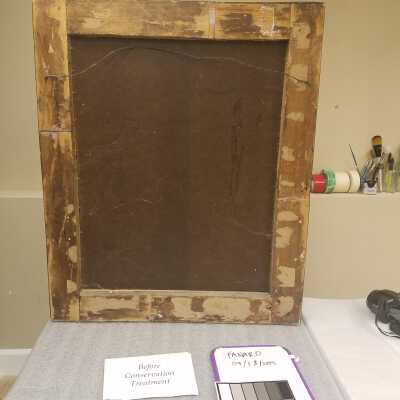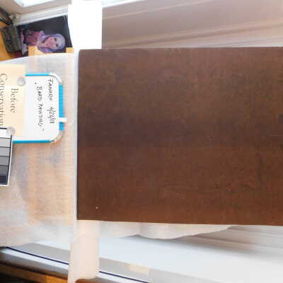 Infilling, sanding, and inpainting with watercolor. (See treatment log for colors used). Isolation with Regalrez (very thin). Varnish with BEVA (3:1-gloss:matte) and stabalizer