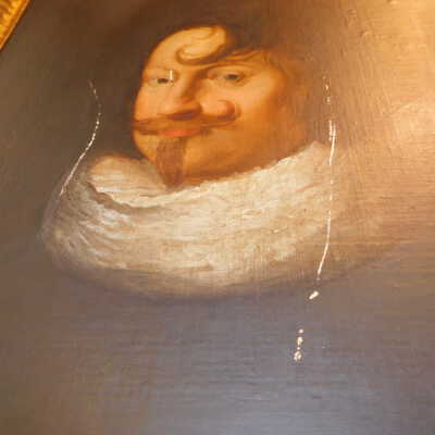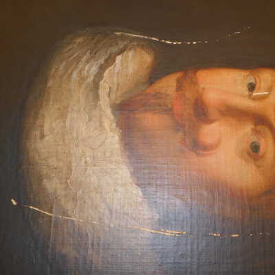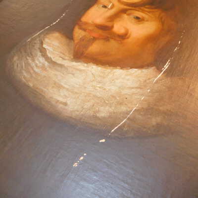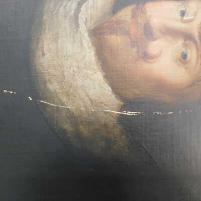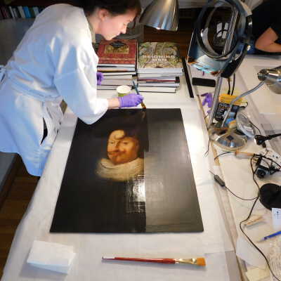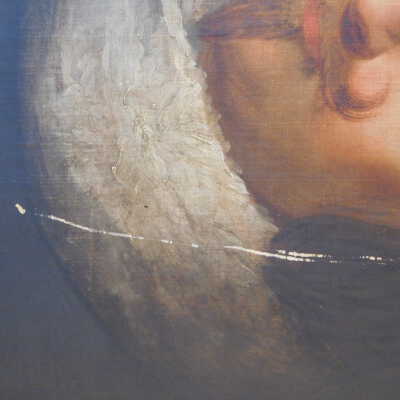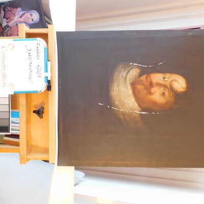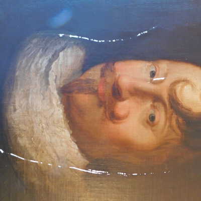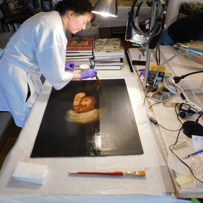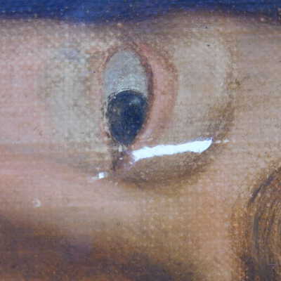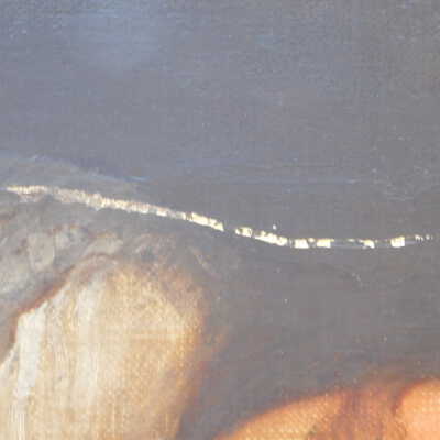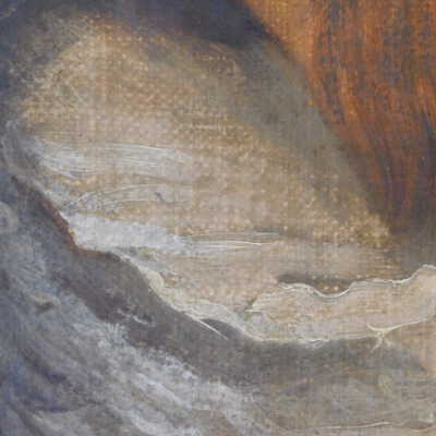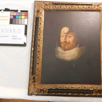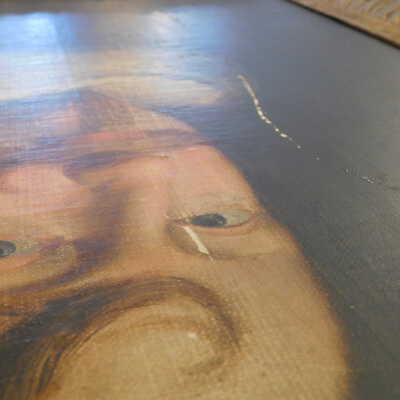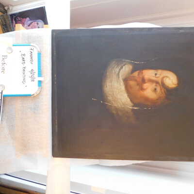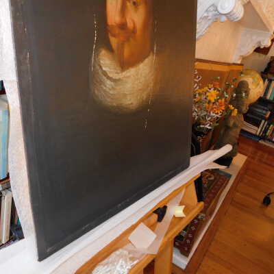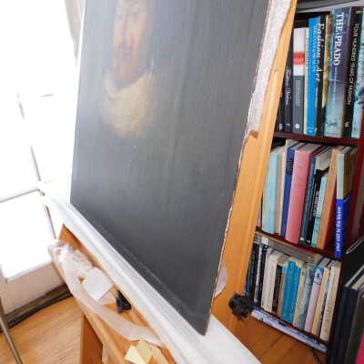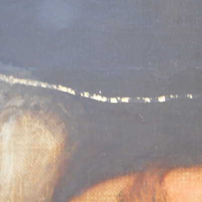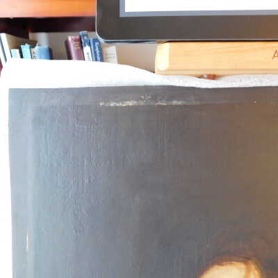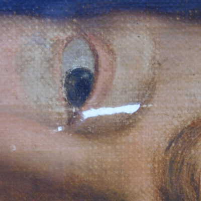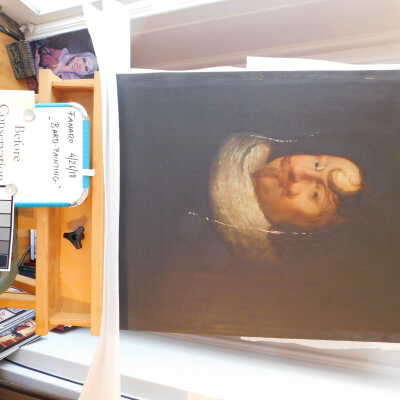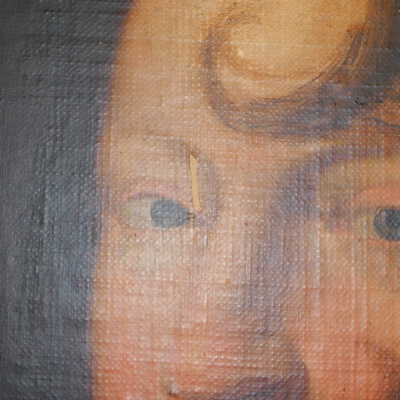 Infilling, sanding, and inpainting with watercolor. (See treatment log for colors used). Isolation with Regalrez (very thin). Varnish with BEVA (3:1-gloss:matte) and stabalizer