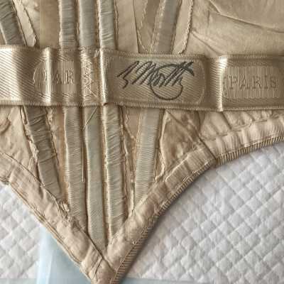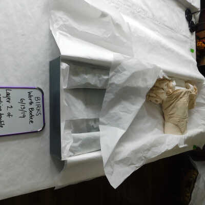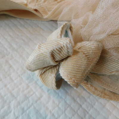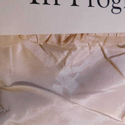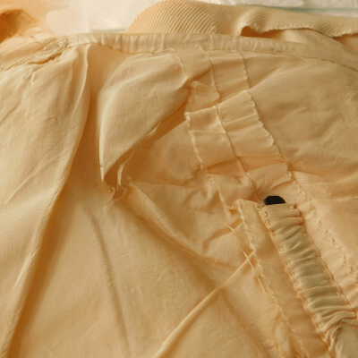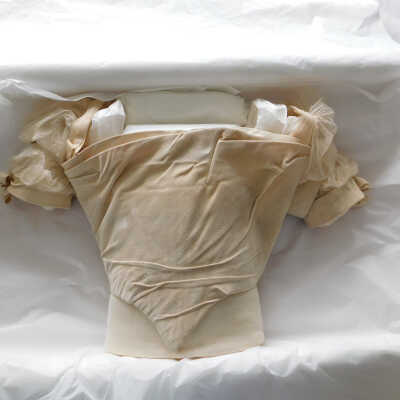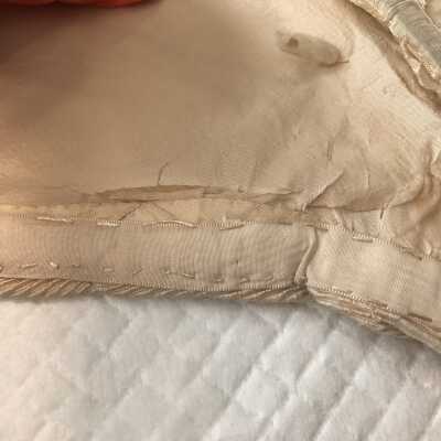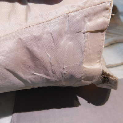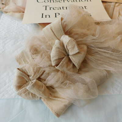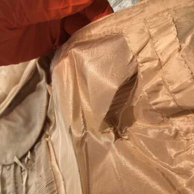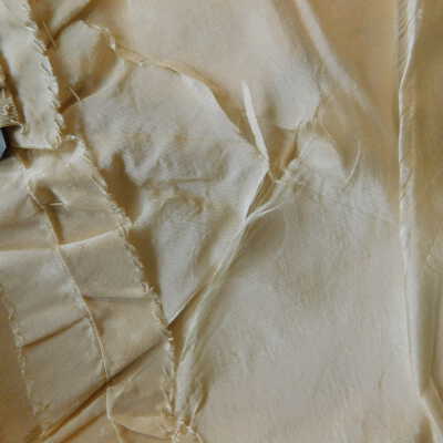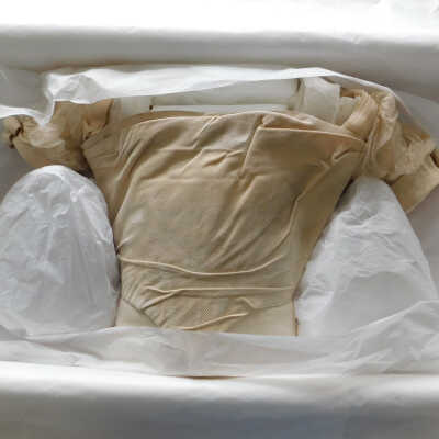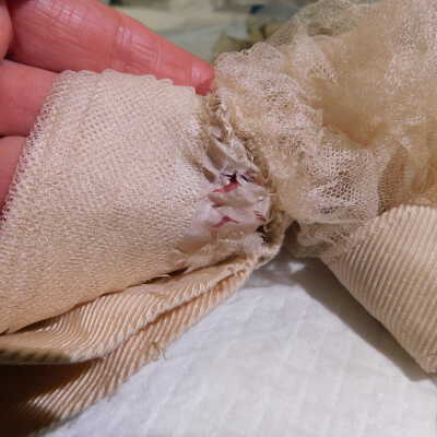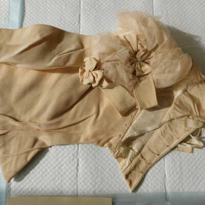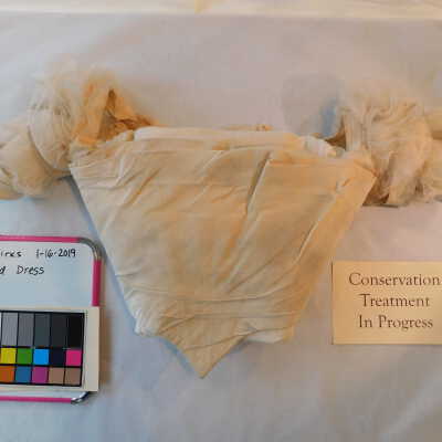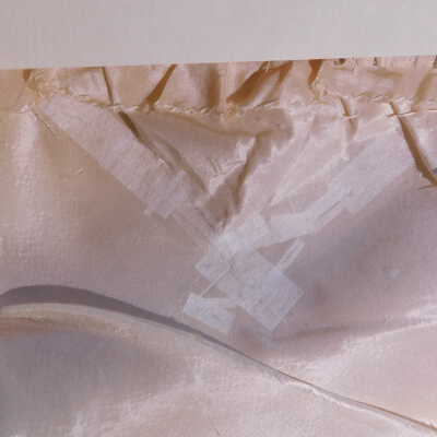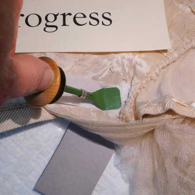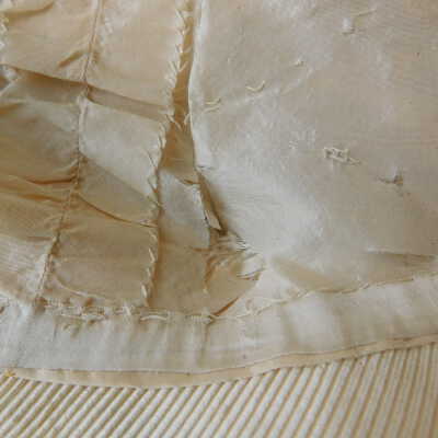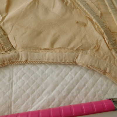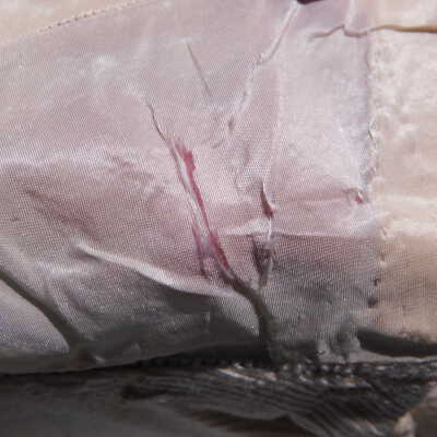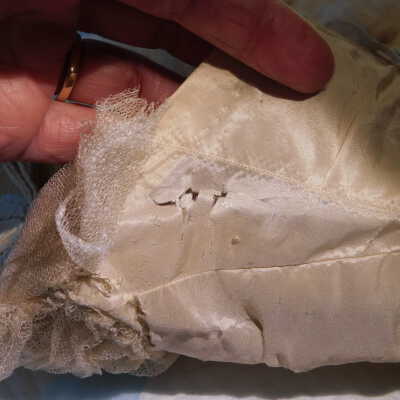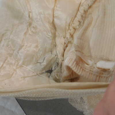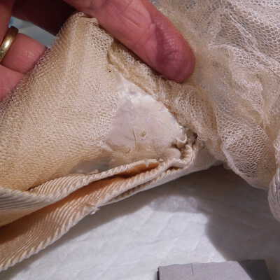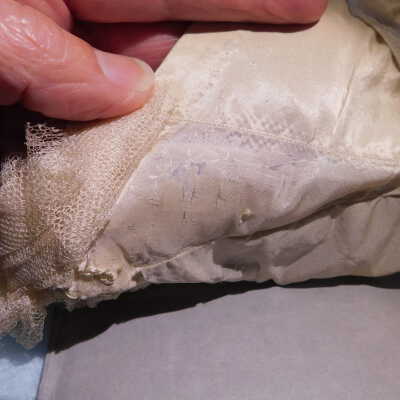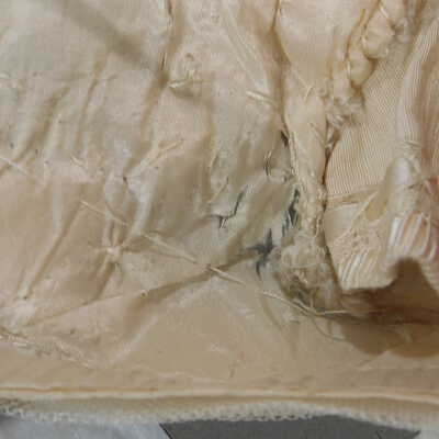 Stitched top of lining to bodice with invisible thread. Mended tears in silk lining. Tried Lascaux mending powder but would not adhere to silk. Tried BevaTex tissue with heat spatula set to medium heat, and this was effective. Repaired silk under left sleeve. Repaired other tears to silk lining with BevaTex.