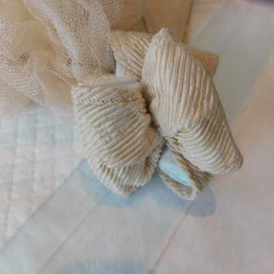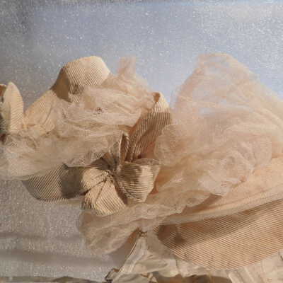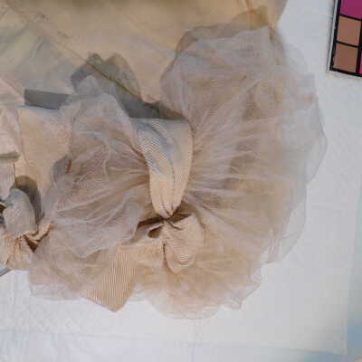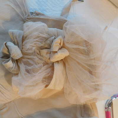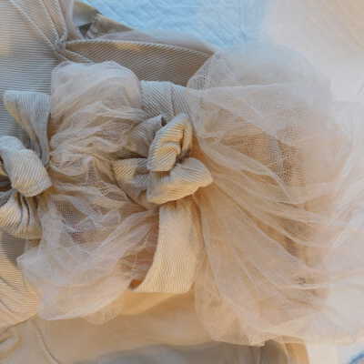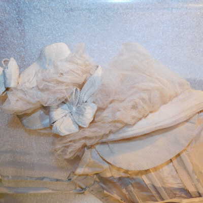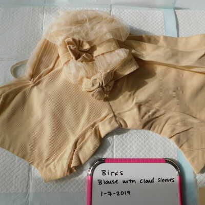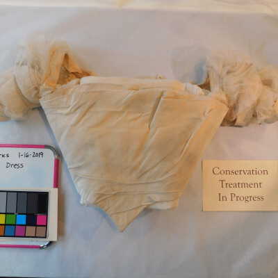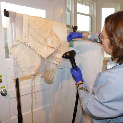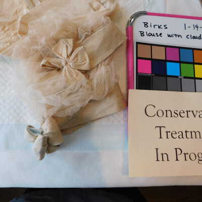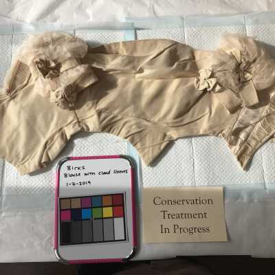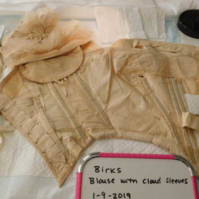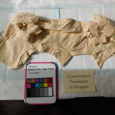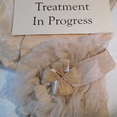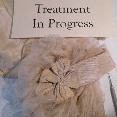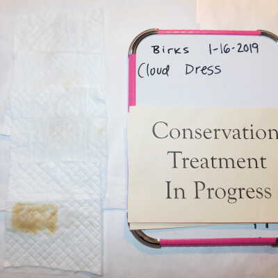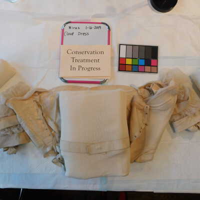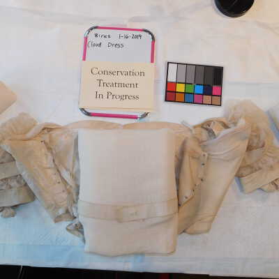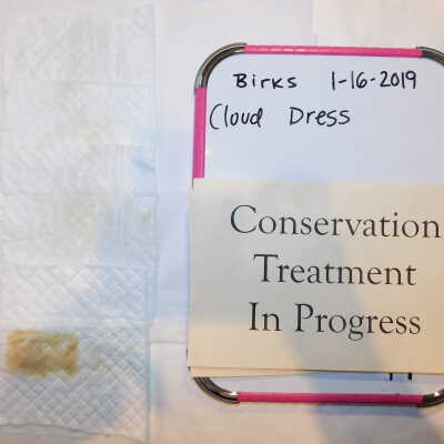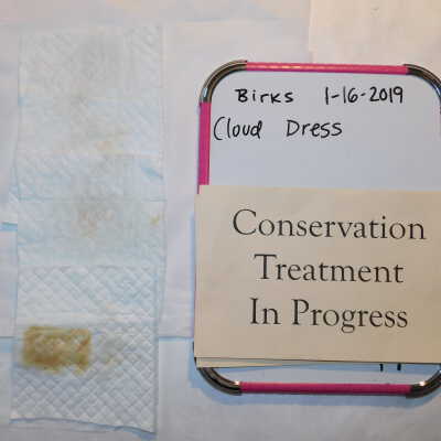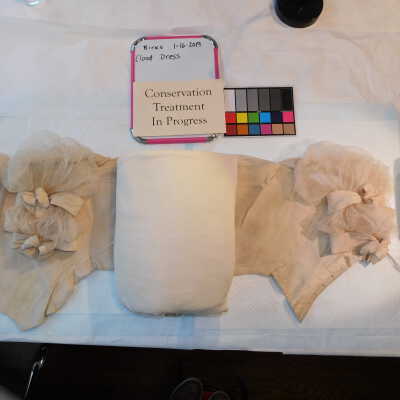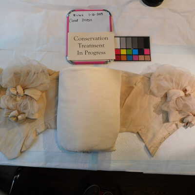 Cleaned inside of to layer, back of right sleeve, front of right sleeve, and bows. Cleaned left sleeve. Steamed wrinkles out of cloud sleeves with steamer (1:1 distilled H2O/isopropyl alcohol)Acute Treatment