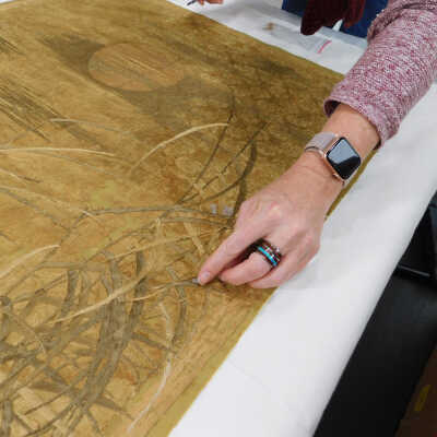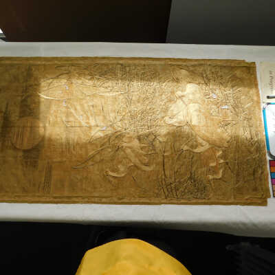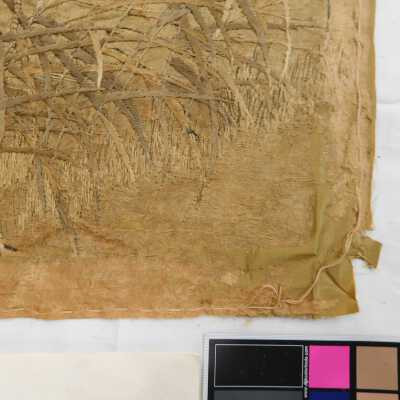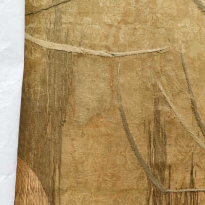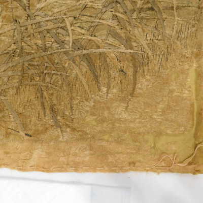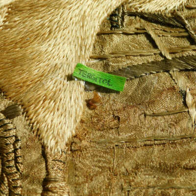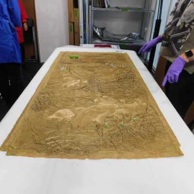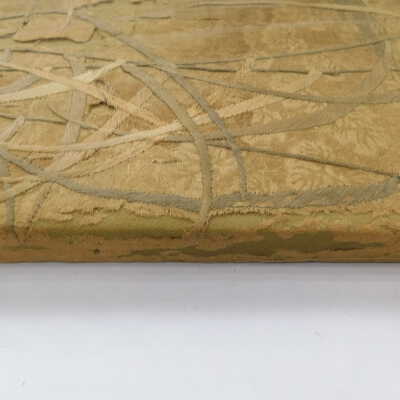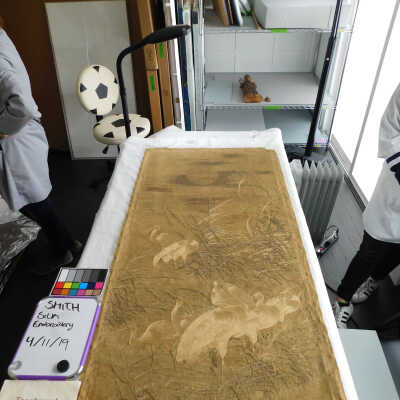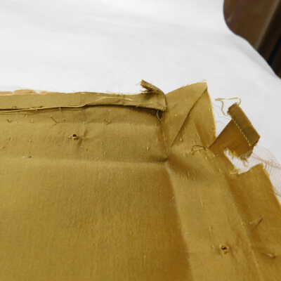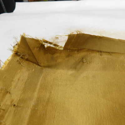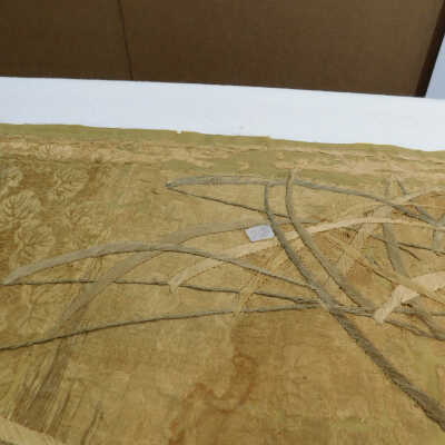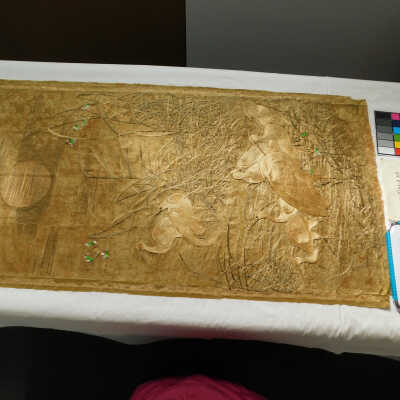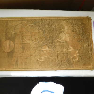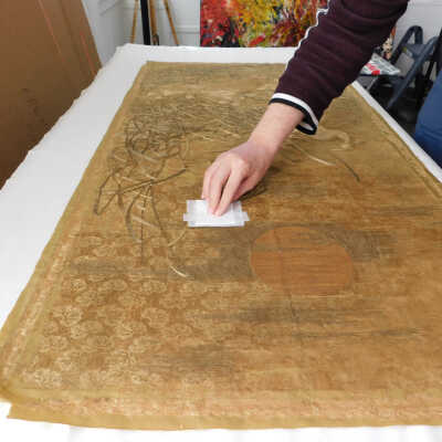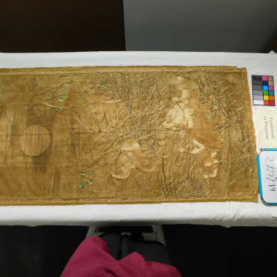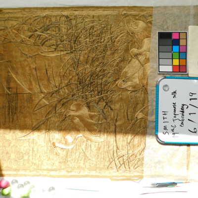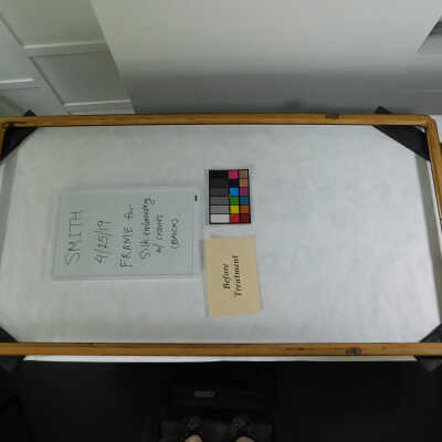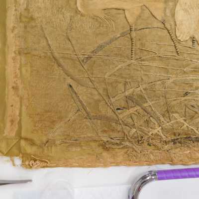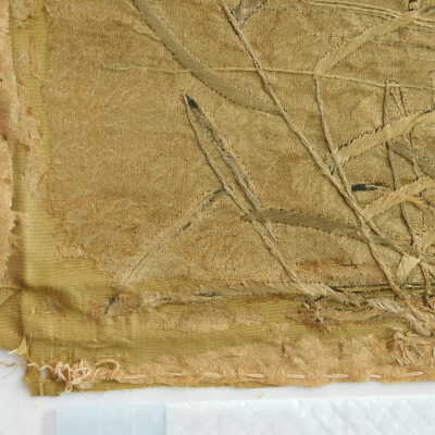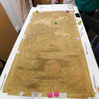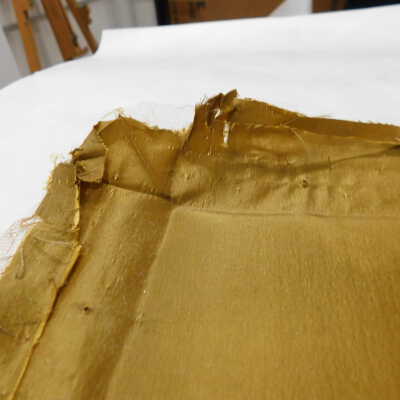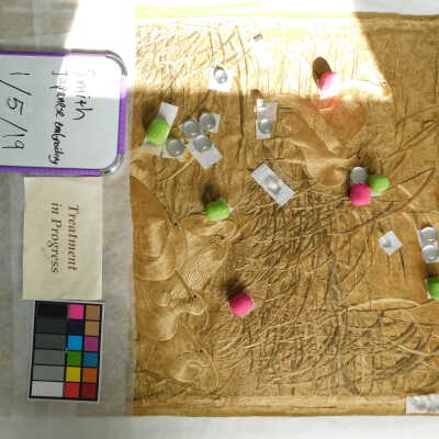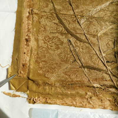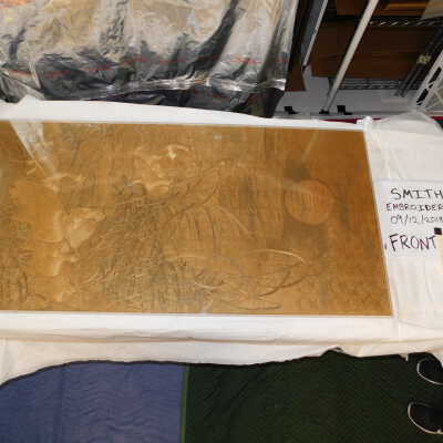 Turned embroidery onto front on table lined with two layers ethafoam and one layer tyvek, to facilitate removal from strainer. Running stitch holding lining and crepeline cut. Yellow silk lining cut in straight lines along stapled edge. Once revealed, a white synthetic batting fabric is visible between silk lining and strainer. This is stapled to the strainer so these areas cut around with scalpel also. To free corners, running stitch holding batting, lining, embroidery, and crepeline together cut, only in corners. Lining opened to allow removal of strainer.
