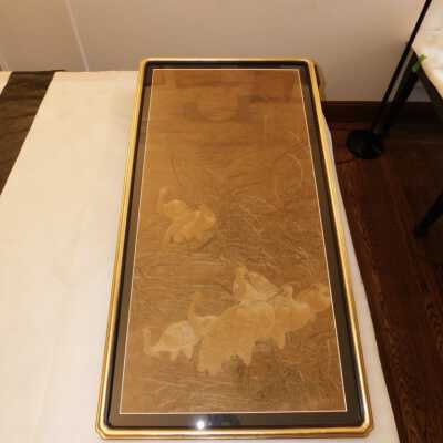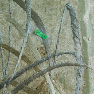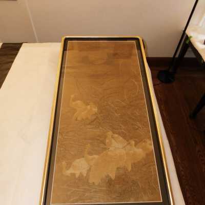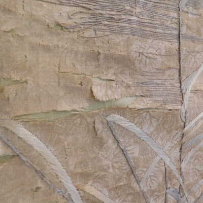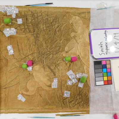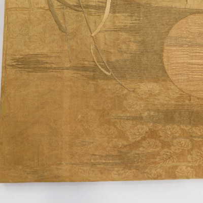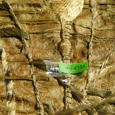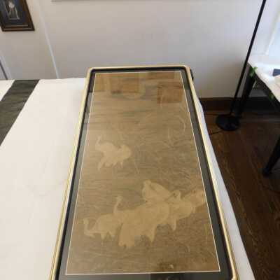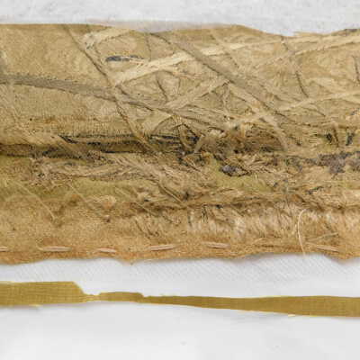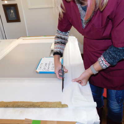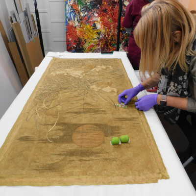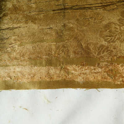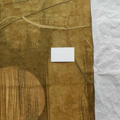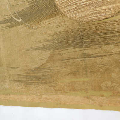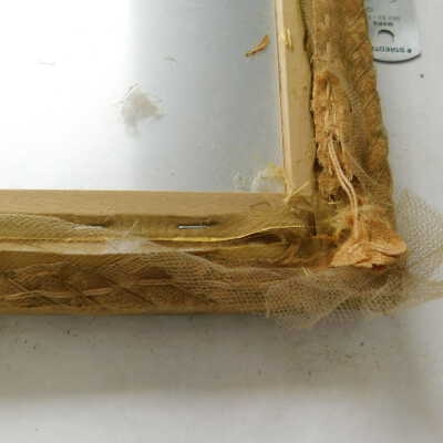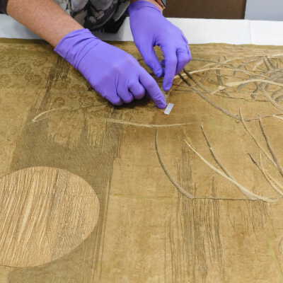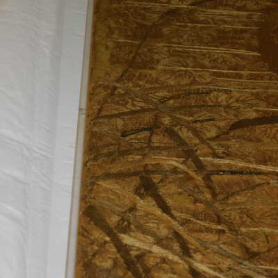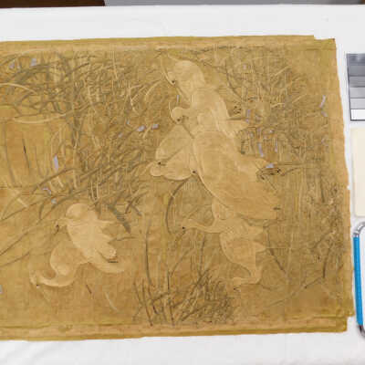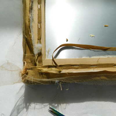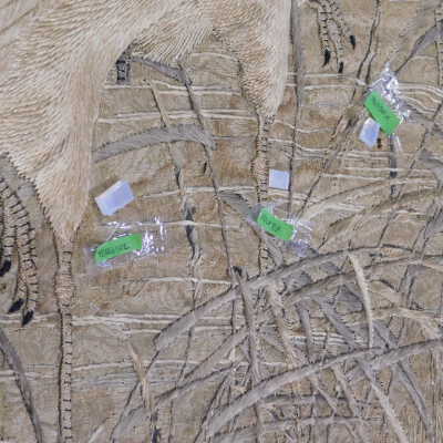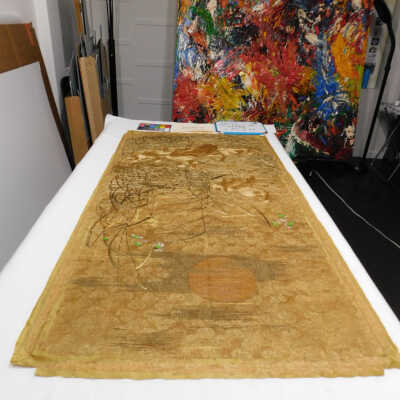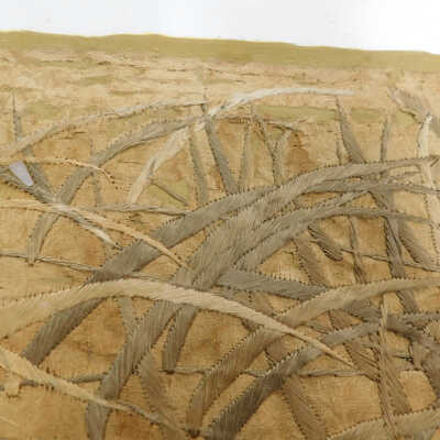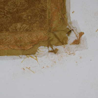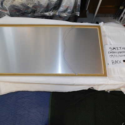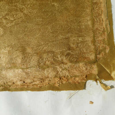 Turned embroidery onto front on table lined with two layers ethafoam and one layer tyvek, to facilitate removal from strainer. Running stitch holding lining and crepeline cut. Yellow silk lining cut in straight lines along stapled edge. Once revealed, a white synthetic batting fabric is visible between silk lining and strainer. This is stapled to the strainer so these areas cut around with scalpel also. To free corners, running stitch holding batting, lining, embroidery, and crepeline together cut, only in corners. Lining opened to allow removal of strainer.