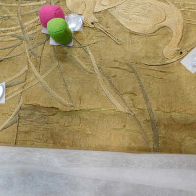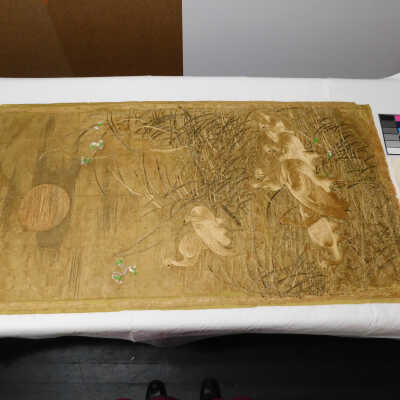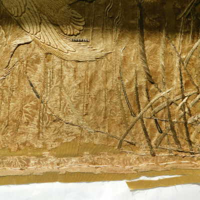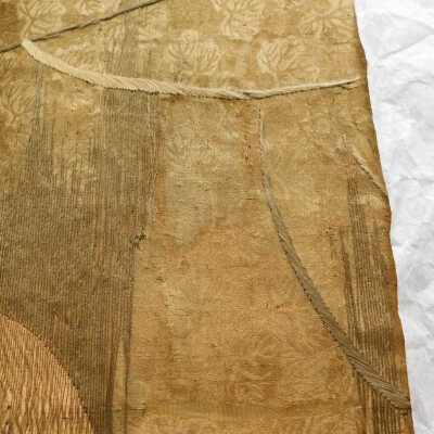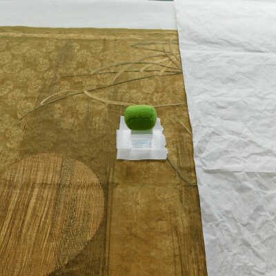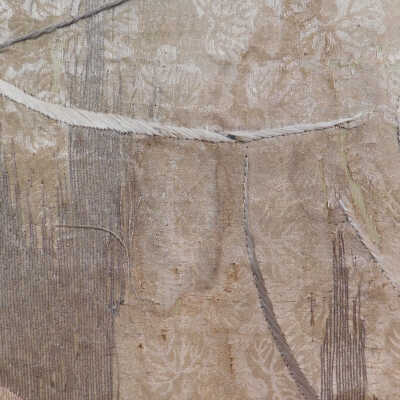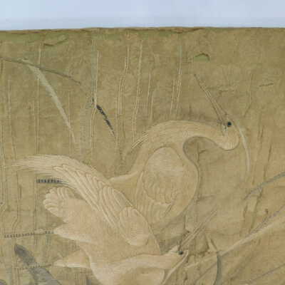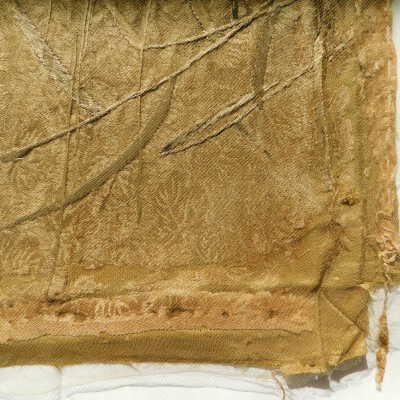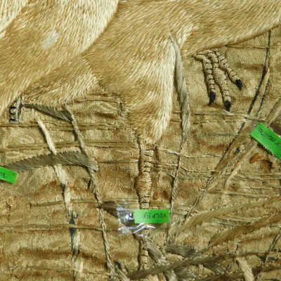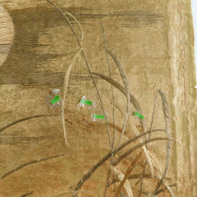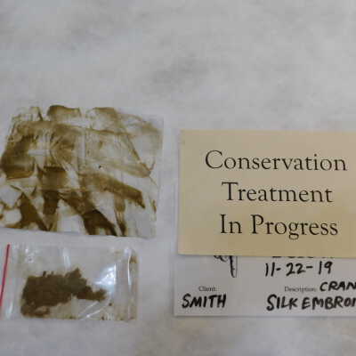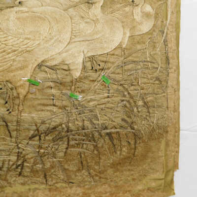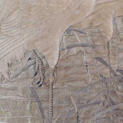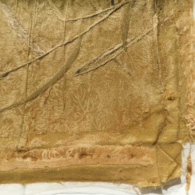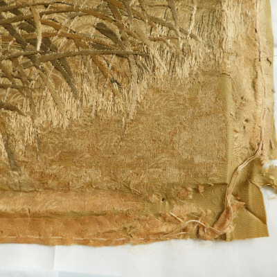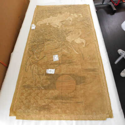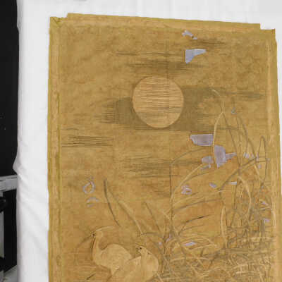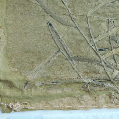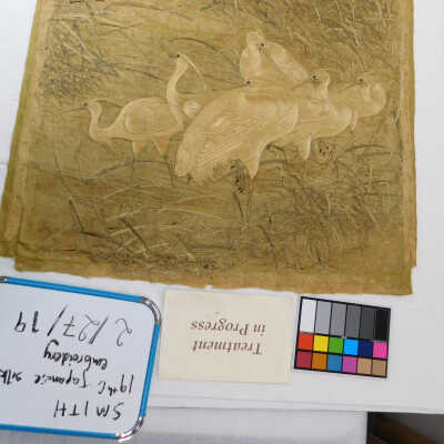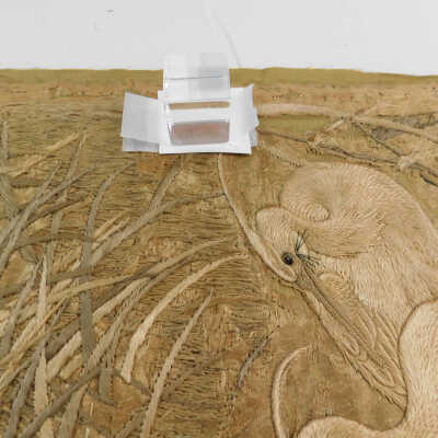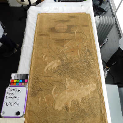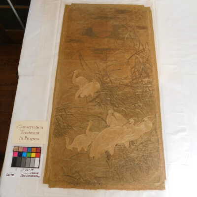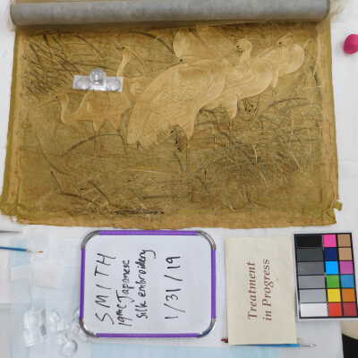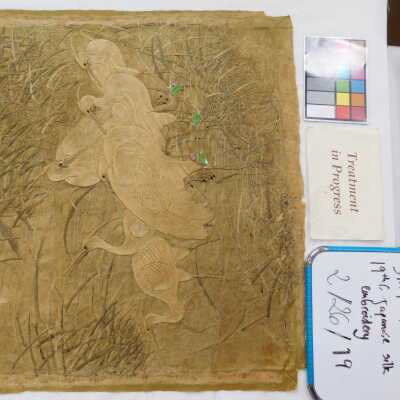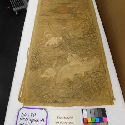 Stitched in backward-looping stitch through all layers: crepeline, textile, silk lining, and cotton muslin lining. Sewed down silk and crepeline to muslin cloth and sewed cranes (needle and thread breaking silk fibers). Decided to elevate textile above table to reduce stress. Used methylcellulose to consolidate background as well as spray fixative.Acute Treatment